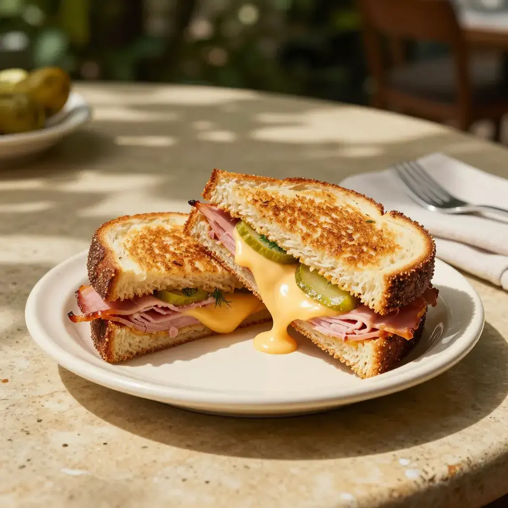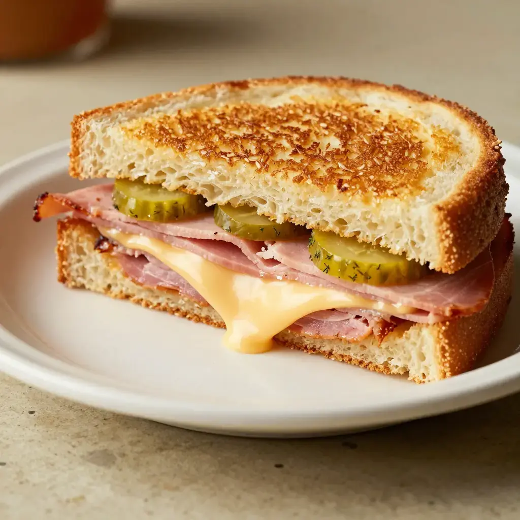 # Cuban Late-Night Sandwich (Medianoche) The medianoche — Spanish for midnight — is the after-hours cousin of the Cuban sandwich, born in the social clubs and cabarets of 1950s Havana where night-shift workers and dancers needed something substantial after a long shift. Where the Cuban (cubano) uses crispy Cuban bread, the medianoche is built on a soft, slightly sweet egg-enriched roll called pan de media noche, which soaks up the mustard and mojo drippings without going soggy and presses to a dense, yielding richness under the plancha. The combination of slow-roasted pork (lechón), glazed ham, Swiss cheese, and dill pickles is non-negotiable; the mustard is yellow, not Dijon. Miami's Cuban exile community kept this sandwich alive and largely unchanged for seventy years. Serves: 2 ## Ingredients **For the mojo-marinated pork (can be made a day ahead):** - 400 g (14 oz) pork shoulder, trimmed - 4 garlic cloves, minced - 60 ml (¼ cup) sour orange juice (or 3 tbsp orange juice + 1 tbsp lime juice) - 1 tsp ground cumin - 1 tsp dried oregano - ½ tsp salt - 2 tbsp olive oil **For assembly:** - 2 medianoche rolls (or soft brioche rolls), halved - 4 tbsp yellow American mustard - 4 slices glazed ham (about 80 g / 3 oz total) - 4 slices Swiss cheese - 8–10 dill pickle slices - 30 g (2 tbsp) unsalted butter, softened ## Instructions 1. Marinate the pork: combine garlic, sour orange juice, cumin, oregano, salt, and olive oil in a zip-lock bag or bowl. Add pork, coat thoroughly, and marinate at least 4 hours, ideally overnight in the refrigerator. 2. Preheat oven to 160°C (325°F). Place pork with marinade in a small roasting dish, cover tightly with foil, and roast 2 hours until very tender. Cool slightly, then slice thinly or pull apart into shreds. 3. Build the sandwich: spread mustard generously on both cut faces of each roll. On the bottom half, layer Swiss cheese, ham, roasted pork, pickles, and another layer of Swiss cheese. 4. Close the sandwich and press it firmly to compress. Spread butter on both the top and bottom outer surfaces. 5. Heat a cast-iron skillet or sandwich press over medium heat. Place the sandwiches in the pan and press firmly with a heavy pan or wrapped brick. Cook 3–4 minutes per side until the bread is deep golden and glossy and the cheese has fully melted. 6. Cut diagonally and serve immediately — the medianoche waits for nobody. **Cook's Notes:** The double layer of Swiss cheese (above and below the fillings) is the classic Cuban technique — it acts as a glue that holds everything together when pressed. Sour orange (naranja agria) is available in Latin American grocery stores; it is sharper and more aromatic than regular orange and genuinely changes the pork's character. Leftover mojo pork is excellent over rice with black beans.Images