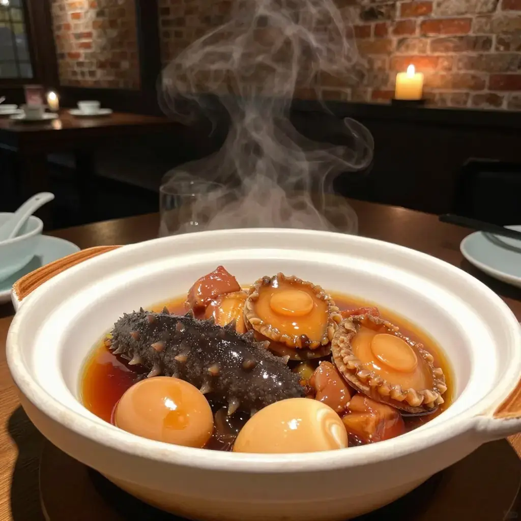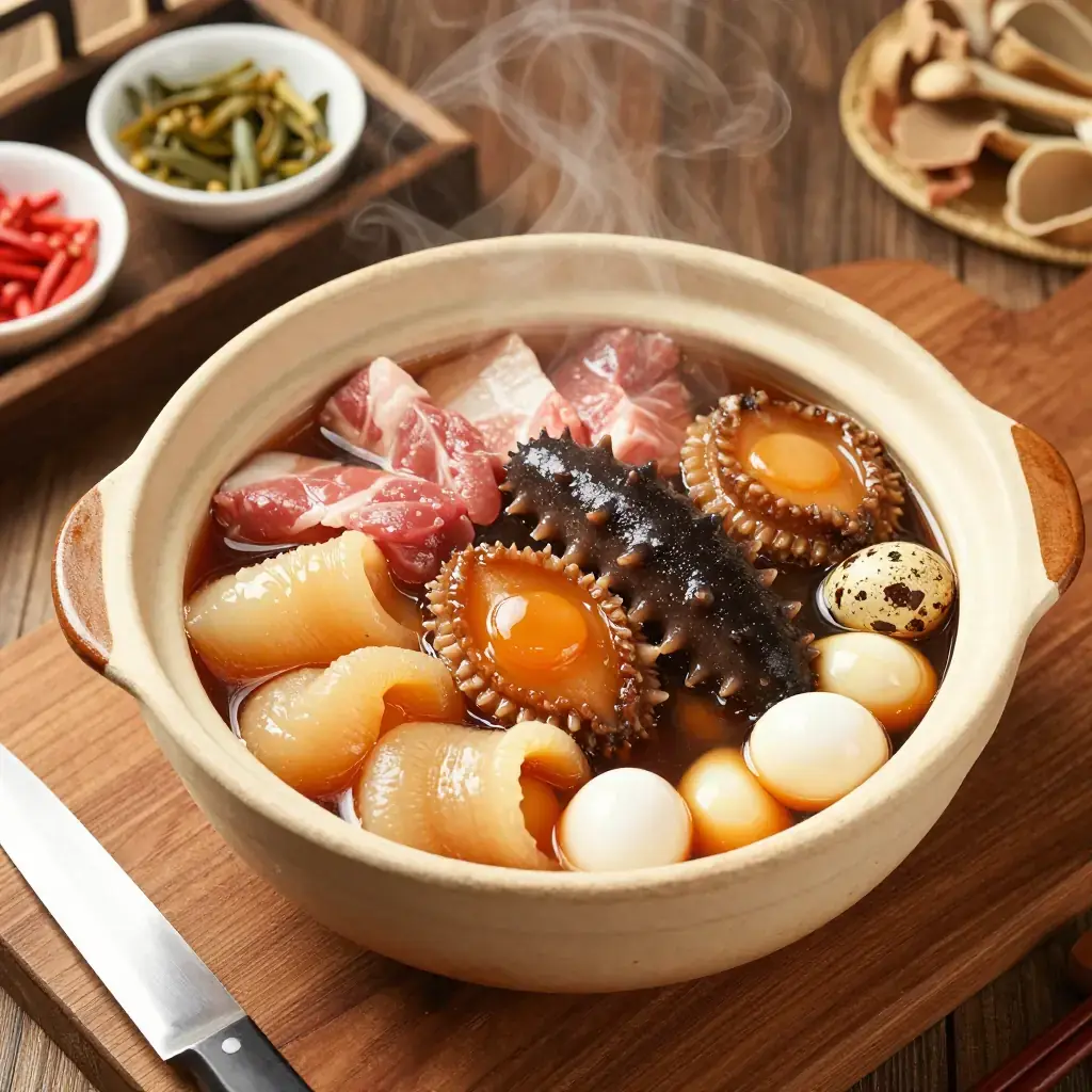 Fo Tiao Qiang — "Buddha Jumps Over the Wall" — is Fujian's most storied banquet dish, named for the legend that its aroma was so irresistible it would tempt even a meditating monk to leap over a monastery wall. A Fuzhounese creation dating to the Qing dynasty, it is a long-braised pot combining abalone, sea cucumber, fish maw, pork knuckle, quail eggs, bamboo shoots, and shiitake mushrooms in a rich Shaoxing wine broth. This version is a home-scale adaptation that preserves the spirit of the dish.