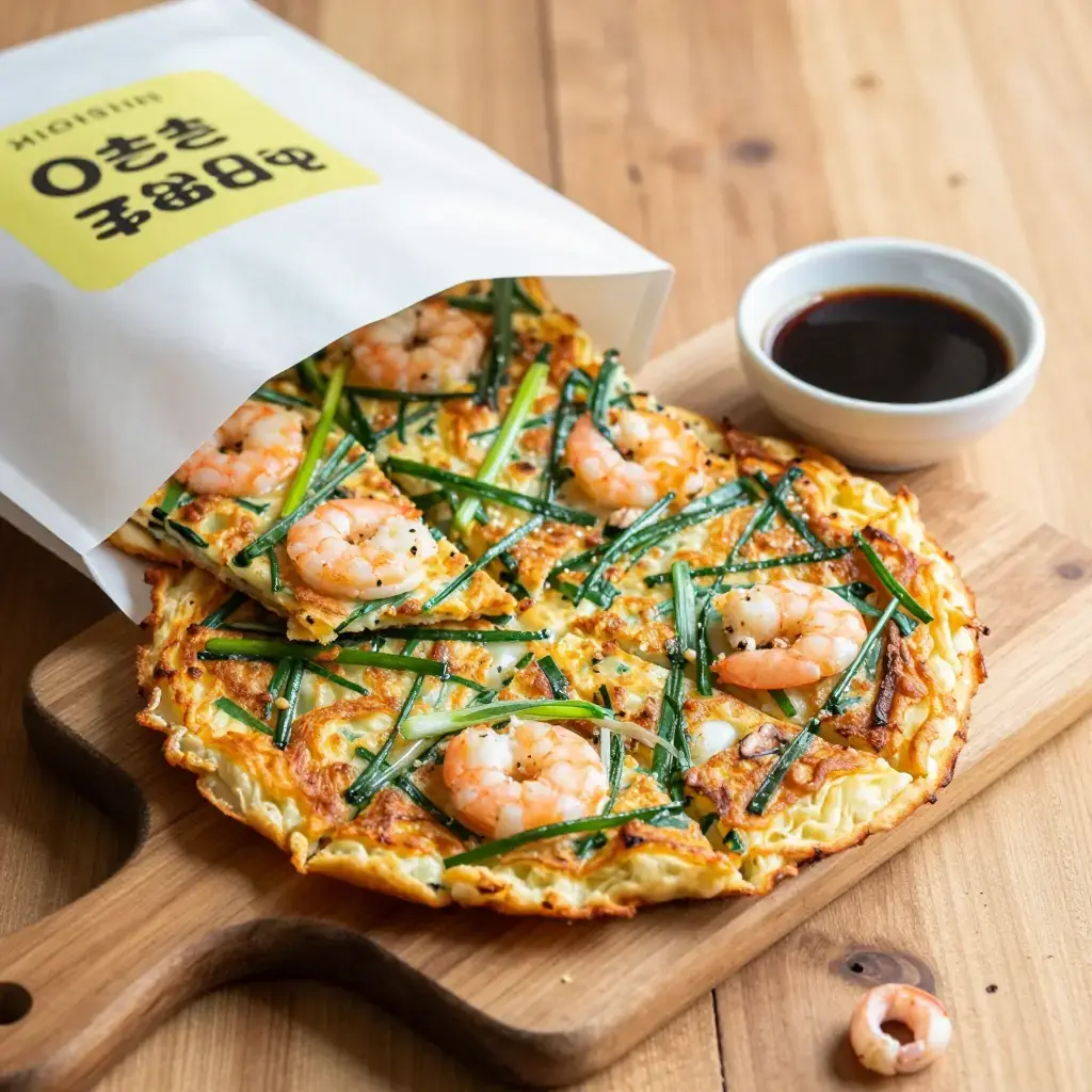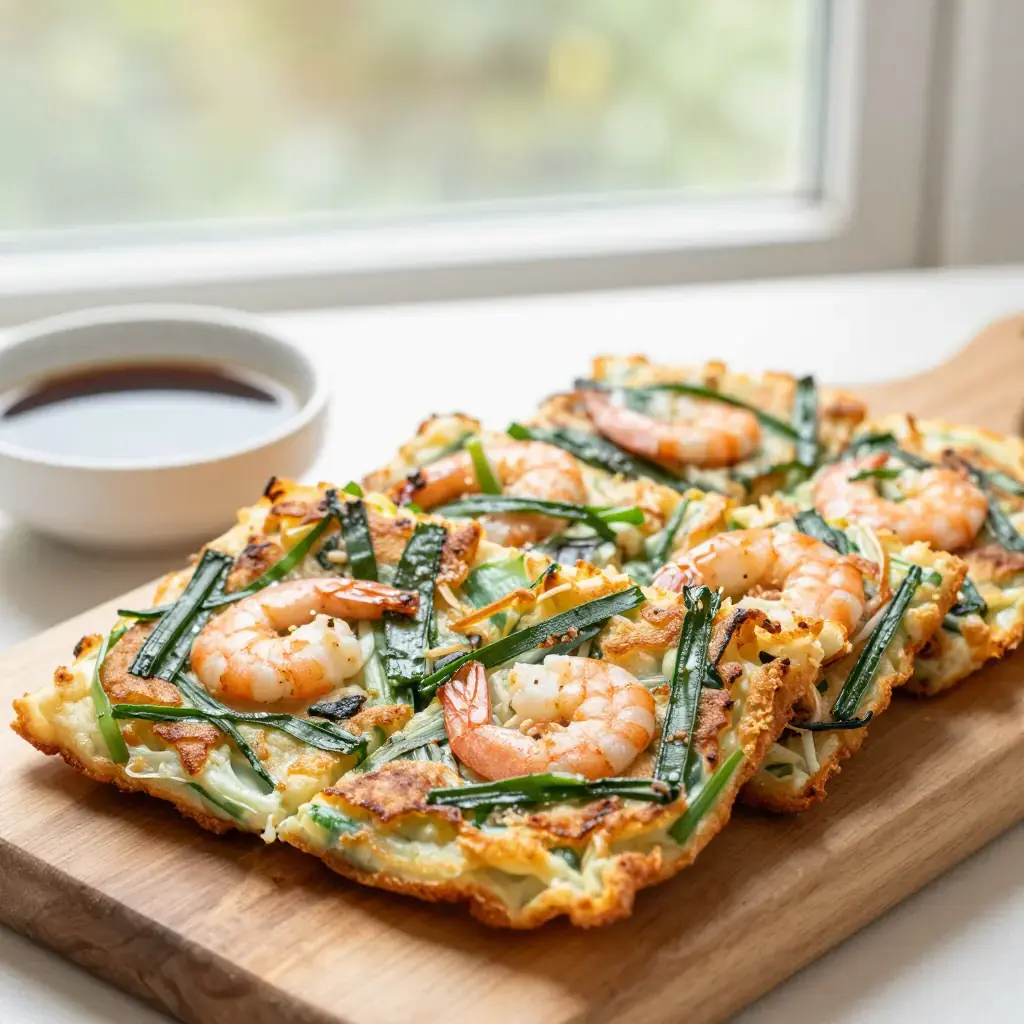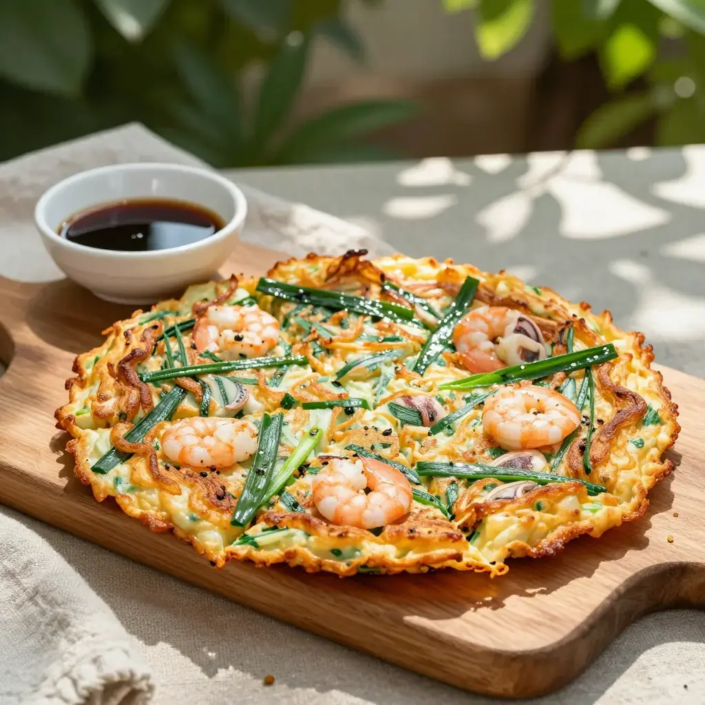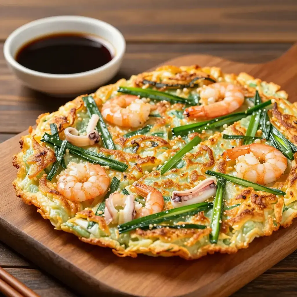 # Haemul Pajeon Haemul pajeon is Korea's iconic savory seafood and scallion pancake, beloved as a late-night snack and rainy-day comfort food. There is a Korean saying that the sound of rain on a tin roof calls for pajeon and makgeolli (rice wine) — the sizzle of batter in a hot pan mimics the patter of raindrops. Street vendors and pojangmacha (tent bars) across Seoul serve these crispy, eggy rounds well past midnight. Serves: 4 ## Ingredients - 200g (7 oz) mixed seafood (squid, shrimp, clams), cleaned and roughly chopped - 1 bunch green onions (about 10 stalks), trimmed to pan length - 150g (1 cup) all-purpose flour - 50g (1/3 cup) rice flour - 1 egg - 240ml (1 cup) ice-cold water - 1 tsp salt - 3 tbsp neutral oil (vegetable or grapeseed) - **Dipping sauce:** 3 tbsp soy sauce, 1 tbsp rice vinegar, 1 tsp sesame oil, 1 tsp gochugaru, 1 tsp toasted sesame seeds ## Instructions 1. Whisk together flour, rice flour, egg, ice-cold water, and salt into a thin batter. Do not overmix — lumps are fine. Rest 10 minutes. 2. Mix dipping sauce ingredients in a small bowl and set aside. 3. Heat 2 tbsp oil in a 30cm (12-inch) non-stick or cast iron skillet over high heat until shimmering. 4. Arrange green onions in a single layer across the pan. Scatter seafood evenly over them. 5. Pour half the batter over the top, spreading to cover. Cook 4–5 minutes until edges are set and golden. 6. Flip carefully using a large spatula, add remaining oil, and press down firmly. Cook another 4–5 minutes until deeply golden and crispy. 7. Cut into pieces and serve immediately with dipping sauce. **Cook's Notes:** Ice-cold water is the key to a crispy, light pancake. Adding rice flour boosts crunch. Press firmly after flipping — contact with the pan creates the signature crackling crust.Images
