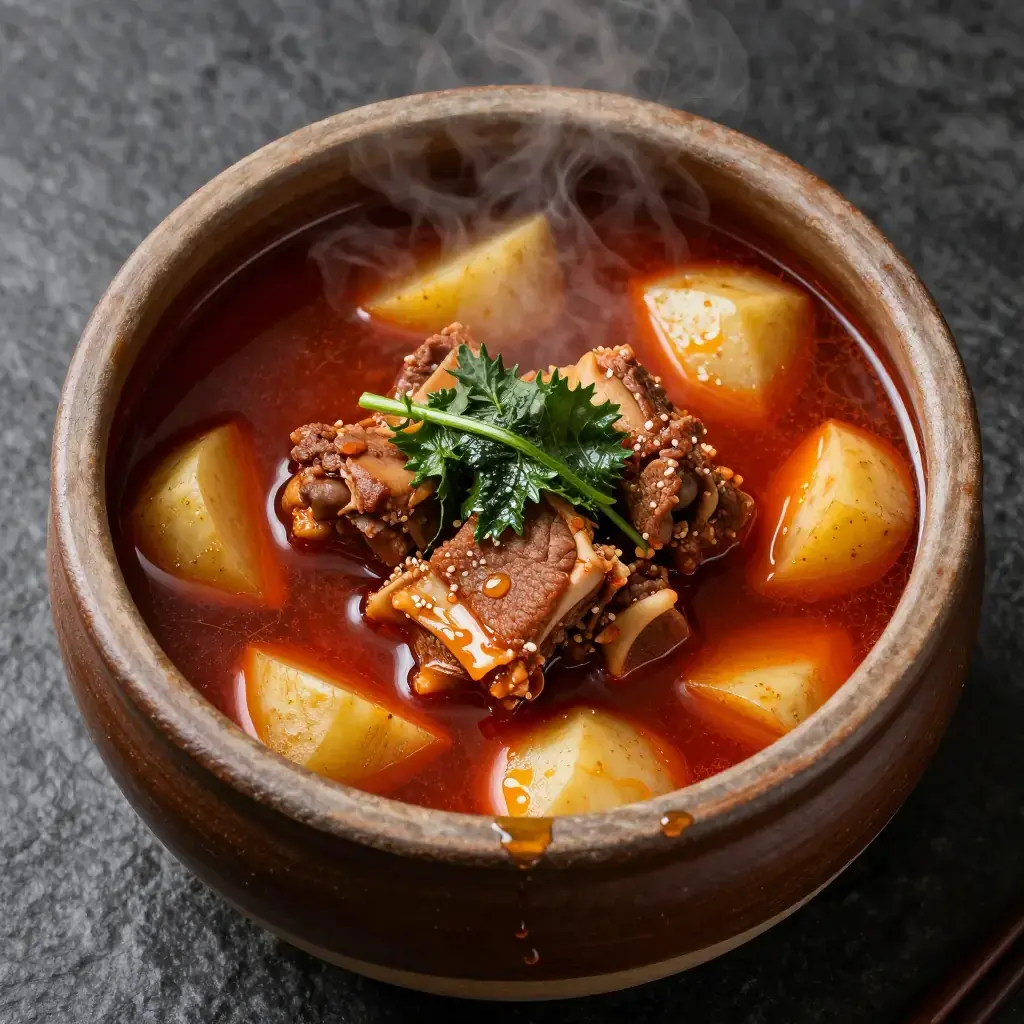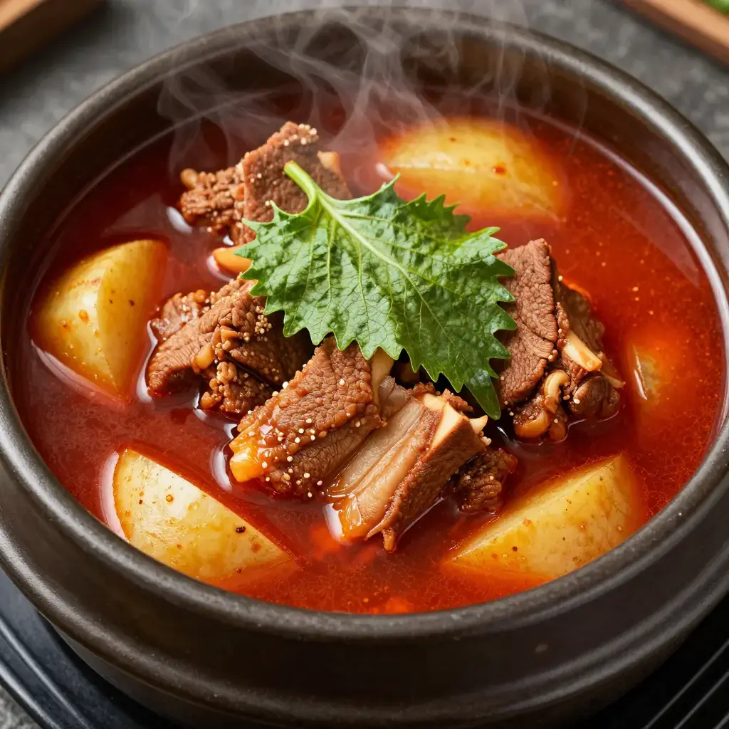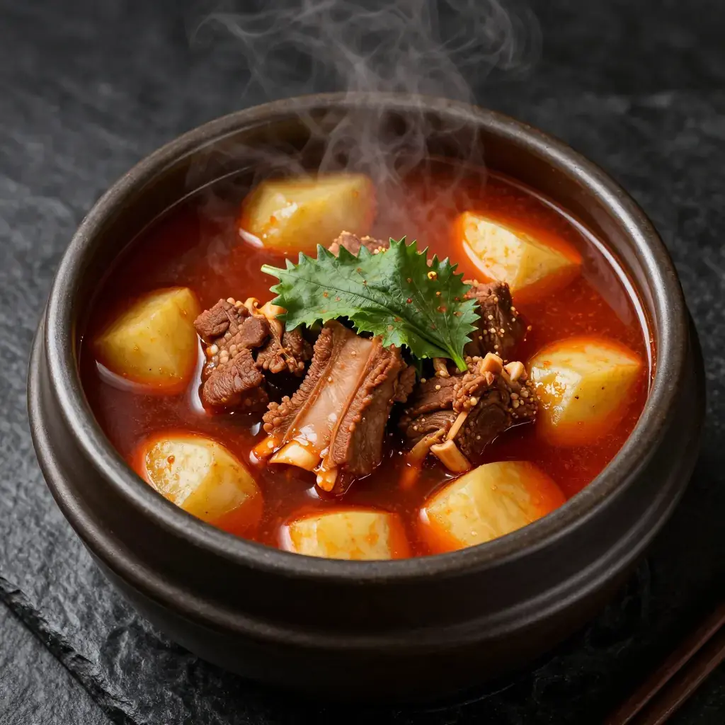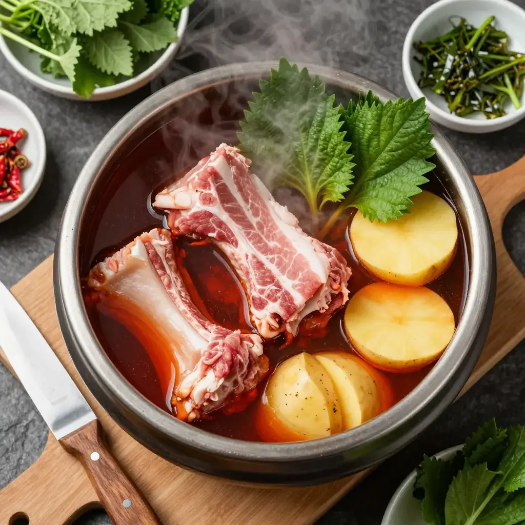 Cook's Notes: The double blanching step is essential — don't skip it. Perilla leaves add a distinctive herbal note that sets gamjatang apart from other Korean pork stews. Leftovers improve significantly the next day.