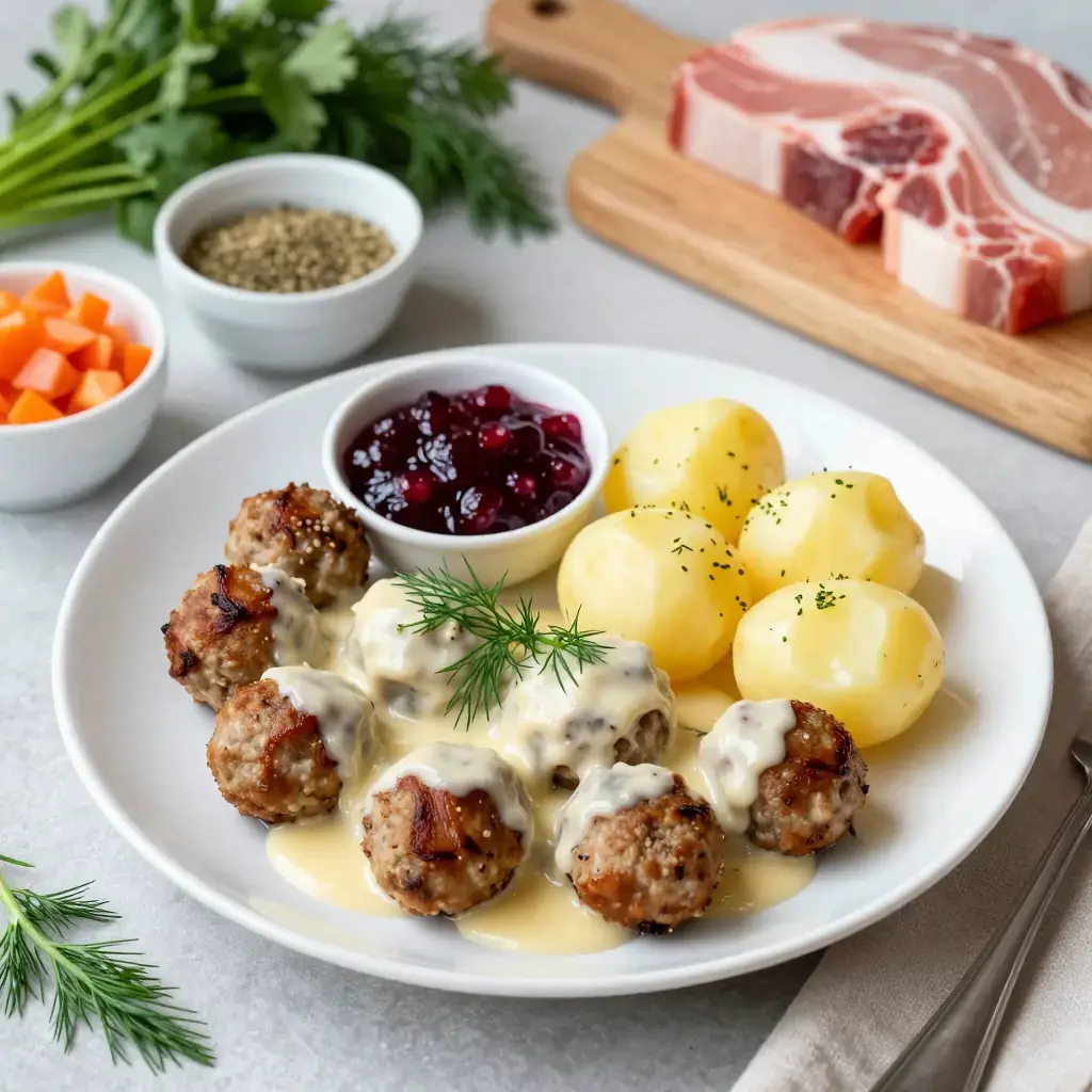Cook's Notes: The touch of allspice and nutmeg is what makes these distinctly Swedish rather than generic. Grating the onion rather than dicing it keeps the texture smooth. Do not skip the lingonberry — the tartness is essential to balance the cream sauce.