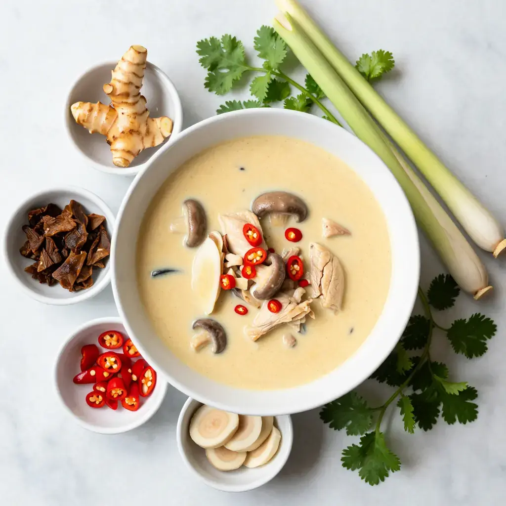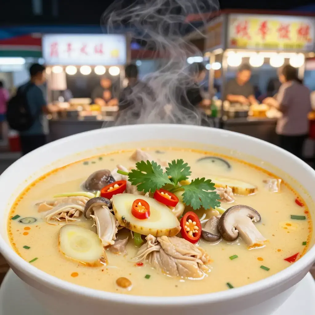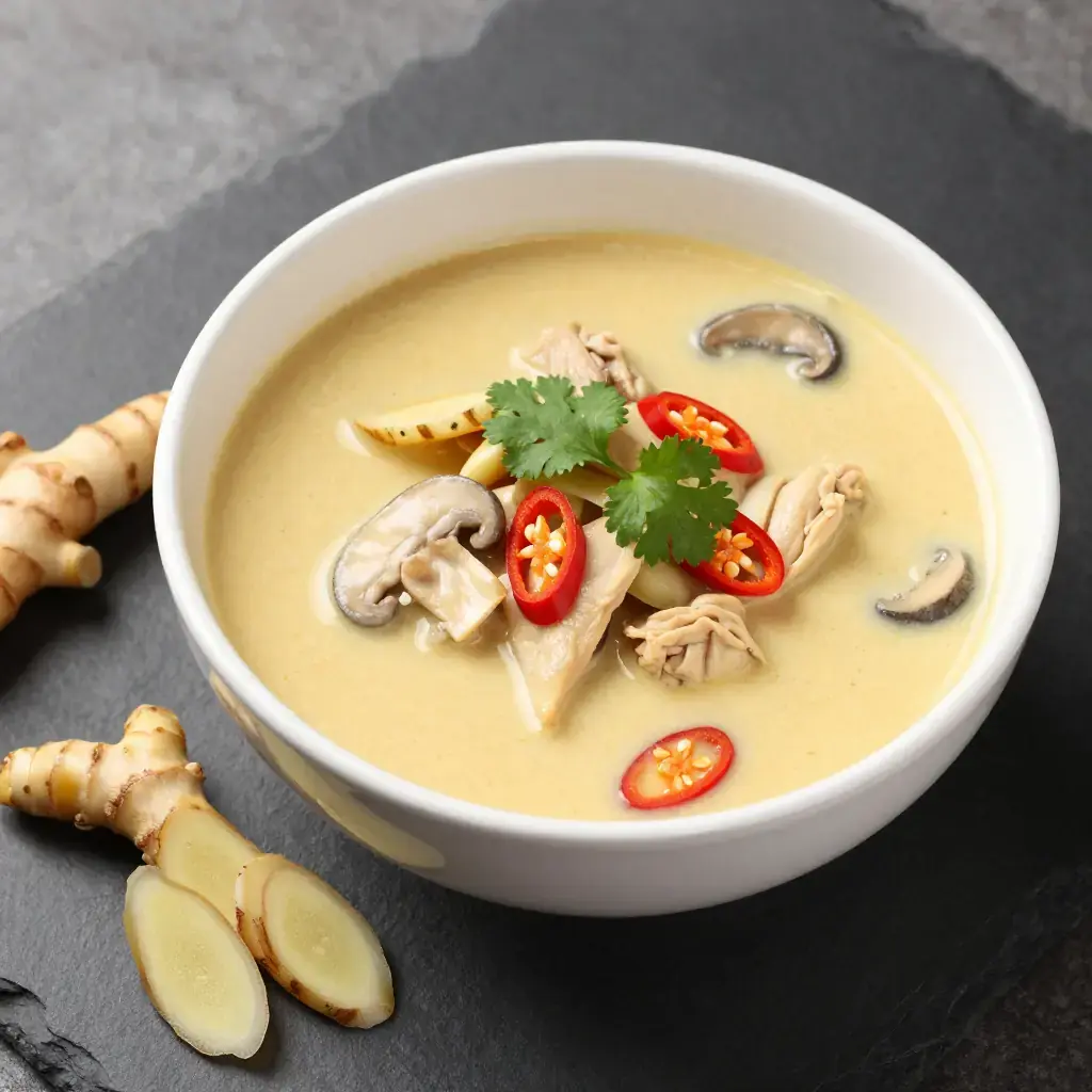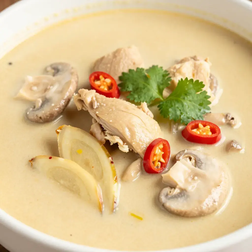 Tom kha gai — galangal chicken soup — is one of Thailand's most beloved one-pot meals, a fragrant coconut broth infused with galangal, lemongrass, kaffir lime leaves, and the mild heat of bird's-eye chillies. Unlike its fiercer cousin tom yum, tom kha is softened by coconut milk into something simultaneously rich, sour, herbal, and deeply soothing. It is eaten any time of day, from breakfast noodle stalls to evening restaurant menus.