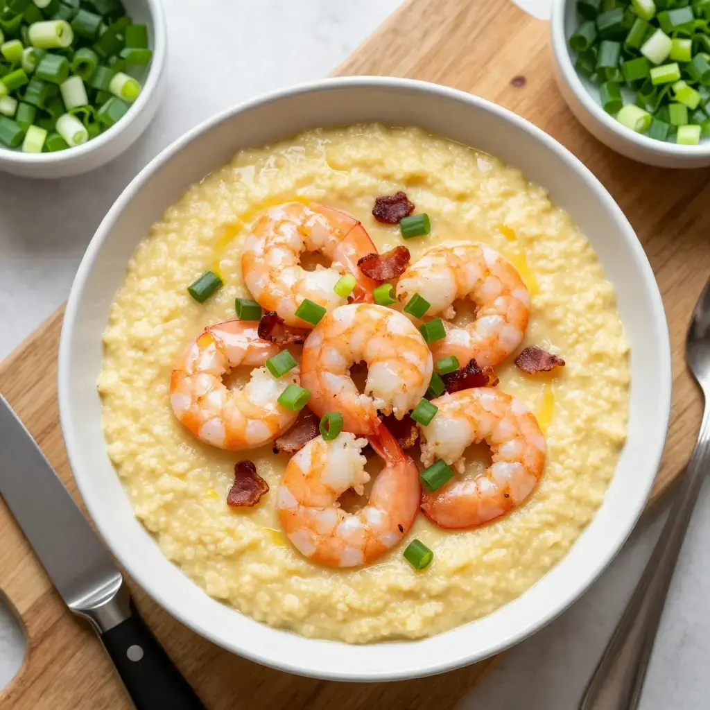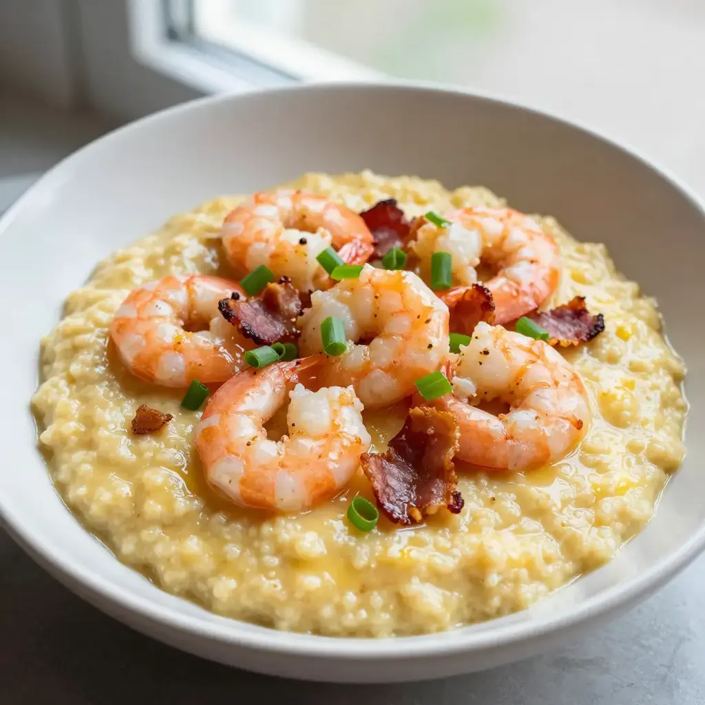 - Spoon grits into bowls, top with shrimp and any pan juices. Scatter bacon and spring onions over everything.