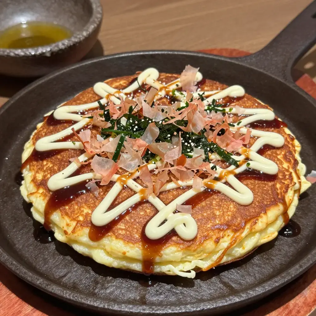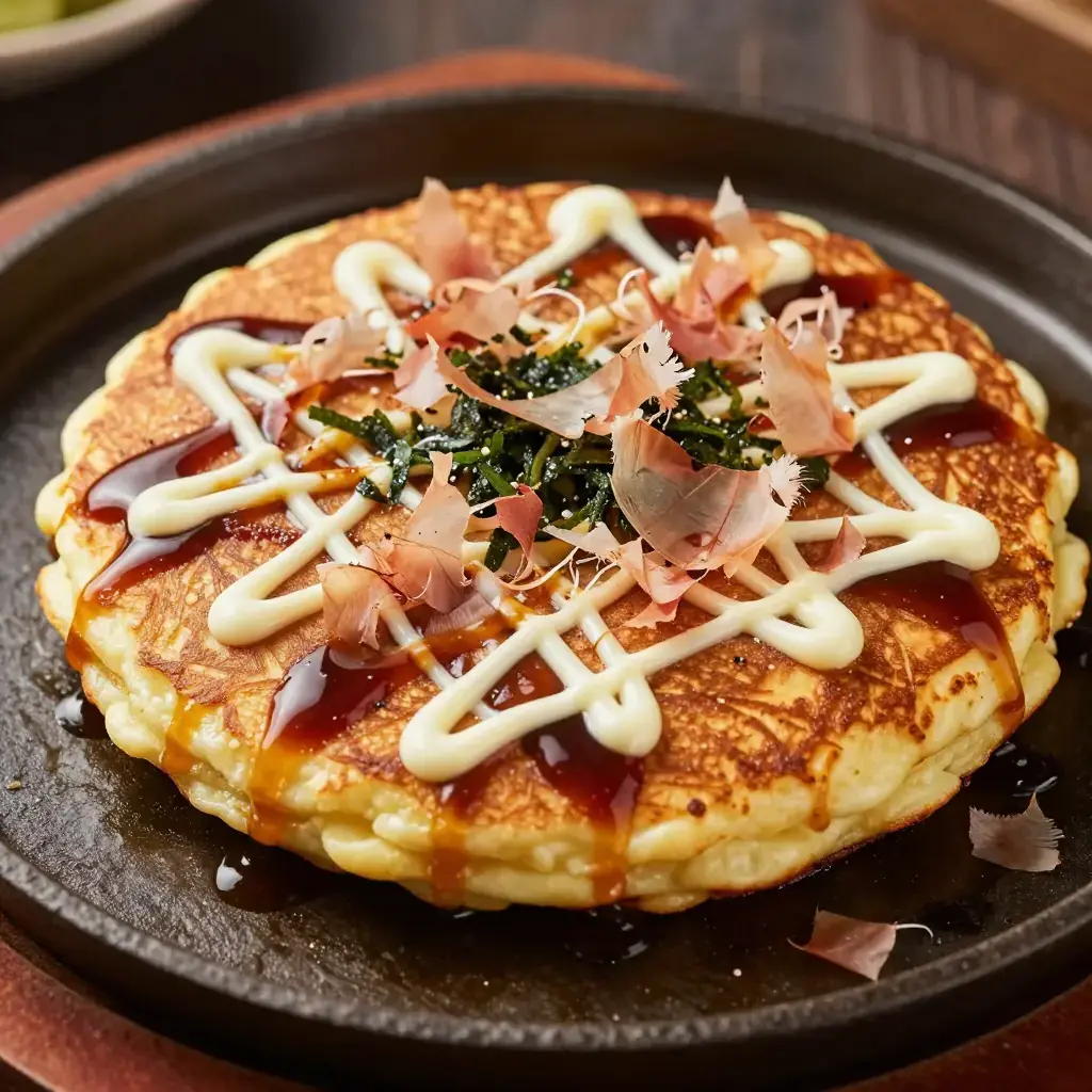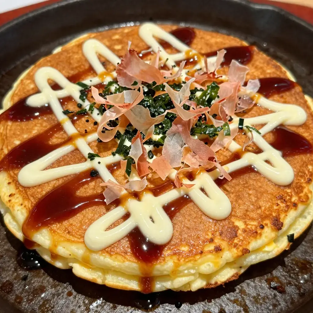 Okonomiyaki translates literally as "grilled as you like it" — a name that captures the free-form, improvisational spirit of this Osaka street food. Equal parts savory pancake and social occasion, okonomiyaki is cooked on iron griddles (teppan) at restaurant tables where diners cook their own. The Osaka version folds everything into the batter together, while the Hiroshima version layers ingredients with noodles. Both are covered in a rich brown okonomiyaki sauce, Japanese mayonnaise, bonito flakes that wave in the heat, and dried green aonori seaweed. It is the definitive Japanese late-night comfort food.