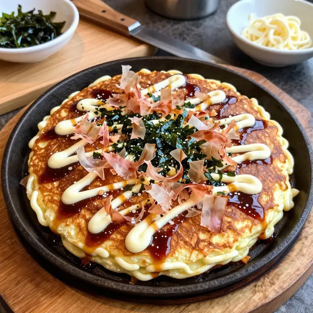 Cook's Notes: Grating a small amount of nagaimo (Japanese mountain yam) into the batter creates an exceptionally light, fluffy texture — add about 60g (2 oz) if available. The flip is the trickiest part; use a wide spatula and be decisive. Leftover okonomiyaki reheats well in a dry pan.