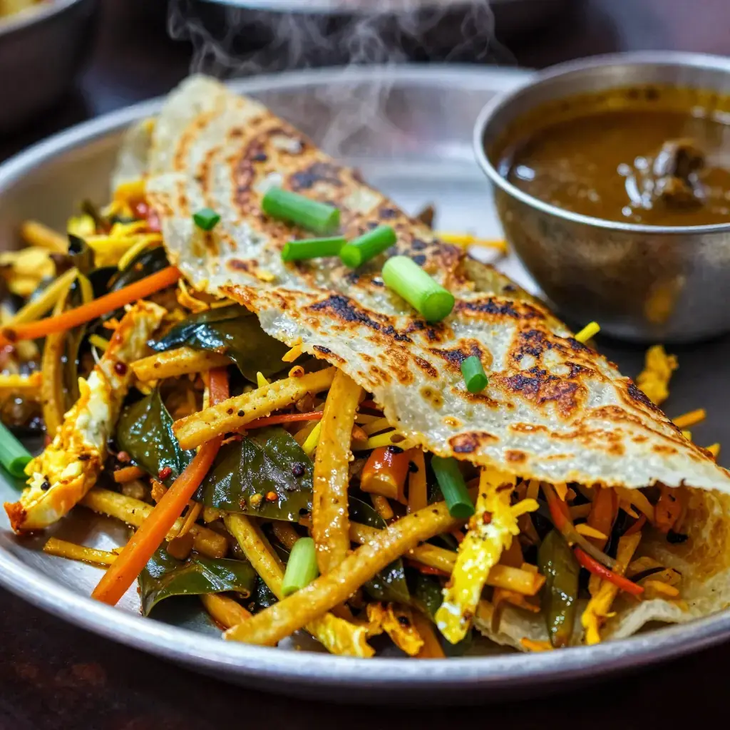 Cook's Notes: The highest heat you can achieve is essential — kottu must fry, not steam. A well-seasoned cast-iron griddle replicates the kade experience best. The dish is highly adaptable: add grated cheese for a "cheese kottu," a Sri Lankan innovation that has developed a devoted following.