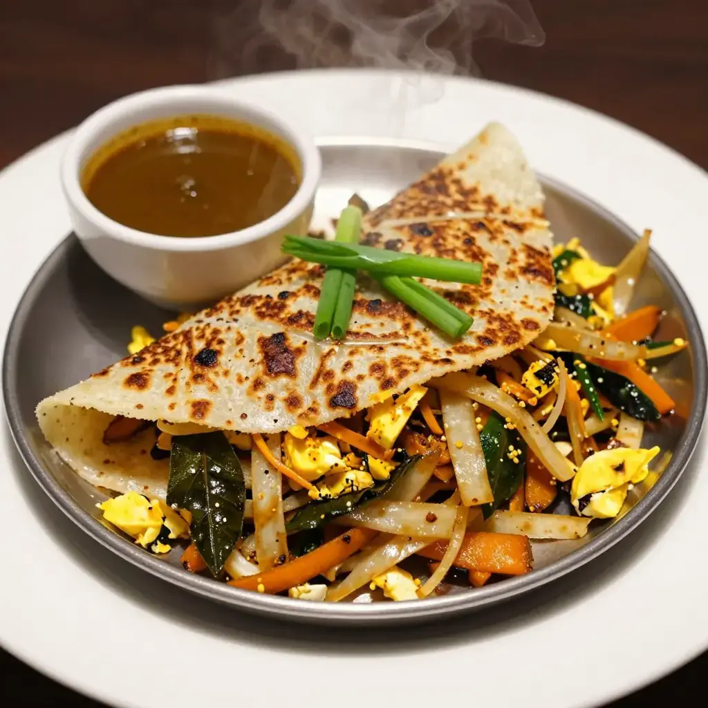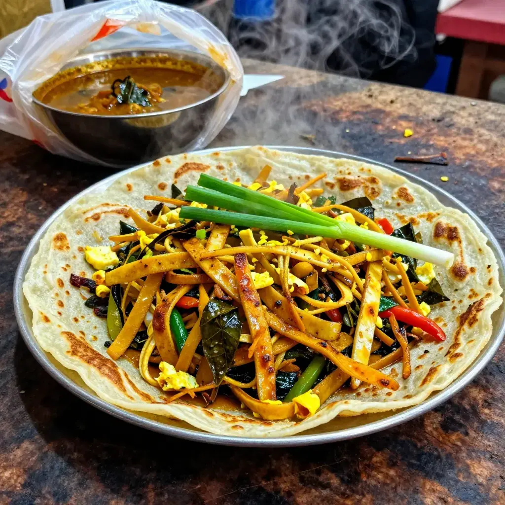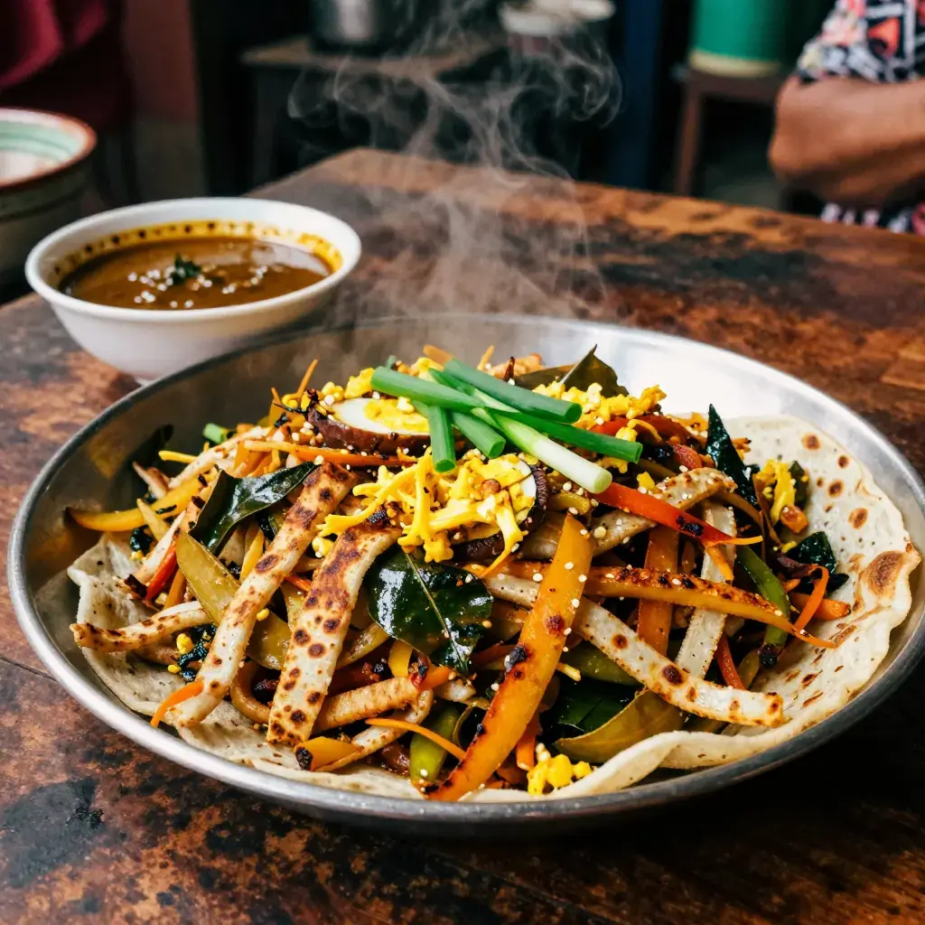 # Kottu Roti The sound of kottu roti is as distinctive as its flavor — the rhythmic, percussive clang of two metal blades chopping and tossing shredded flatbread on a hot iron griddle echoes through every Sri Lankan town after dark. Kottu means "chopped" in Tamil, and the dish is made by hacking day-old godhamba roti (a Sri Lankan paratha-like flatbread) into thin strips and stir-frying them furiously with egg, vegetables, curry leaves, and leftover curry gravy. It is the preeminent Sri Lankan late-night street food, sold by roadside kade stalls from 9pm onward. Serves: 4 ## Ingredients - 4 large godhamba roti or paratha flatbreads (about 400g / 14 oz total), torn into strips - 3 tbsp vegetable oil - 1 large onion, thinly sliced - 3 cloves garlic, minced - 2cm (1-inch) piece ginger, minced - 2 sprigs curry leaves (about 20 leaves) - 2 green chilies, thinly sliced - 1 tsp Sri Lankan curry powder - 1/2 tsp turmeric - 3 eggs, lightly beaten - 200g (7 oz) chicken, beef, or vegetables (pre-cooked) - 125ml (1/2 cup) curry gravy or chicken stock - 2 spring onions, sliced - Salt to taste ## Instructions 1. Tear the roti into roughly 3cm (1-inch) irregular strips. Set aside. 2. Heat oil in a large wok or flat griddle over very high heat until smoking. Add the onion and stir-fry for 2-3 minutes until softened and beginning to char at the edges. 3. Add garlic, ginger, curry leaves, and green chili, tossing constantly for 1 minute. 4. Add the curry powder and turmeric, cook for 30 seconds, then add the pre-cooked meat or vegetables and toss to combine. 5. Push everything to the side and pour in the beaten eggs. Scramble briefly, then fold into the rest of the mixture. 6. Add the roti strips and pour over the curry gravy or stock. Using two spatulas or metal implements, chop and toss the mixture vigorously for 3-4 minutes until everything is integrated, slightly crispy, and fragrant. Adjust seasoning. 7. Scatter with spring onions and serve straight from the pan. **Cook's Notes:** The highest heat you can achieve is essential — kottu must fry, not steam. A well-seasoned cast-iron griddle replicates the kade experience best. The dish is highly adaptable: add grated cheese for a "cheese kottu," a Sri Lankan innovation that has developed a devoted following.Images