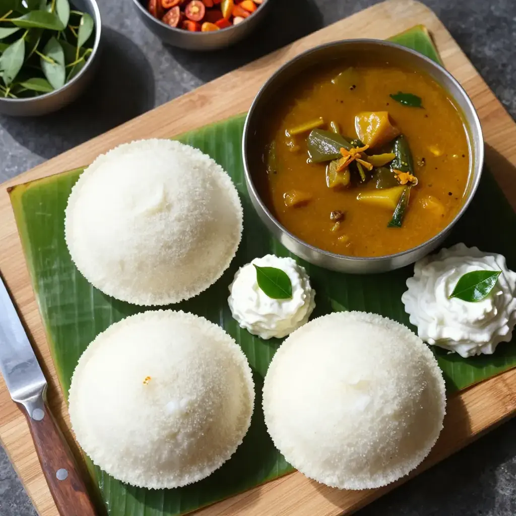 # Idli Sambar Idli — the soft, white, steamed rice-and-lentil cakes of South India — are one of the most nutritionally complete breakfasts in the world, and among the few fermented foods that anchor an entire culture's morning ritual. The batter of rice and urad dal is soaked, ground, and fermented overnight, producing a natural leavening that creates idli's signature spongy texture and subtle tang. Eaten across Tamil Nadu, Karnataka, and Kerala from dawn onward, they are inseparable from sambar — the tangy, spiced tamarind and lentil broth — and coconut chutney. In Chennai, the best idli-sambar is still served on banana leaves. Serves: 4 ## Ingredients **For the idli batter (begin 1-2 days ahead):** - 300g (1.5 cups) idli rice or parboiled rice - 100g (0.5 cup) whole urad dal (black gram, hulled) - 1 tsp fenugreek seeds - Salt to taste **For the sambar:** - 200g (1 cup) toor dal (split pigeon peas) - 200g (7 oz) mixed vegetables (drumstick, shallots, tomato, eggplant) - 30ml (2 tbsp) tamarind paste - 1 tbsp sambar powder - 1/4 tsp turmeric **Sambar tempering:** - 1 tbsp coconut oil or ghee - 1 tsp mustard seeds - 2 dried red chilies - 1 sprig curry leaves - 1 pinch asafoetida (hing) ## Instructions 1. Soak rice and fenugreek seeds together, and urad dal separately, in cold water for 6-8 hours. Grind urad dal to a very smooth, airy batter. Grind rice to a slightly coarser batter. Combine both, add salt, and ferment at room temperature for 10-14 hours until risen and bubbly. 2. Cook toor dal with turmeric and 750ml (3 cups) water until completely soft, about 25 minutes. Mash roughly. 3. Add vegetables, tamarind paste, sambar powder, and enough water to reach a soupy consistency. Simmer 15 minutes until vegetables are tender. 4. In a small pan, heat oil until shimmering. Add mustard seeds and wait for them to pop (about 30 seconds). Add chilies, curry leaves, and asafoetida. Pour this tempering into the sambar. 5. Grease idli moulds and fill each cavity with batter to about three-quarters full. Steam in an idli steamer or improvised steamer over boiling water for 10-12 minutes until a skewer comes out clean. 6. Remove idlis, serve immediately with hot sambar and coconut chutney. **Cook's Notes:** The fermentation is non-negotiable for authentic idli — shortcuts produce dense, gummy results. In cooler climates, place the batter in an oven with just the light on to maintain warmth. Leftover idli can be pan-fried in ghee until crispy for a completely different but equally delicious dish.Images