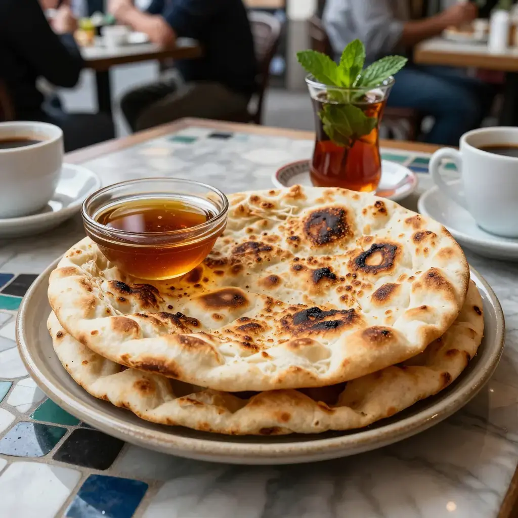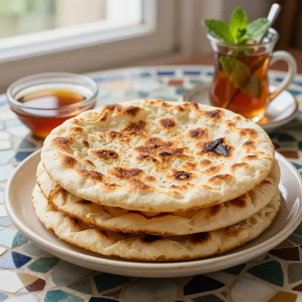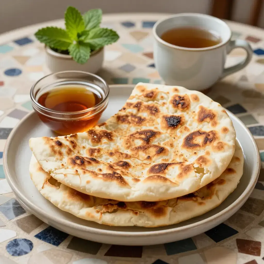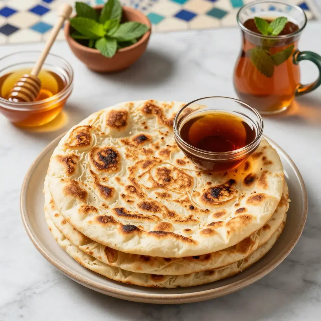 Msemen is the quintessential Moroccan breakfast bread — a flaky, griddle-cooked flatbread made by folding semolina dough over itself repeatedly to create dozens of thin, buttery layers. In homes across Morocco, the morning ritual involves a pot of sweet mint tea, a basket of warm msemen, and small dishes of honey and argan oil for dipping. The technique of stretching, folding, and layering the dough is the same principle as laminated pastry, but achieved entirely by hand in minutes rather than hours. The result is simultaneously crisp on the exterior and yielding within.