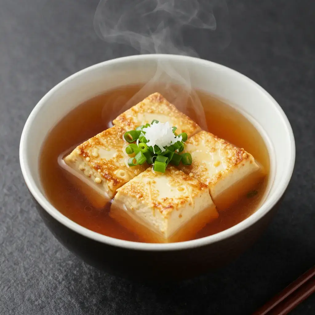 # Agedashi Tofu Agedashi tofu is a Japanese izakaya classic in which silken tofu is lightly dusted with potato starch, deep-fried until the exterior is gossamer-crisp, then set adrift in a delicate dashi broth seasoned with mirin and gluten-free tamari. The contrast between the crispy shell, the trembling tofu within, and the umami-laden broth is one of Japanese cooking's most refined pleasures. Using potato starch (katakuriko) instead of wheat flour ensures the dish is naturally gluten-free. Serves: 4 ## Ingredients - 600g (1.3 lb) medium-firm silken tofu - 60g (1/2 cup) potato starch (katakuriko) - Neutral oil for deep frying - 360ml (1.5 cups) dashi stock (kombu and bonito, or kombu-only for vegetarian) - 3 tbsp gluten-free tamari - 3 tbsp mirin - 1 tsp caster sugar - 2 spring onions, finely sliced - 2 tsp freshly grated ginger - 1 tbsp finely grated daikon radish (optional, for garnish) ## Instructions 1. Drain the tofu and press it gently between clean kitchen towels for 30 minutes to remove excess moisture. Cut into 8 equal rectangles. 2. In a small saucepan, combine dashi, tamari, mirin, and sugar. Heat gently until just simmering; keep warm. 3. Heat 6cm (2.5 inches) of neutral oil in a deep saucepan to 180°C (350°F). 4. Working one at a time, dust each tofu piece thoroughly in potato starch, shaking off excess. 5. Fry in batches of 3–4 pieces for 3–4 minutes, turning once, until the coating is pale golden and lightly crisp. Drain on a rack. 6. Divide the warm dashi broth between four deep bowls. Gently lower two pieces of tofu into each bowl. 7. Top each portion with sliced spring onion, a small mound of grated ginger, and daikon if using. Serve immediately. **Cook's Notes:** Silken tofu shatters easily when cold; handle it with a flat spatula. The broth should be hot but not boiling when you add the tofu — it will continue to soften the crust, which is desirable. For a fully vegetarian version use kombu-only dashi.Images