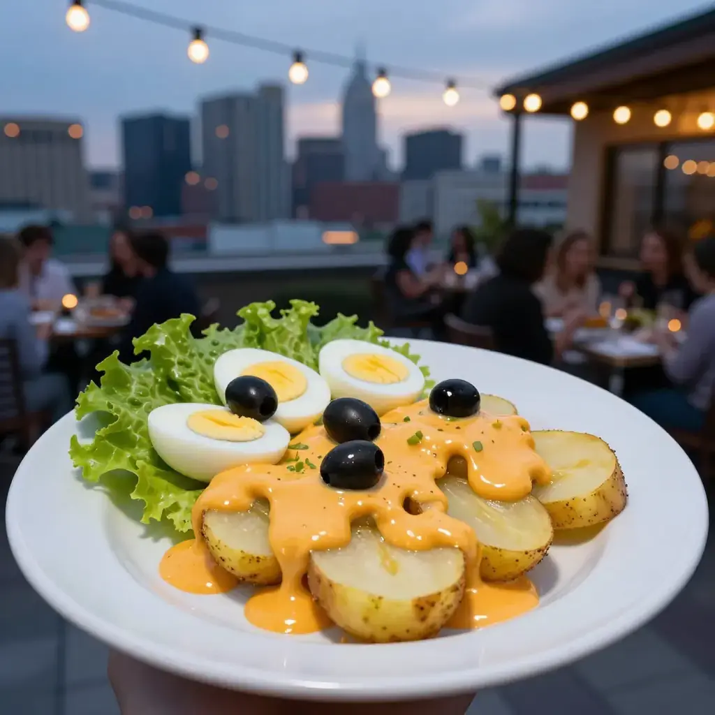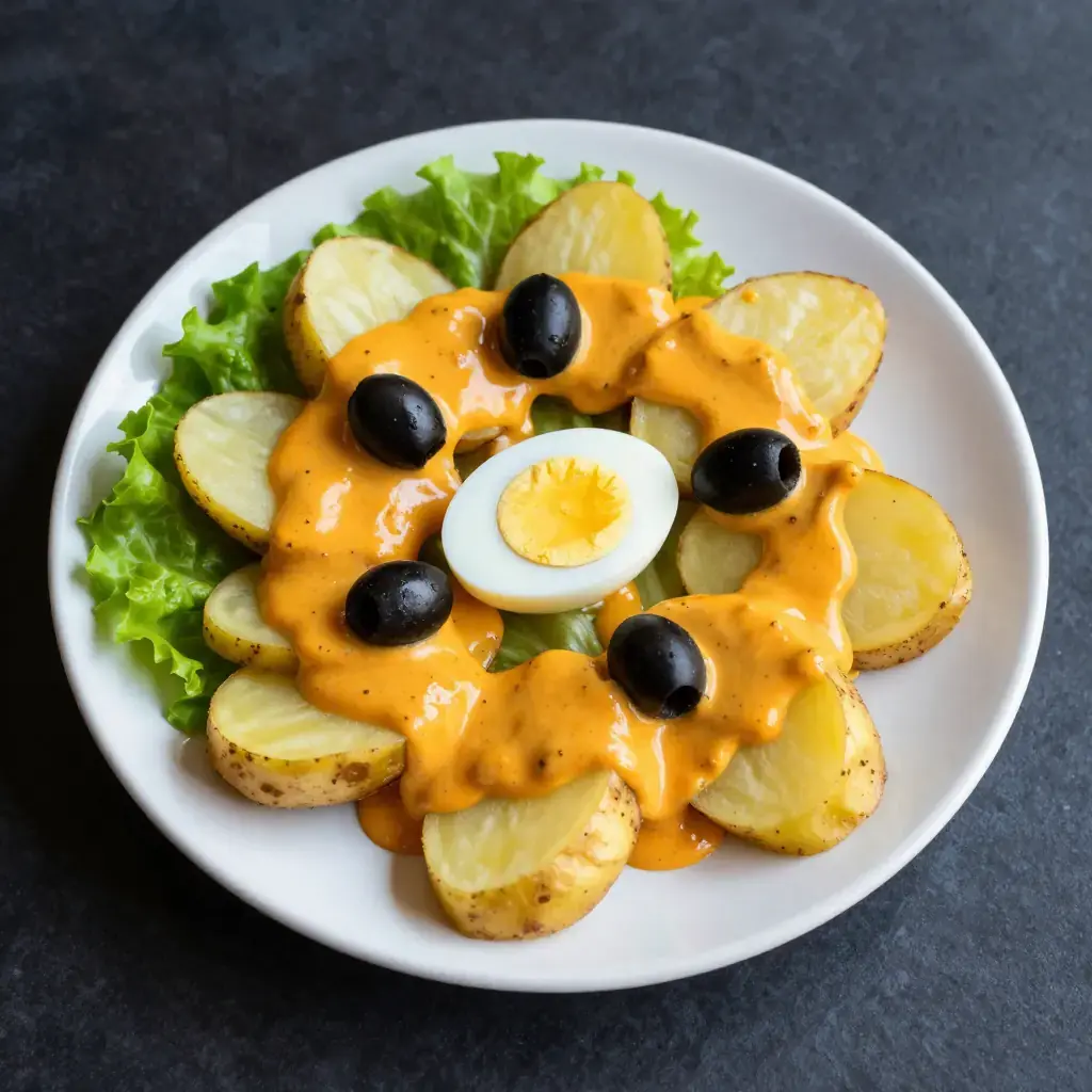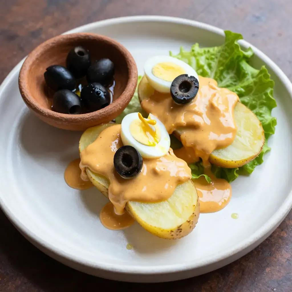 Named after the city of Huancayo in the Peruvian Andes, this cold potato dish is one of Peru's most beloved appetisers. Boiled yellow potatoes are blanketed in a creamy, mildly spicy sauce of ají amarillo (yellow chili), fresh cheese, and evaporated milk. The dish is as much about the vivid yellow-orange sauce as the potato — Peruvian ají amarillo has a fruity, floral heat that cannot be replicated by any substitute. It is served at room temperature, making it ideal as a starter or potluck dish.