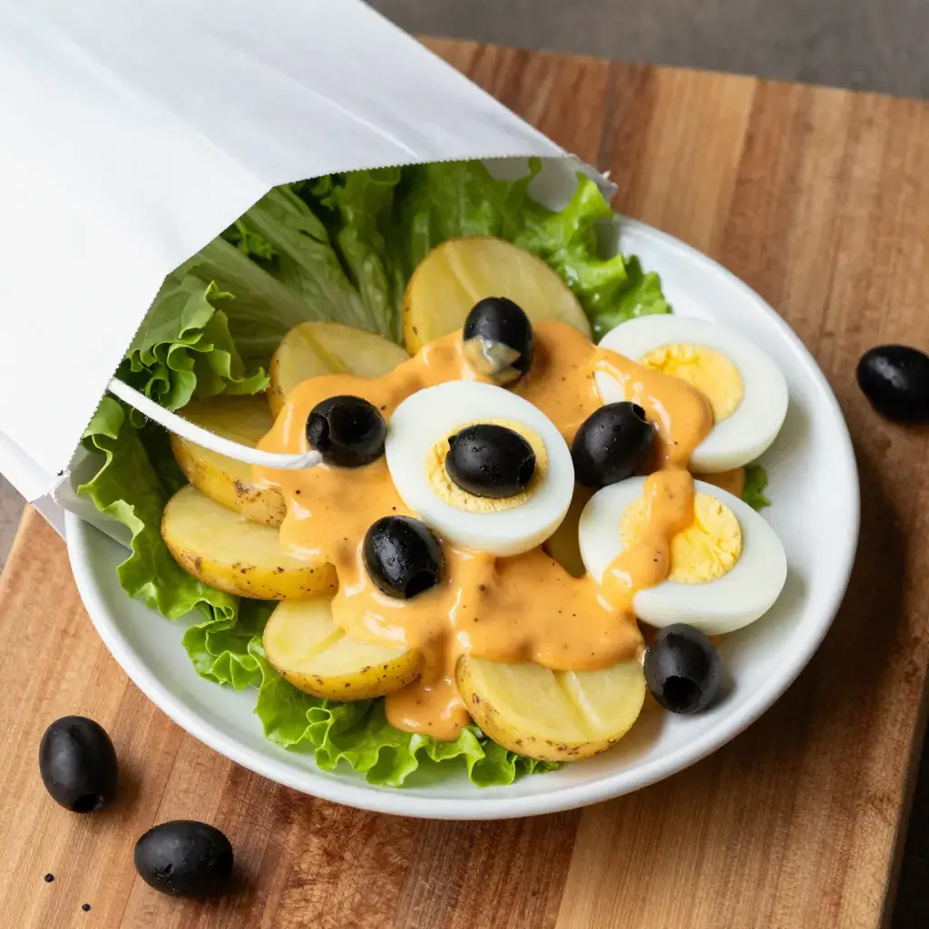 - Pour the huancaína sauce generously over the potatoes. Garnish with sliced hard-boiled eggs, black olives, and parsley.