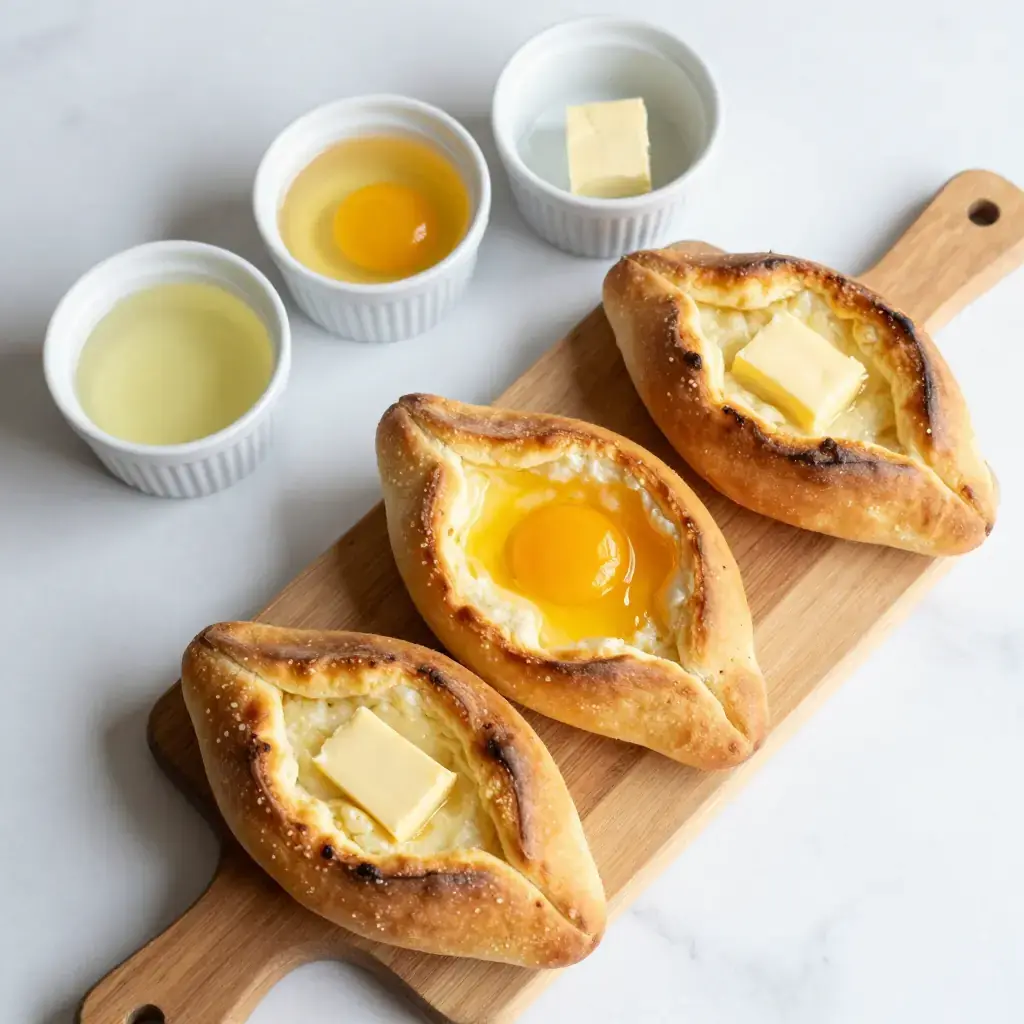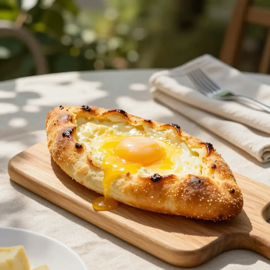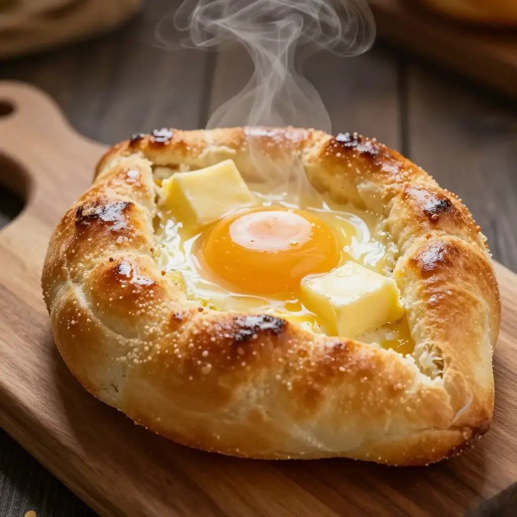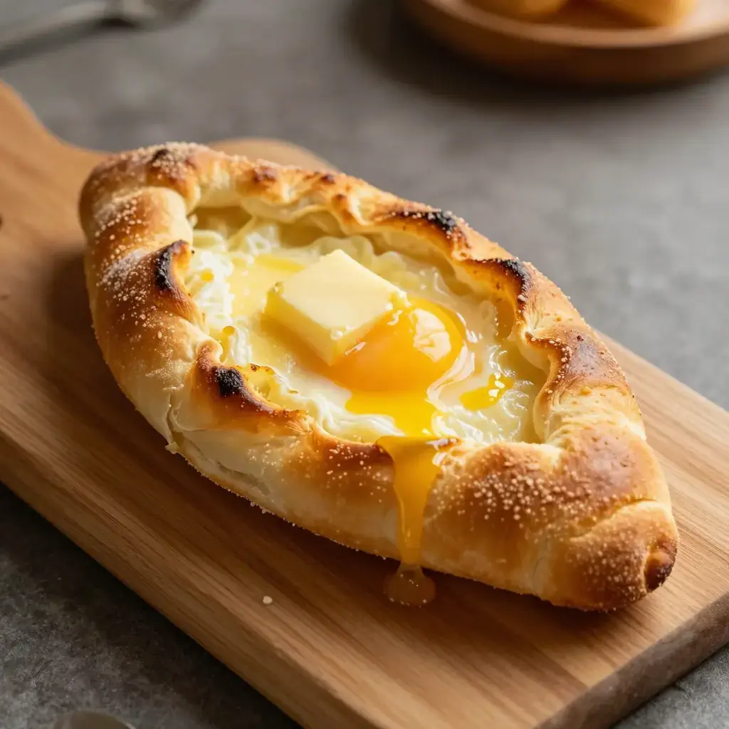 # Khachapuri Khachapuri is Georgia's most iconic dish — a cheese-filled bread that appears at every table from family suppers to roadside bakeries. The Adjaruli style, shaped like a boat with a raw egg cracked in at the end, is the most dramatic and beloved version. Georgia's dairy culture is ancient, and the salty, stretchy sulguni cheese that fills this bread is a cornerstone of the national cuisine. Serves: 4 ## Ingredients - 500g (4 cups) strong white bread flour, plus extra for dusting - 7g (2 tsp) instant yeast - 1 tsp sugar - 1 tsp fine salt - 300ml (1¼ cups) warm water - 2 tbsp neutral oil - 400g (14 oz) sulguni or low-moisture mozzarella, grated - 200g (7 oz) feta cheese, crumbled - 4 eggs - 4 tbsp unsalted butter, cut into pieces ## Instructions 1. Combine flour, yeast, sugar, and salt in a large bowl. Add warm water and oil, mix until a shaggy dough forms, then knead for 8–10 minutes until smooth and elastic. Cover and rest 1 hour until doubled. 2. Mix sulguni and feta together in a bowl. Taste — it should be pleasantly salty. 3. Preheat oven to 230°C (450°F) with a baking stone or heavy baking sheet inside. 4. Divide dough into 4 portions. On a floured surface, roll each into an oval roughly 30×20 cm (12×8 in). Mound a quarter of the cheese filling down the centre, leaving a 5 cm (2 in) border on the long sides. 5. Roll the long edges of the dough up over the cheese and pinch the ends together tightly to form a boat shape. Twist the ends to seal and curl them upward. 6. Transfer to the hot baking sheet. Bake 12–14 minutes until the crust is deep golden and the cheese is bubbling. 7. Remove from oven, make a well in the centre of the cheese, and crack one egg into each boat. Return to oven for 3–4 minutes until the white is just set but the yolk is still runny. 8. Immediately add a knob of butter to each boat. Serve at once — diners stir the egg and butter into the hot cheese and tear pieces of crust to dip. **Cook's Notes:** Sulguni can be found in Eastern European delis; a 50/50 mix of mozzarella and feta is an excellent substitute. Eat immediately — khachapuri waits for no one.Images