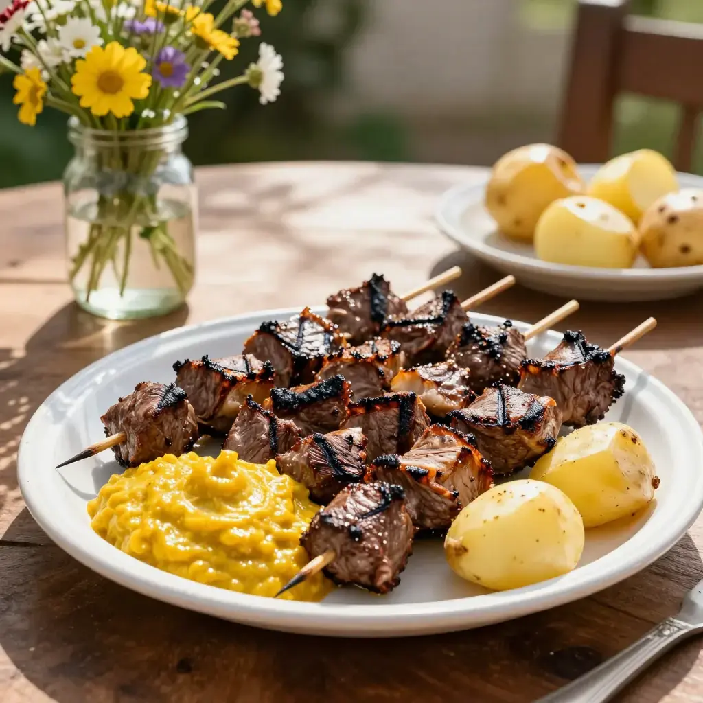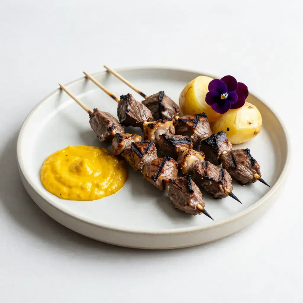 # Anticuchos de Corazón Anticuchos are one of Peru's great street foods — marinated meat grilled on skewers over charcoal braziers by anticucheras who set up at nightfall on street corners across Lima and every Peruvian city. Beef heart (corazón) is the traditional and most celebrated choice: marinated in ají panca, vinegar, cumin, and garlic, it takes on a deeply savoury, slightly smoky flavour with a tender but firm texture quite unlike any other cut. Anticuchos trace their roots to the African Peruvian community who transformed colonial-era offal into a national treasure. Serves: 4 ## Ingredients **Anticuchos:** - 700g (1.5 lb) beef heart, cleaned of all fat and sinew, cut into 3 cm (1.2 in) cubes - 4 tbsp ají panca paste - 3 tbsp red wine vinegar - 4 garlic cloves, minced - 1 tsp ground cumin - 1 tsp dried oregano - 1 tsp fine salt - ½ tsp black pepper - 2 tbsp neutral oil **Ají Amarillo Sauce:** - 2 tbsp ají amarillo paste - 2 tbsp mayonnaise - 1 tbsp lime juice - Salt to taste ## Instructions 1. Rinse the beef heart and pat dry. Trim away any remaining white sinew or fat — the muscle meat is what you want. Cut into 3 cm (1.2 in) cubes. 2. Combine ají panca, vinegar, garlic, cumin, oregano, salt, pepper, and oil in a bowl. Add the heart cubes and mix well to coat. Cover and marinate in the refrigerator for at least 4 hours, or overnight for best results. 3. Soak wooden skewers in water for 30 minutes. Thread 4–5 pieces of heart onto each skewer. 4. Make the ají amarillo sauce by stirring all ingredients together. Refrigerate until needed. 5. Prepare a charcoal grill for high heat, or heat a griddle pan until very hot. Brush grill grates lightly with oil. 6. Grill the skewers for 3–4 minutes per side, basting with any leftover marinade, until nicely charred on the outside but still slightly pink and juicy inside — about 8–10 minutes total. Do not overcook; heart becomes tough if dried out. 7. Serve immediately with the ají amarillo sauce, boiled potatoes, and choclo (large-kernel corn) on the side. **Cook's Notes:** Beef heart is available from butchers and South American grocers. Its flavour is milder than you might expect — many people describe cooked heart as intensely beefy with a clean, non-gamey flavour. The long marinade in vinegar tenderises the muscle fibres.Images