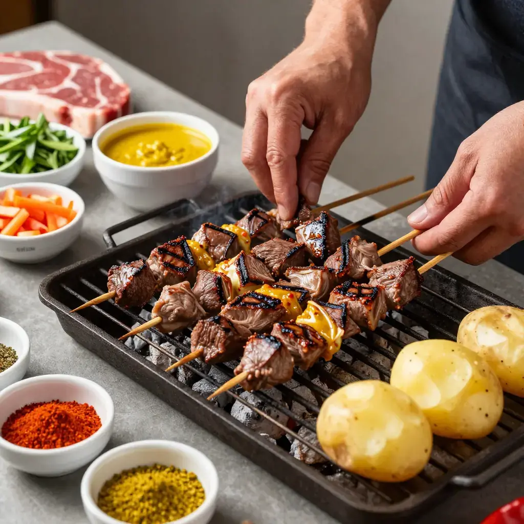 Anticuchos are one of Peru's great street foods — marinated meat grilled on skewers over charcoal braziers by anticucheras who set up at nightfall on street corners across Lima and every Peruvian city. Beef heart (corazón) is the traditional and most celebrated choice: marinated in ají panca, vinegar, cumin, and garlic, it takes on a deeply savoury, slightly smoky flavour with a tender but firm texture quite unlike any other cut. Anticuchos trace their roots to the African Peruvian community who transformed colonial-era offal into a national treasure.