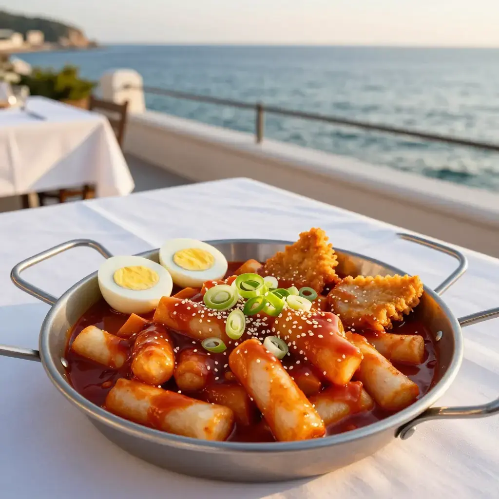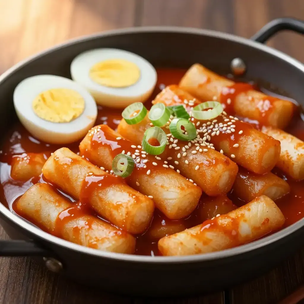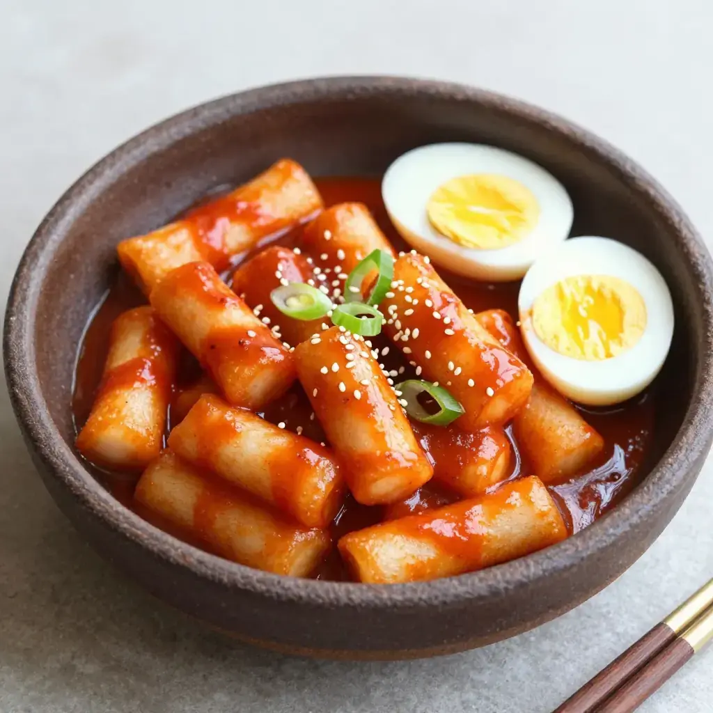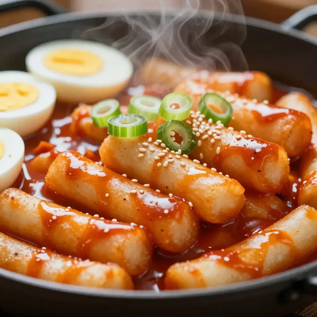 # Tteokbokki Tteokbokki is the undisputed queen of Korean street food. Chewy cylindrical rice cakes swim in a fiery, glossy gochujang sauce that balances heat, sweetness, and depth in every bite. Once a royal court dish made with soy sauce and beef, tteokbokki was reinvented in the 1950s by a street vendor named Ma Bok-rim who added gochujang — and a national obsession was born. Today it is found on every pojangmacha (street stall) and in virtually every Korean home. Serves: 4 ## Ingredients - 500g (1 lb) garaetteok (cylindrical rice cakes), fresh or soaked in cold water 30 min if refrigerated - 200g (7 oz) fish cake (eomuk), sliced into bite-sized pieces - 3 tbsp gochujang (Korean chili paste) - 1 tbsp gochugaru (Korean chili flakes) - 2 tbsp soy sauce - 2 tbsp sugar - 1 tbsp corn syrup or honey - 500ml (2 cups) anchovy-kelp stock (or water) - 3 spring onions, cut into 5cm (2 in) pieces - 2 hard-boiled eggs, halved, to serve - 1 tsp sesame oil - Toasted sesame seeds to garnish ## Instructions 1. Bring the anchovy-kelp stock to a boil in a wide shallow pan. Whisk in the gochujang, gochugaru, soy sauce, sugar, and corn syrup until smooth. 2. Add the rice cakes and fish cake. Simmer over medium-high heat for 8–10 minutes, stirring frequently, until the sauce thickens and the rice cakes are tender and coated. 3. Add the spring onions in the last 2 minutes of cooking. 4. Drizzle with sesame oil and scatter sesame seeds. Serve immediately topped with halved boiled eggs. **Cook's Notes:** Garaetteok should be soft but still chewy — taste one at the 8-minute mark. If the sauce reduces too fast, splash in a little more stock. For a richer version popular in Seoul, add 2 tbsp heavy cream or a slice of processed cheese in the final minute. The sauce should be glossy and cling to the rice cakes; if it looks watery, raise the heat and stir constantly for 1–2 minutes more.Images