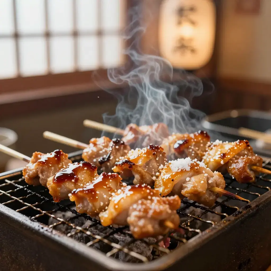 Yakitori — skewered chicken grilled over binchotan charcoal — is the quintessential Japanese izakaya (gastropub) food, eaten standing at smoky street stalls or hunched over a counter while sipping cold beer or chilled sake. Every part of the chicken is used: thigh meat basted in sweet tare sauce, crispy chicken skin, tender breast with spring onion, and more adventurous offal cuts. This recipe focuses on the classic momo (thigh) and negi-ma (thigh with leek) variations with a homemade tare that develops over many batches.