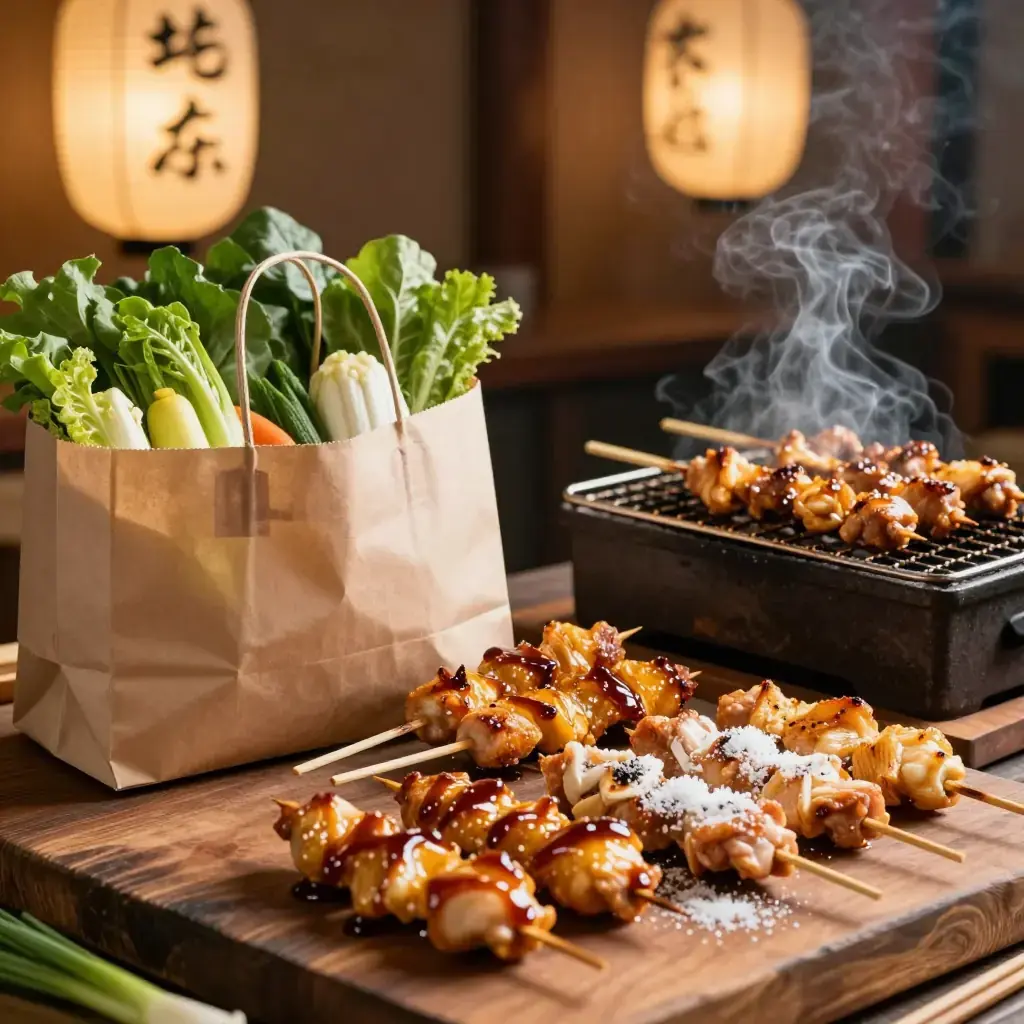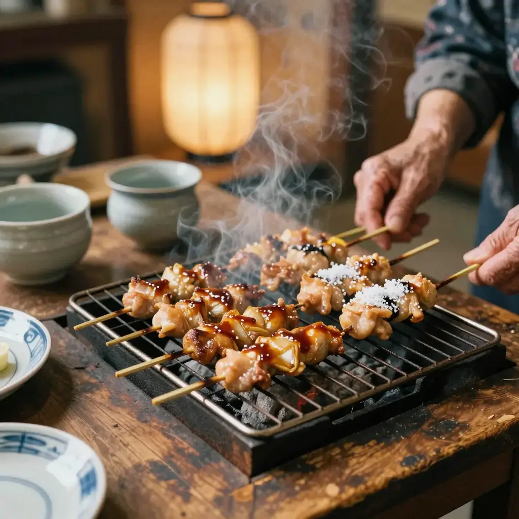 # Yakitori Yakitori — skewered chicken grilled over binchotan charcoal — is the quintessential Japanese izakaya (gastropub) food, eaten standing at smoky street stalls or hunched over a counter while sipping cold beer or chilled sake. Every part of the chicken is used: thigh meat basted in sweet tare sauce, crispy chicken skin, tender breast with spring onion, and more adventurous offal cuts. This recipe focuses on the classic momo (thigh) and negi-ma (thigh with leek) variations with a homemade tare that develops over many batches. Serves: 4 ## Ingredients **Tare sauce:** - 120ml (1/2 cup) soy sauce - 60ml (1/4 cup) mirin - 60ml (1/4 cup) sake - 1 tbsp sugar **Skewers:** - 600g (1.3 lb) boneless, skin-on chicken thighs, cut into 3cm (1.2-inch) pieces - 4 spring onions (scallions), white and light green parts, cut into 3cm lengths - Salt (for shio yakitori) - 16 bamboo skewers, soaked in water 30 minutes ## Instructions 1. Make tare: combine soy sauce, mirin, sake, and sugar in a small saucepan. Bring to a boil, stir to dissolve sugar, reduce heat and simmer 5 minutes until slightly thickened. Cool. 2. Thread chicken pieces onto half the skewers (4–5 pieces each). Thread alternating chicken and spring onion pieces onto the remaining skewers (negi-ma style). 3. Grill over high heat (charcoal ideal, gas or grill pan acceptable) for 2–3 minutes per side until cooked through with good colour. 4. For tare yakitori: brush with tare sauce, grill 30 seconds more per side. Repeat for a second coat. 5. For shio yakitori: sprinkle lightly with flaky salt just before serving instead of tare. **Cook's Notes:** The tare improves with repeated use — pour it back into a jar and refrigerate; top up with fresh soy sauce, mirin, and sake over time. The fat that drips from the chicken enriches it beautifully. Keep skewers away from direct flame to prevent burning.Images