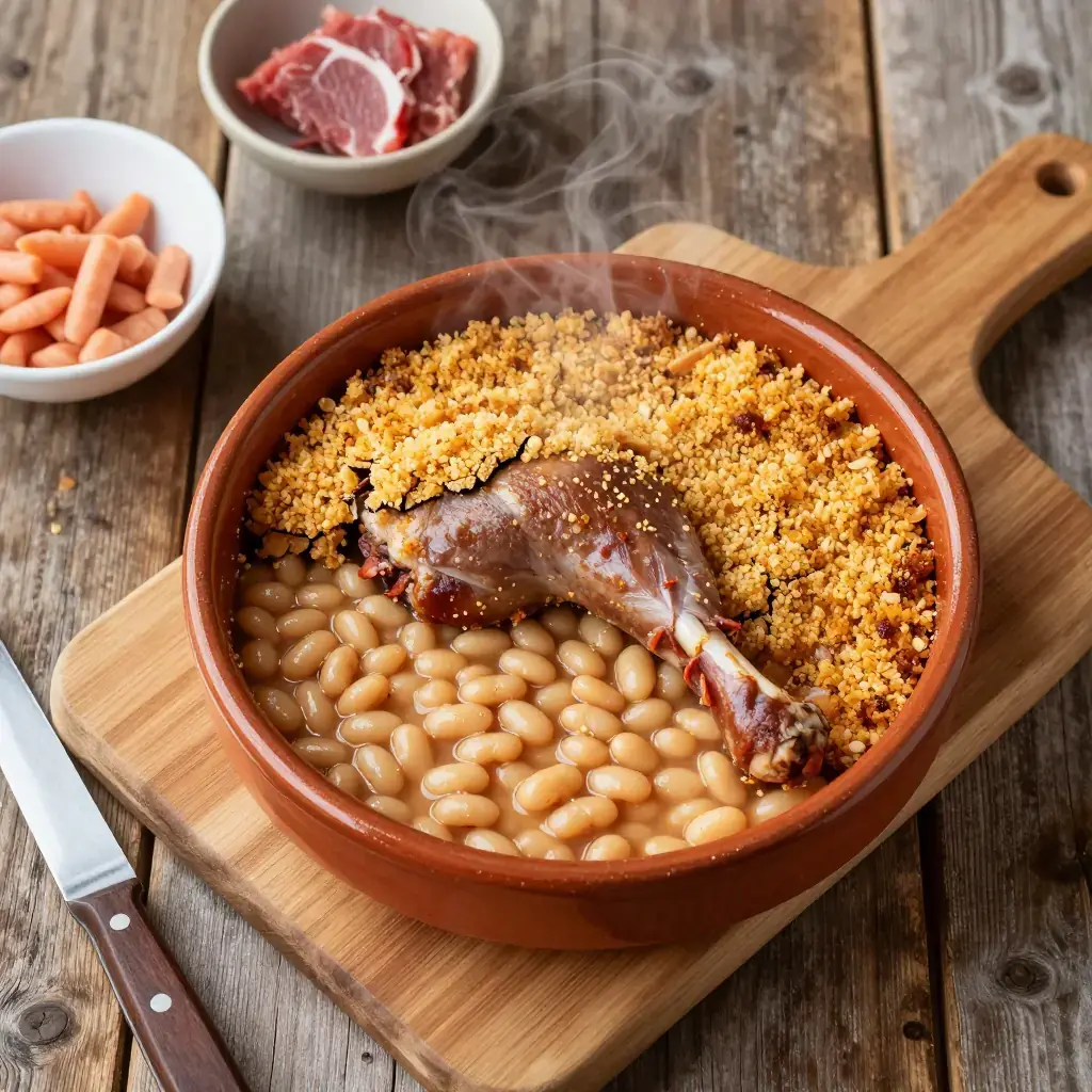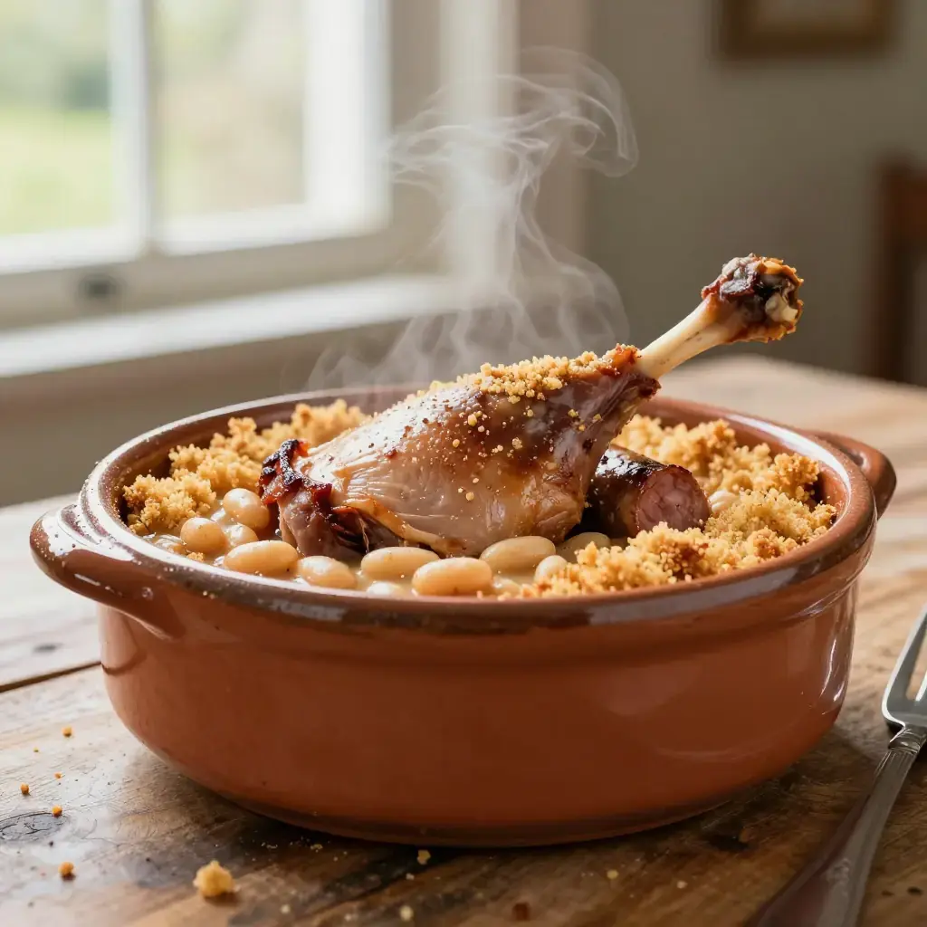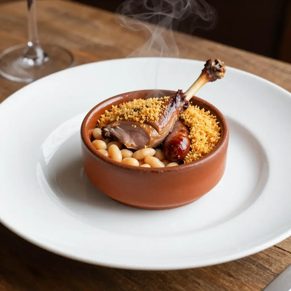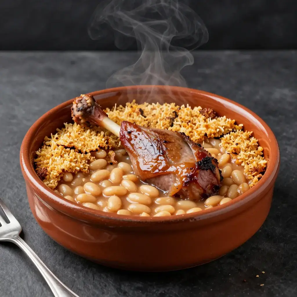 # Cassoulet Cassoulet is the defining dish of Languedoc — a long-simmered casserole of white beans, duck confit, pork sausage, and sometimes lamb, baked beneath a golden breadcrumb crust in the earthenware vessel (*cassole*) that gives it its name. The towns of Castelnaudary, Carcassonne, and Toulouse each claim the definitive version, arguing over the correct meats with a fervour bordering on religious. All agree on one thing: it demands time, fat, and patience. Serves: 6 ## Ingredients - 500g (1.1 lbs) dried white haricot beans or Great Northern beans, soaked overnight - 4 duck confit legs (store-bought is fine) - 400g (14 oz) Toulouse sausage or good pork sausage, cut into chunks - 200g (7 oz) pancetta or lardons - 1 large onion, chopped - 4 cloves garlic, sliced - 400g (14 oz) can crushed tomatoes - 500ml (2 cups) chicken stock - 1 bouquet garni (bay, thyme, parsley stems) - Salt and black pepper - 100g (3.5 oz) fresh breadcrumbs - 2 tbsp duck fat or butter ## Instructions 1. Drain soaked beans and simmer in fresh unsalted water 45 minutes until just tender but not fully cooked. Drain, reserving 300ml (1¼ cups) cooking liquid. 2. Brown sausage pieces in a large oven-safe pot or Dutch oven over medium-high heat; remove. Brown pancetta; remove. In the same fat, soften onion 8 minutes, then add garlic and tomatoes; cook 5 minutes. 3. Return meats to the pot. Add beans, reserved cooking liquid, chicken stock, and bouquet garni. Bring to a simmer. Nestle duck confit legs on top. Season generously. 4. Cover and bake at 160°C (325°F) for 1.5 hours. Remove lid, scatter breadcrumbs mixed with melted duck fat over the surface, and bake uncovered a further 45 minutes until a golden crust forms. 5. Break the crust, stir it partially into the beans, and bake 20 more minutes to form a second crust. Rest 10 minutes before serving from the pot. **Cook's Notes:** Breaking and reforming the crust is traditional — purists do it three times. Duck confit legs can be bought vacuum-packed at good delis and French grocers. Do not salt the beans during their initial cooking or they will remain tough.Images