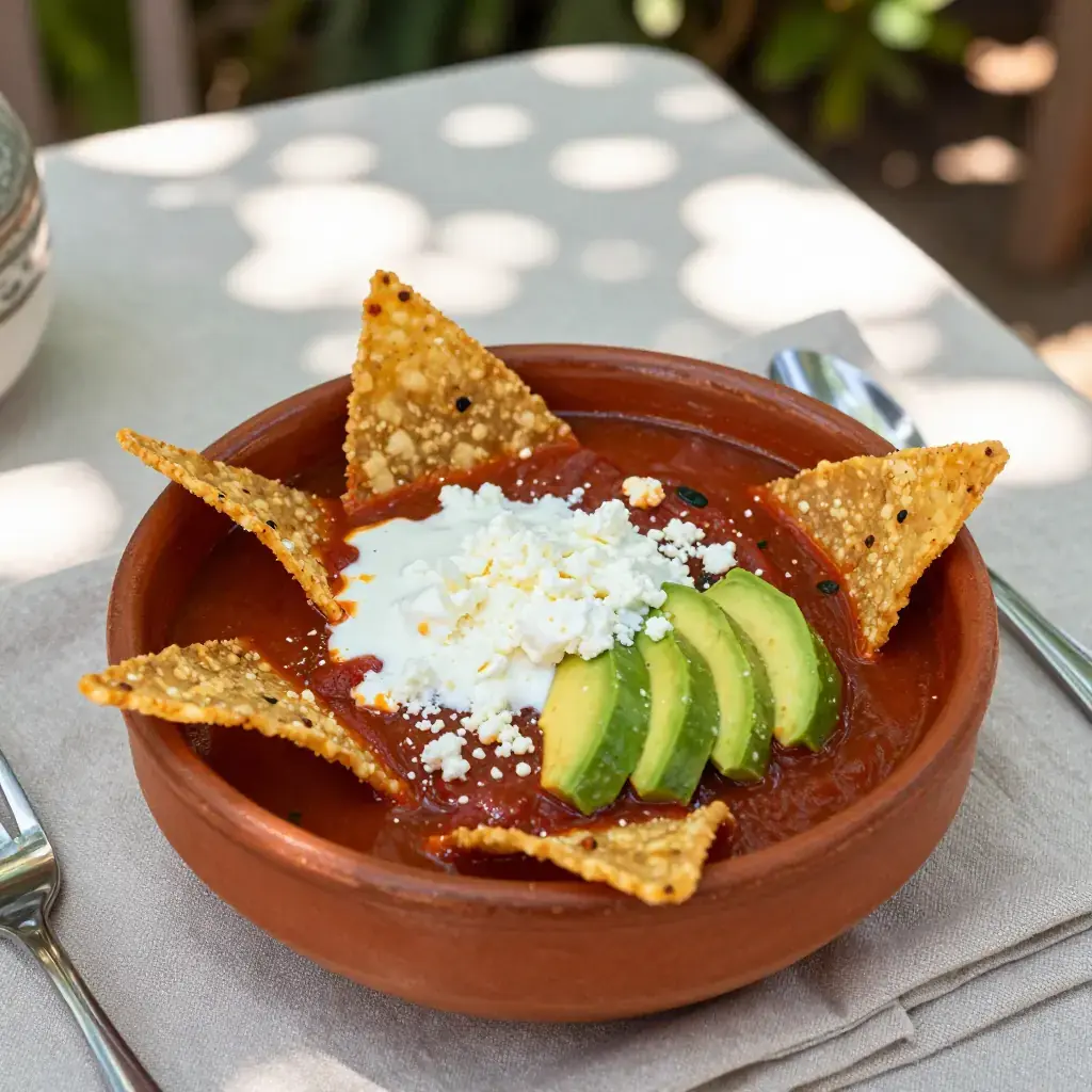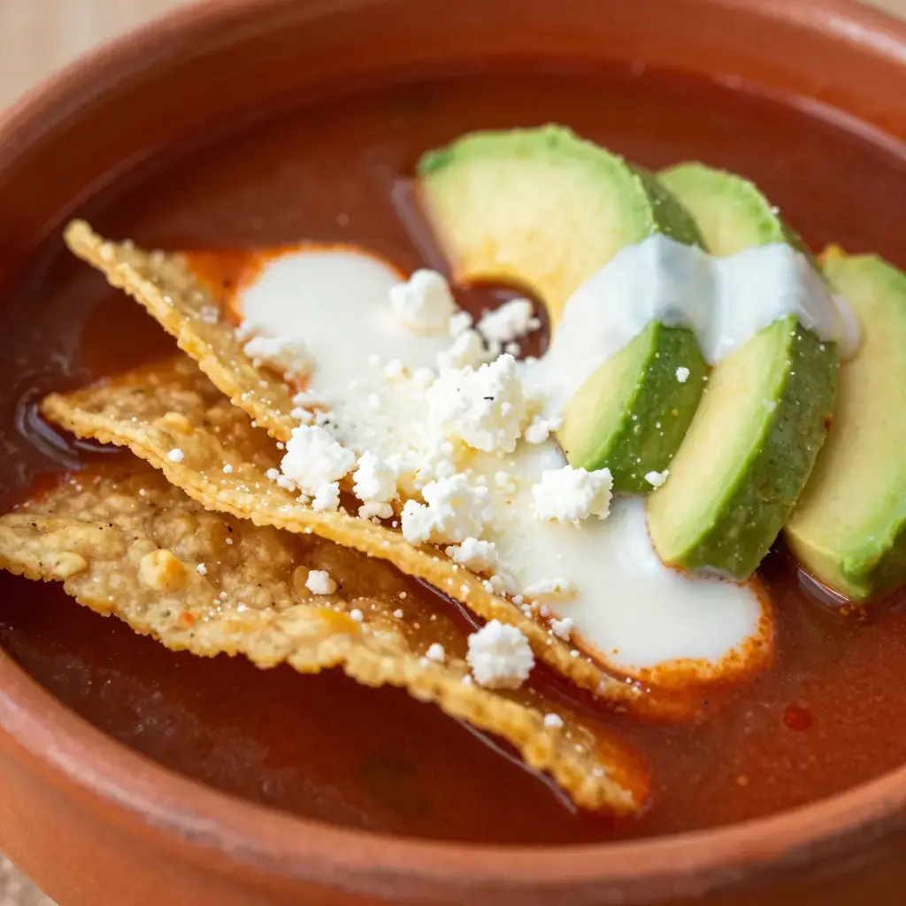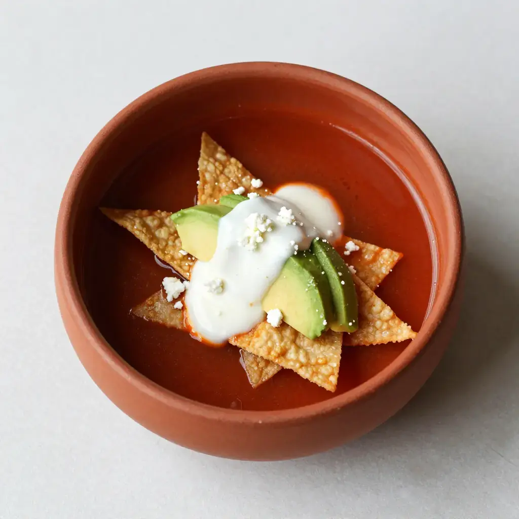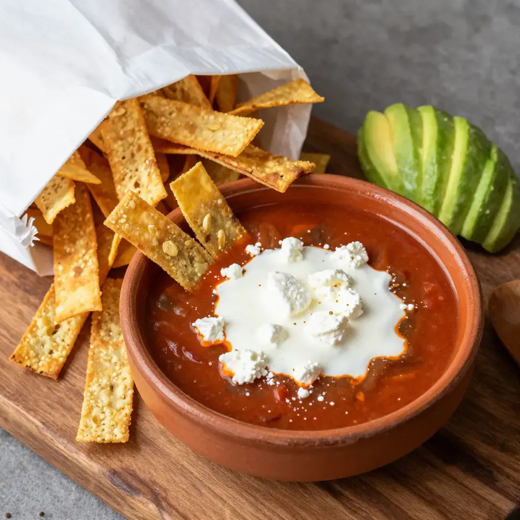 Sopa Azteca — also called sopa de tortilla — is Mexico City's beloved street-food soup, a dish that transforms day-old tortillas into something extraordinary. The base is a smoky, tomato-pasilla chile broth poured tableside over crispy tortilla strips and garnished with a riot of toppings. Its name honors pre-Columbian ingredients: maize, chiles, and tomatoes, all native to Mesoamerica. Every family has their version; this one follows the classic capitalino style.