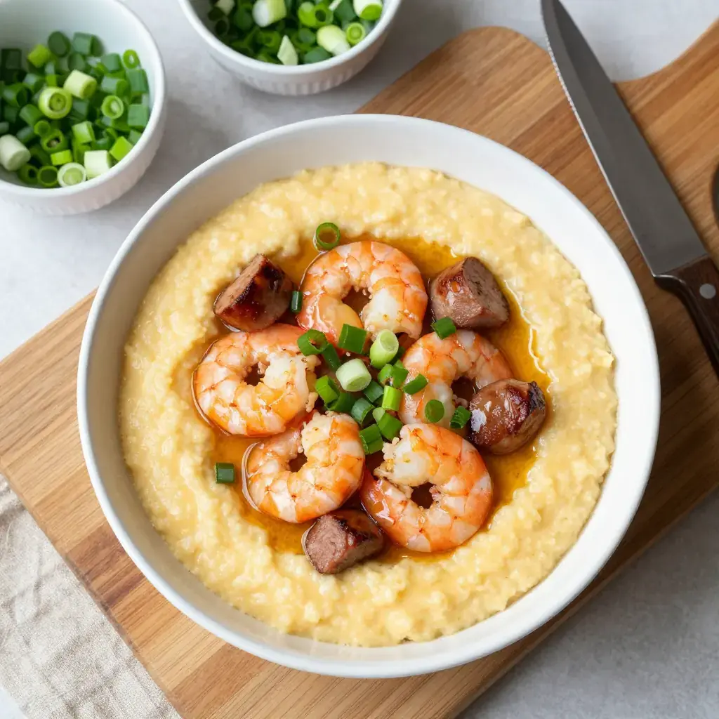 # Shrimp and Grits Shrimp and grits began as a humble breakfast eaten by Carolina Lowcountry shrimpers — quick-cooked creek shrimp stirred into morning grits. By the 1980s, chef Bill Neal of Chapel Hill elevated it to a restaurant staple, and it became the defining dish of the American South's culinary renaissance. Today it appears on menus from Charleston to New Orleans, but the soul of the dish remains the same: sweet fresh shrimp meeting slow-cooked, butter-enriched stone-ground grits. Serves: 4 ## Ingredients **For the grits:** - 200 g (1 cup) stone-ground white grits - 950 ml (4 cups) water - 240 ml (1 cup) whole milk - 60 g (4 tbsp) unsalted butter - 100 g (3.5 oz) sharp cheddar, grated - 1 tsp salt **For the shrimp:** - 600 g (1.3 lb) large shrimp, peeled and deveined - 150 g (5 oz) andouille sausage, sliced into coins - 3 garlic cloves, minced - 1 small green bell pepper, diced - 3 spring onions, sliced - 1 tbsp Worcestershire sauce - 120 ml (1/2 cup) chicken stock - 2 tbsp unsalted butter - Pinch of cayenne, salt and black pepper ## Instructions 1. Bring water and milk to a simmer. Whisk in grits gradually. Cook over low heat, stirring every few minutes, 25–30 minutes until thick and tender. Stir in butter, cheddar, and salt. Keep warm. 2. Cook andouille in a large skillet over medium-high heat 3–4 minutes until browned. Remove. Add 1 tbsp butter to the pan. 3. Add bell pepper; cook 3 minutes. Add garlic and cook 1 minute. Add shrimp in a single layer; cook 90 seconds per side until just pink. 4. Return andouille to pan. Add Worcestershire and chicken stock; simmer 2 minutes. Stir in remaining butter; season with cayenne, salt, and pepper. 5. Spoon grits into bowls, ladle shrimp mixture over top, and scatter spring onions. **Cook's Notes:** Stone-ground grits are non-negotiable for authentic texture — instant grits produce a gluey result. The grits will thicken as they cool; add a splash of warm water to loosen if needed.Images