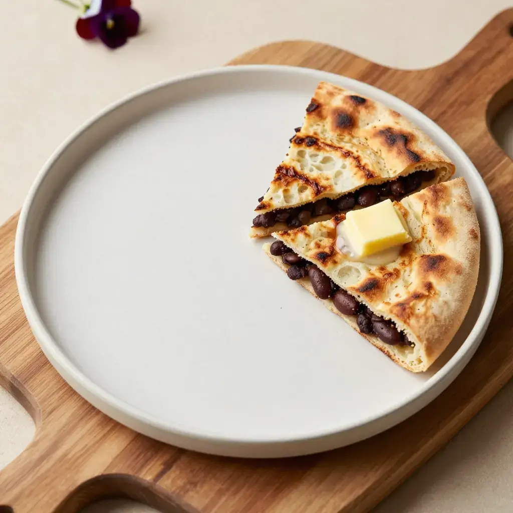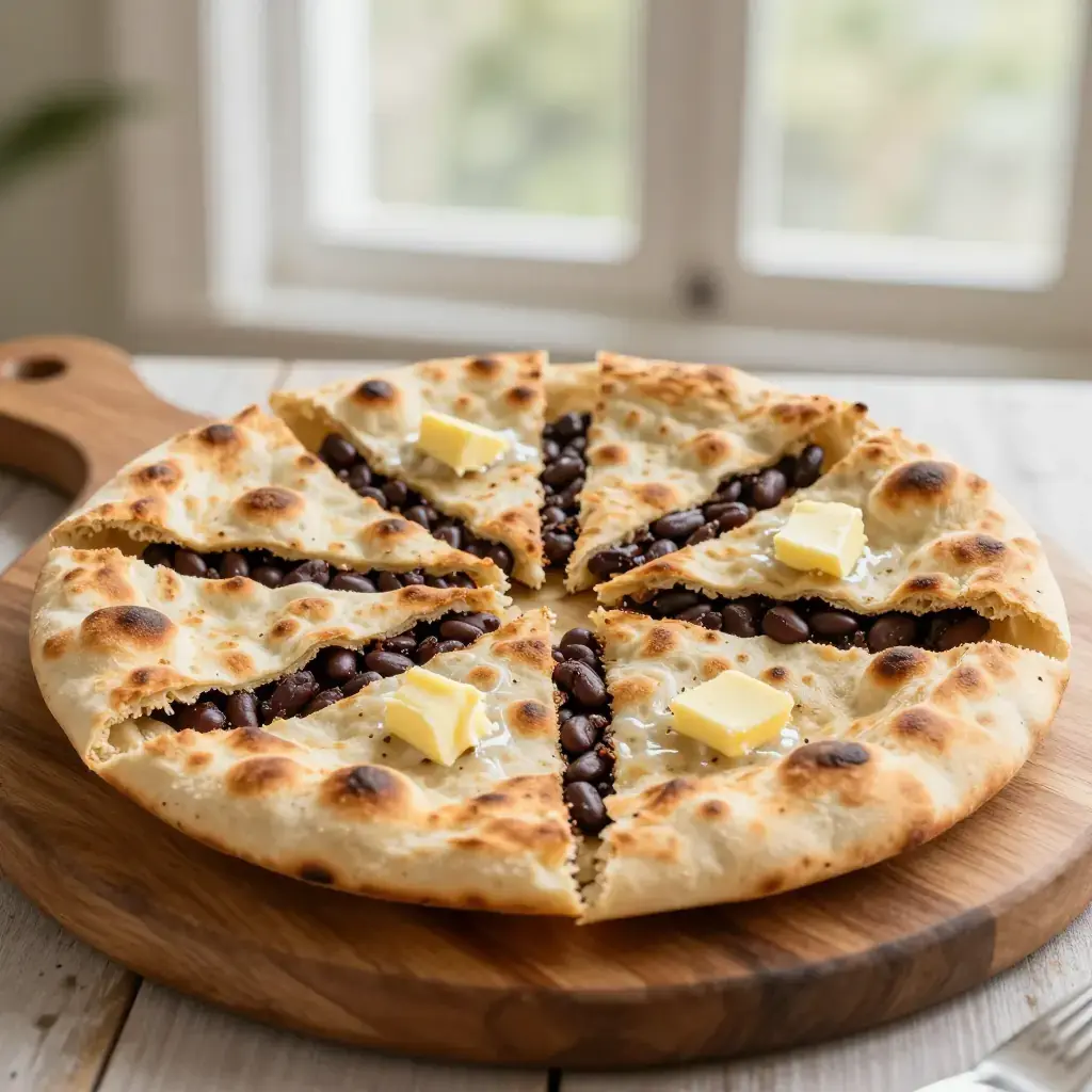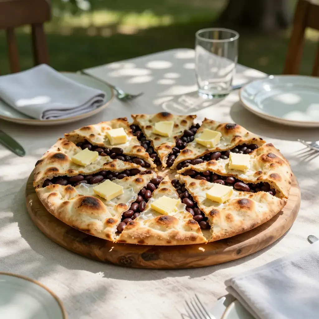 Lobiani is the savoury bean-filled flatbread of Georgia's mountainous Racha region — a sibling to khachapuri but filled with highly seasoned kidney beans instead of cheese. In Racha, where winters are brutal, lobiani sustained communities on the flavour of dried beans transformed by fenugreek, coriander seed, and raw onion. The bread is cooked in a cast iron skillet, developing a blistered, slightly charred crust while remaining tender inside. A celebratory food eaten at Easter and family gatherings, it is also sufficiently quick for a weeknight. The bean filling is naturally low in sodium, relying on spice rather than salt for flavour.