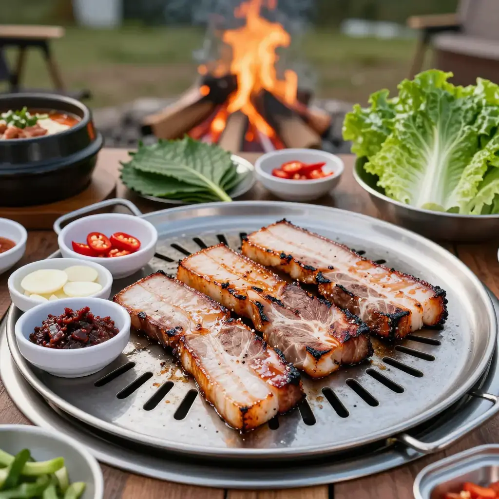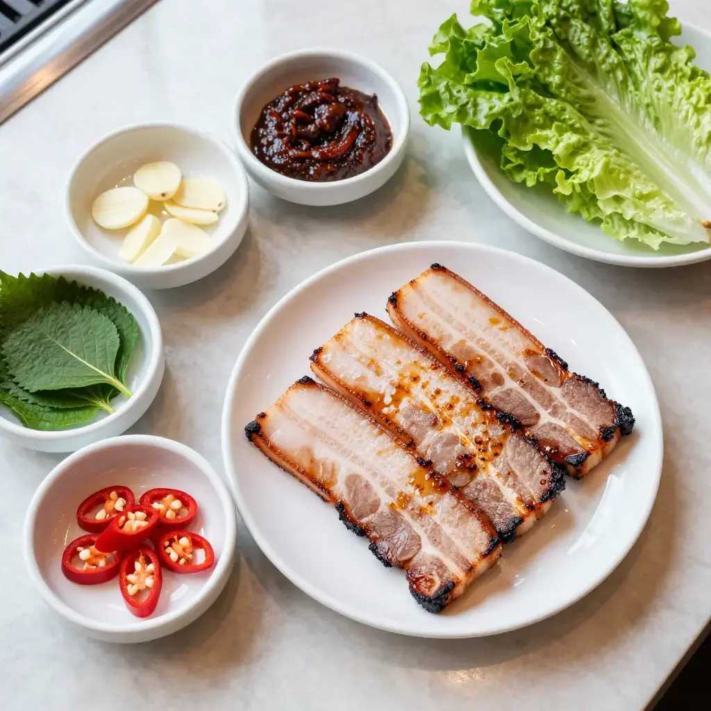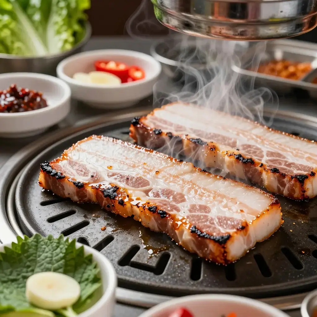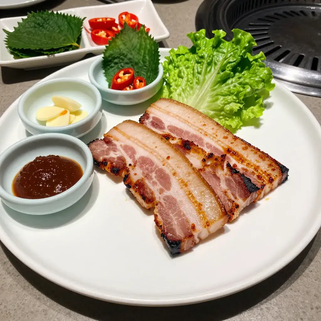 Cook's Notes: The thickness of the pork is non-negotiable — anything thinner than 6mm will cook too quickly and miss the crispy-outside, juicy-inside texture that makes samgyeopsal special. Sesame oil drizzled at the end adds fragrance; don't skip it. In Korea, a small wire mesh is placed over the flame to catch the dripping fat — a grill pan works well as a substitute.