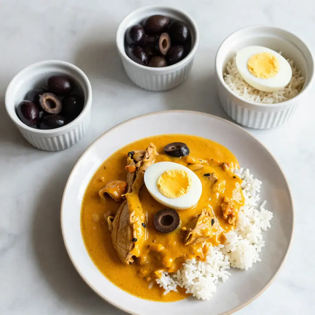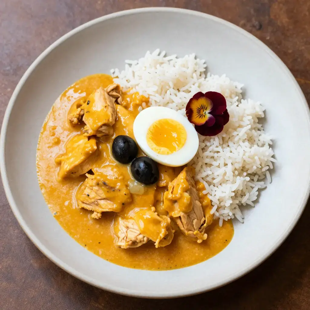 # Ají de Gallina (Peruvian Creamy Chicken Stew) Ají de gallina is one of Peru's great national dishes, a showcase for the country's defining ingredient: the ají amarillo chilli. A golden, moderately spicy pepper with a fruity, almost tropical flavour, ají amarillo is the soul of this dish — it gives the sauce its signature bright yellow-orange colour and a warmth that is aromatic rather than punishing. Poached chicken is shredded and folded into a rich sauce thickened with bread soaked in evaporated milk, walnuts, and Parmesan, a legacy of the Moorish and Spanish influences that shaped Peruvian cuisine. The result is simultaneously comforting and complex, served over white rice with a halved hard-boiled egg and sliced olives. Serves: 4 ## Ingredients - 700g (1.5 lb) boneless chicken breast or thighs - 1 litre (4 cups) chicken stock (for poaching) - 3 tbsp ají amarillo paste (from jar or fresh blended) - 3 tbsp neutral oil - 1 large onion, finely diced - 4 garlic cloves, minced - 1 tsp turmeric - 4 slices white bread, crusts removed - 250ml (1 cup) evaporated milk - 60g (2 oz) walnuts, finely ground - 40g (1.5 oz) Parmesan, grated - Salt and black pepper to taste - 4 hard-boiled eggs, halved - 8 black olives, to garnish - Cooked white rice, to serve ## Instructions 1. Poach chicken in stock over medium heat for 20-25 minutes until cooked through. Remove chicken and reserve the stock. Once cool, shred the chicken into medium pieces. 2. Soak bread in evaporated milk for 5 minutes, then blend together into a smooth paste. 3. Heat oil in a wide saucepan over medium heat. Sauté onion for 8 minutes until golden. Add garlic and ají amarillo paste and cook for 3-4 minutes, stirring, until fragrant and the paste darkens slightly. Add turmeric. 4. Add the bread-and-milk paste, ground walnuts, and Parmesan to the pan. Stir well and cook for 2-3 minutes. 5. Gradually stir in 250-375ml (1-1.5 cups) of the reserved poaching stock until you reach a thick, creamy, pourable sauce consistency. Simmer for 5 minutes. 6. Fold in the shredded chicken. Taste and adjust seasoning with salt and pepper. 7. Serve over white rice, topped with halved hard-boiled eggs and black olives. **Cook's Notes:** Ají amarillo paste is sold in jars at Latin American grocery stores and online — it is not optional and cannot be substituted with generic chilli paste. The sauce should be thick enough to coat a spoon but still flow; if it firms up on standing, loosen with a little warm stock before serving.Images