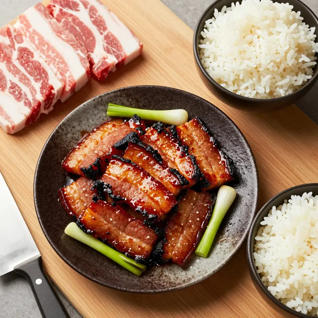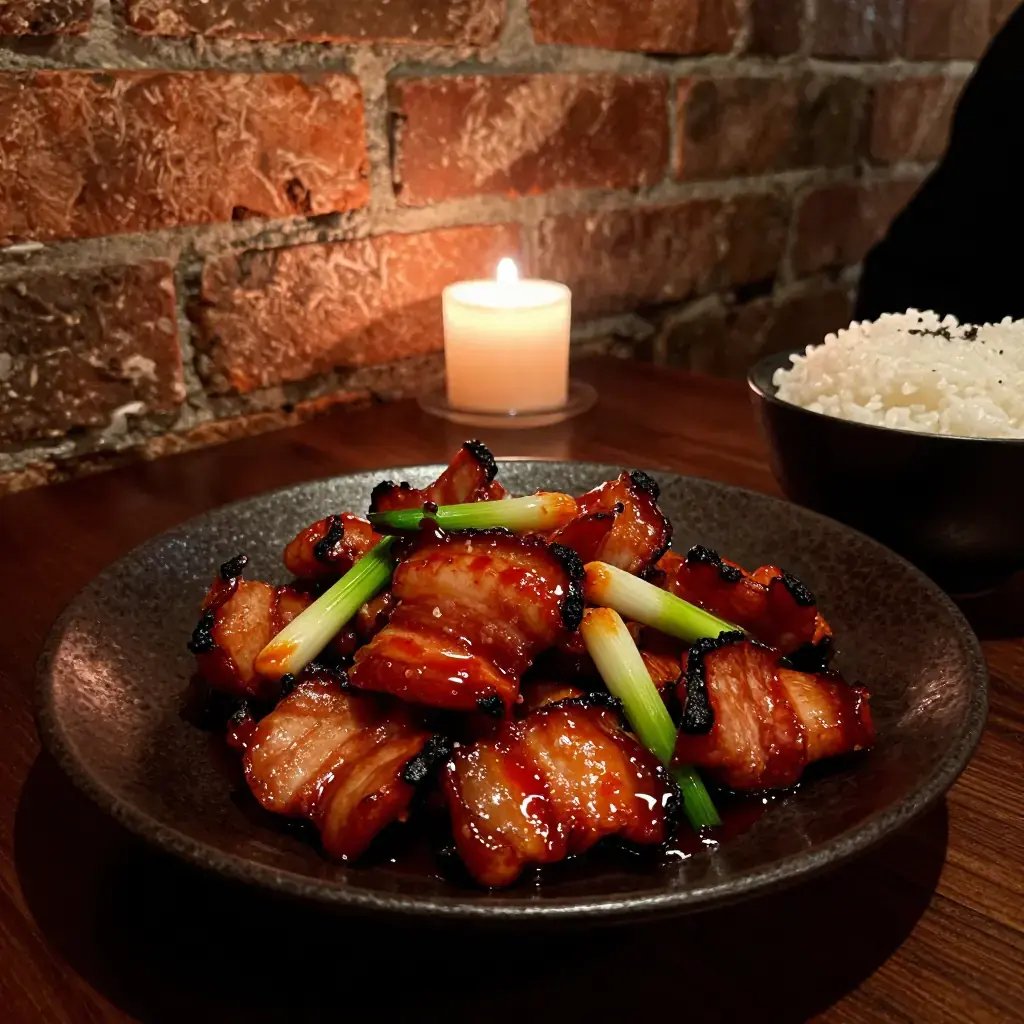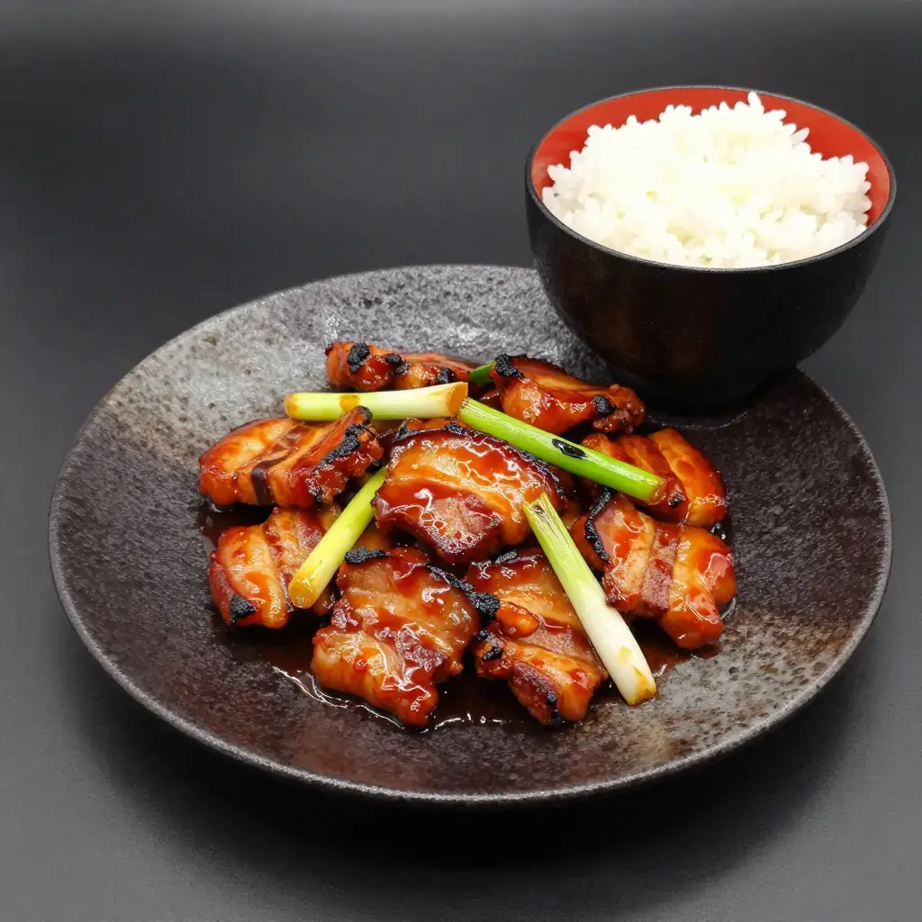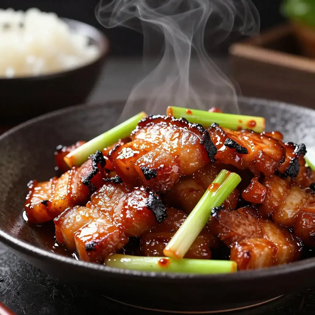 Hui Guo Rou — literally 'returned to the wok pork' — is one of the definitive dishes of Sichuan home cooking. A slab of pork belly is first poached in water with aromatics until just cooked through, then sliced and stir-fried in a screaming hot wok with doubanjiang (fermented broad bean and chilli paste), sweet bean paste, and garlic shoots or leeks. The pork slices curl at the edges from the heat, developing crispy, caramelised tips while the fat renders to a silky translucence. The name comes from this two-stage cooking method: the first cooking in water, and the second — the return — to the wok. It is eaten with steamed rice and is considered the litmus test of a Sichuan cook.