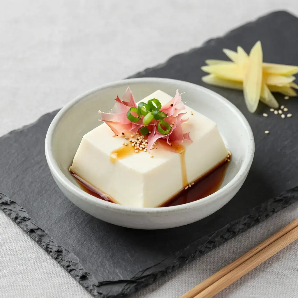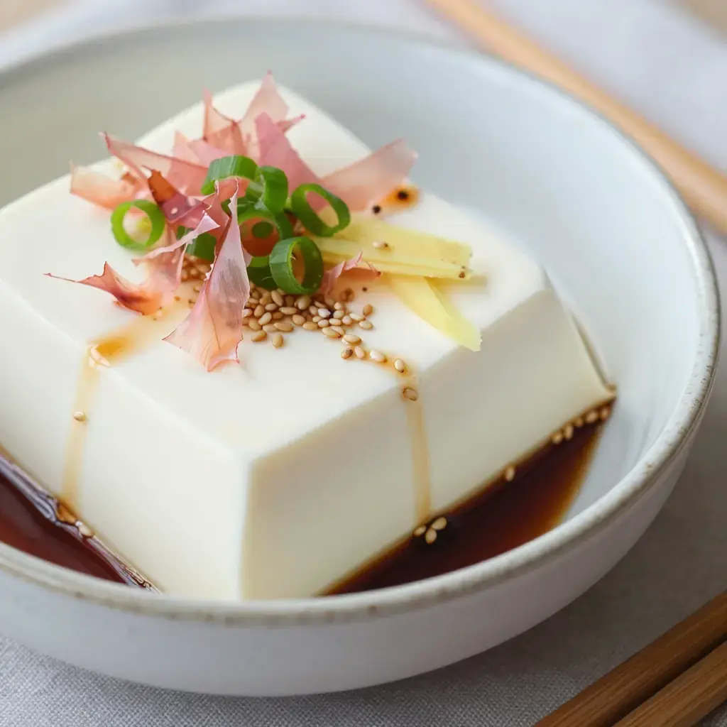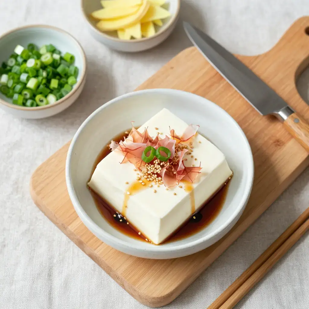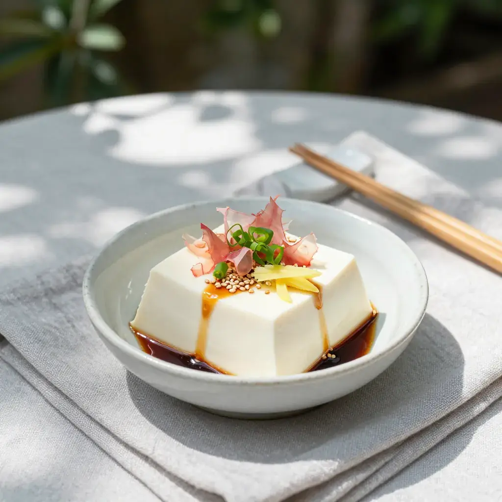 Cook's Notes: The quality of tofu matters enormously here — seek out fresh silken tofu from a Japanese or Asian grocery if possible. Keep all components cold; even the serving bowls can be chilled in the freezer for 5 minutes. Vegan version: omit bonito flakes and use tamari instead of soy sauce. In Japan, myoga (Japanese ginger bud), shiso leaves, or natto are also popular toppings.