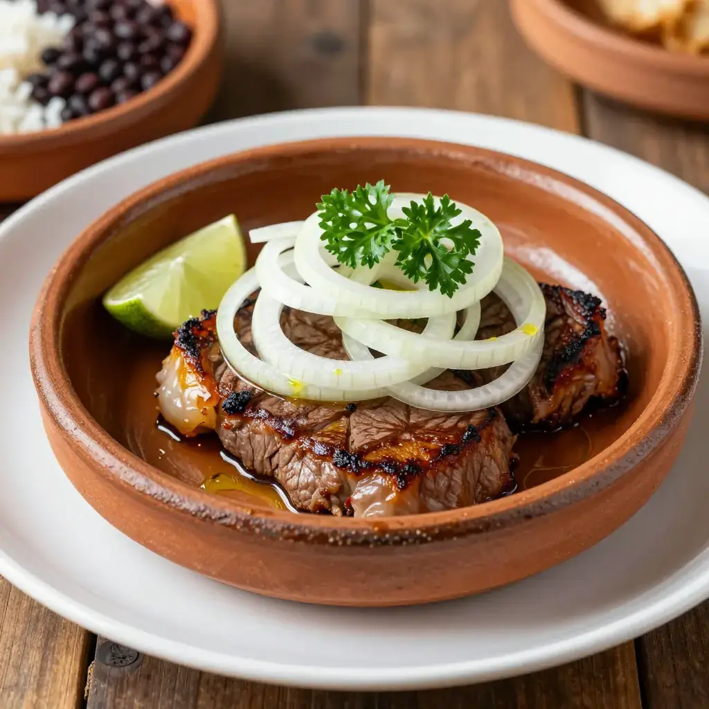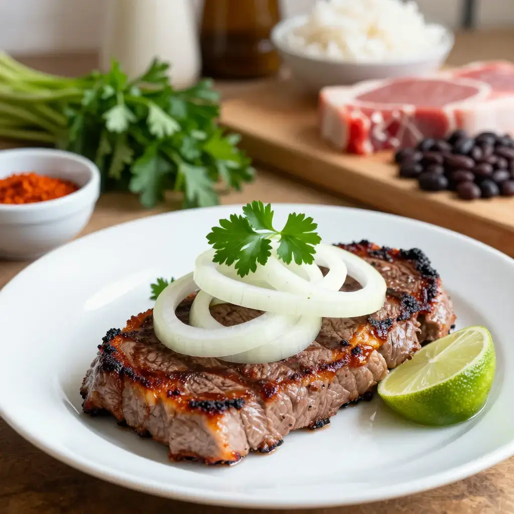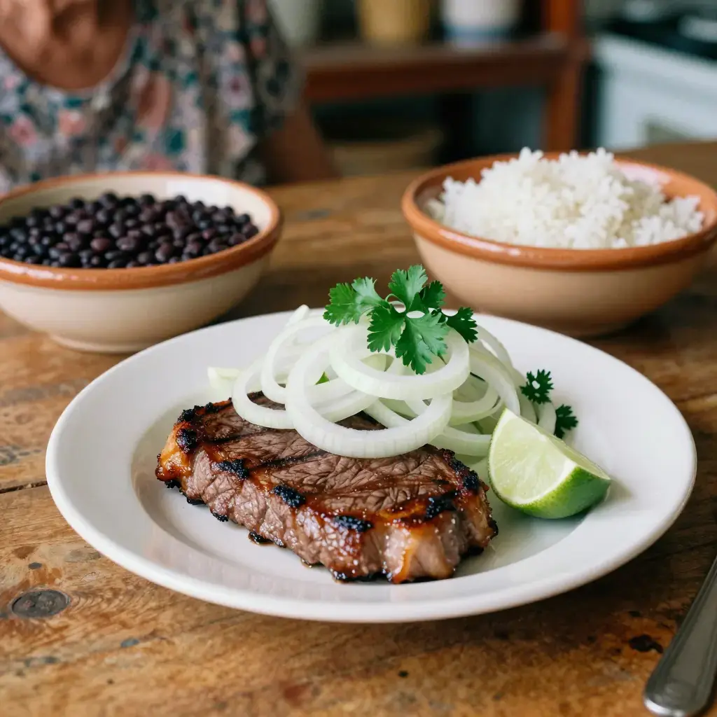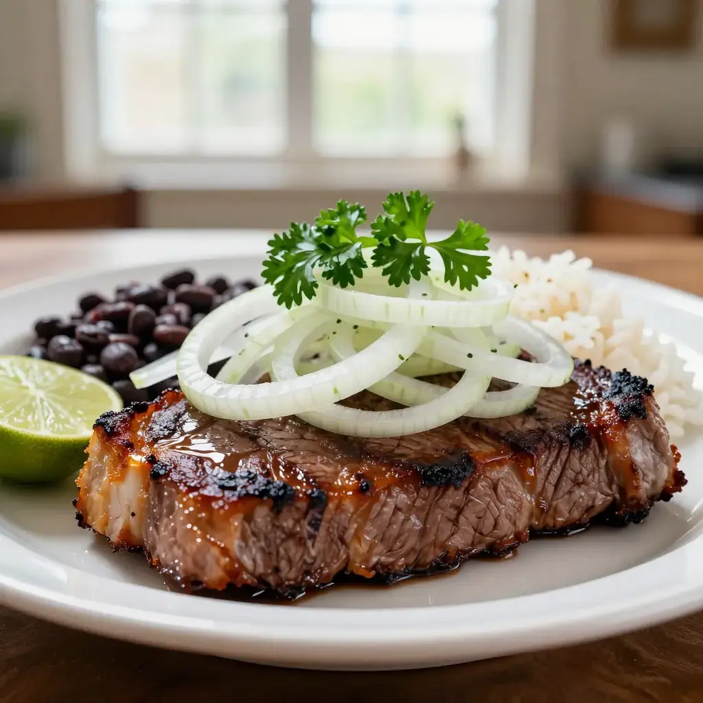 Bistec de palomilla is the weeknight backbone of Cuban home cooking — thin-cut beef steaks pounded almost translucently flat, marinated in sour orange juice and garlic, then pan-fried fast and fierce until the edges caramelise into crunchy golden lace. The name palomilla refers to the butterfly-thin cut of the steak (top sirloin), which cooks in under two minutes per side. On the table in Cuban households, bistec de palomilla arrives buried under raw white onion rings and a shower of fresh parsley, alongside black beans, rice, and fried plantains — a combination so foundational it has its own name: a Cuban plate.
