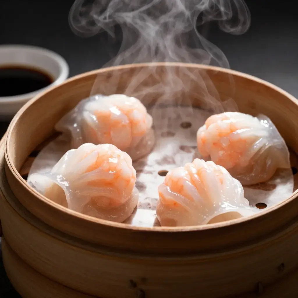 Har gow is the crown jewel of Cantonese dim sum, the dish by which dumpling masters have always been judged. The hallmark is a translucent, slightly chewy wheat-starch wrapper — pleated into at least seven precise folds — encasing a plump, springy whole-shrimp filling. Eaten fresh from bamboo steamers at weekend yum cha, it remains one of the purest pleasures of Cantonese cuisine.