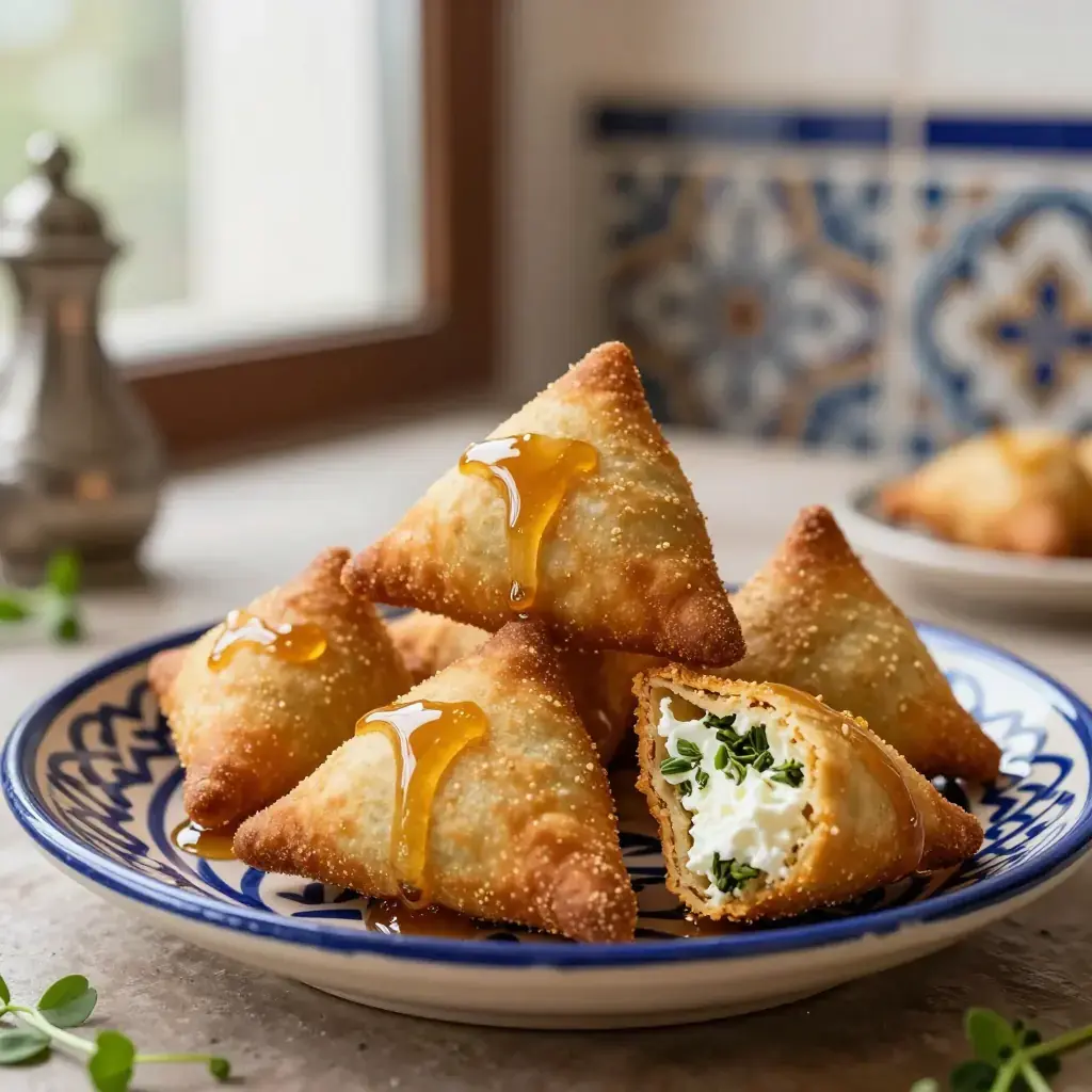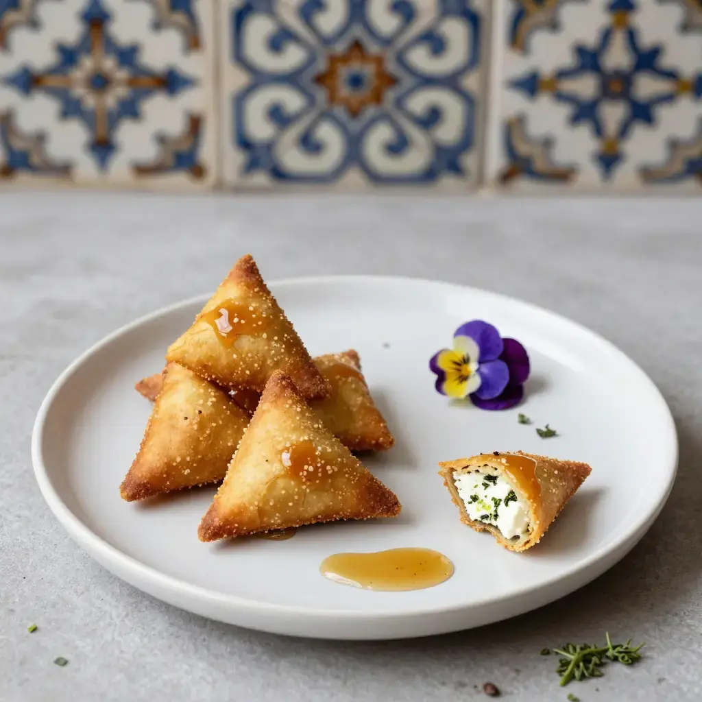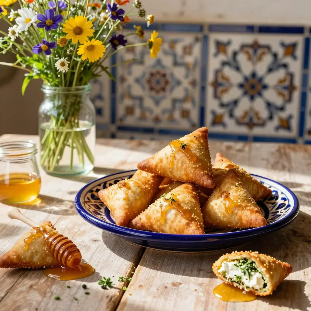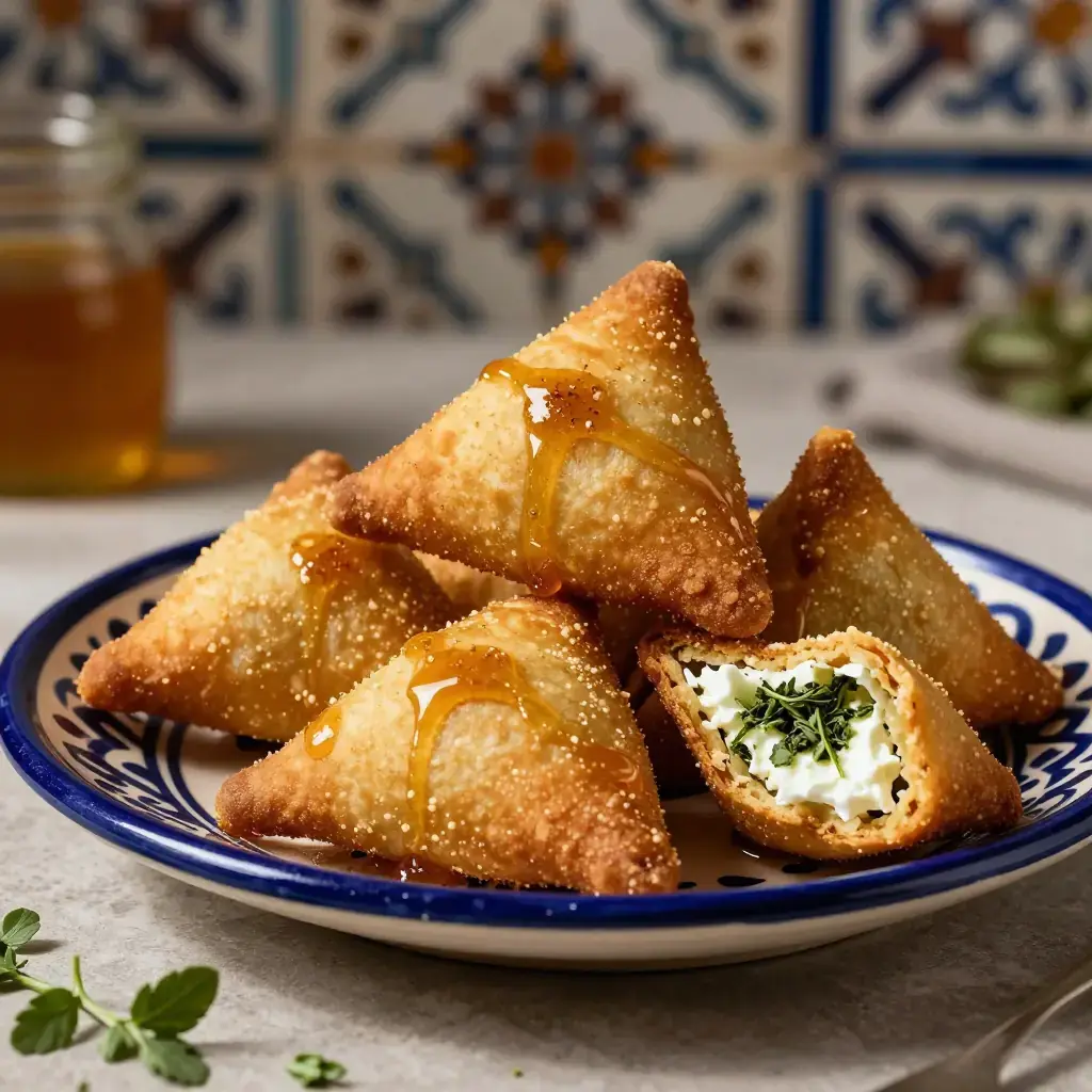 Briwat are Morocco's crispy fried pastries — delicate parcels of warqa dough folded into triangles around savory or sweet fillings and deep-fried to a shattering golden crunch. The cheese version, fragrant with fresh herbs and preserved lemon, is a staple of Moroccan wedding spreads and Ramadan iftar tables. The name comes from the Amazigh word for 'small wrapped thing,' and they are eaten piping hot with sweet mint tea.