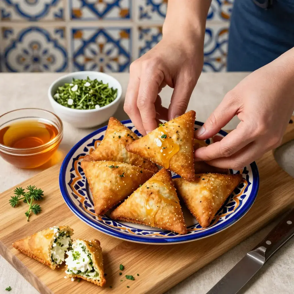 # Briwat bil Jibn Briwat are Morocco's crispy fried pastries — delicate parcels of warqa dough folded into triangles around savory or sweet fillings and deep-fried to a shattering golden crunch. The cheese version, fragrant with fresh herbs and preserved lemon, is a staple of Moroccan wedding spreads and Ramadan iftar tables. The name comes from the Amazigh word for 'small wrapped thing,' and they are eaten piping hot with sweet mint tea. Serves: 4–6 (makes about 20 pastries) ## Ingredients - 10 sheets filo pastry, each halved lengthwise into long strips - 250g (9 oz) soft fresh cheese (cream cheese, fromage frais, or young goat cheese) - 50g (1.75 oz) ricotta - ½ preserved lemon, rind only, finely diced - Large handful flat-leaf parsley, finely chopped - 2 tbsp fresh coriander, finely chopped - 1 egg, beaten (for sealing) - ½ tsp ground cumin - ¼ tsp white pepper - Neutral oil, for deep-frying - Honey, to drizzle (optional, traditional) ## Instructions 1. Mix the fresh cheese, ricotta, preserved lemon, parsley, coriander, cumin, and white pepper until well combined. Taste and season. 2. Lay a filo strip on a clean surface. Keep remaining sheets covered with a damp cloth at all times to prevent drying. Brush the strip lightly with beaten egg. 3. Place a heaped teaspoon of filling near the bottom corner. Fold the corner diagonally over the filling to form a triangle. Continue folding in triangles up the length of the strip, as you would fold a flag. Seal the final flap with beaten egg. Repeat with all remaining strips. 4. Heat oil in a deep saucepan to 170°C (340°F). Fry briwat in batches of 4–5 for 2–3 minutes per batch, turning once, until deep golden and crisp all over. 5. Remove with a slotted spoon and drain on a wire rack. Drizzle with honey while still very hot if desired — the sweet-savory contrast is traditional in Fes and Meknes. 6. Serve immediately; briwat are best within 10 minutes of frying. **Cook's Notes:** Work quickly with filo — it dries and cracks within seconds of exposure to air. Uncooked briwat freeze excellently; lay flat on a tray until firm, then bag and store for up to 2 months. Fry directly from frozen, adding 2 minutes to the cooking time.Images