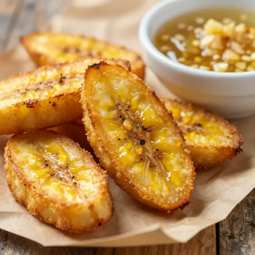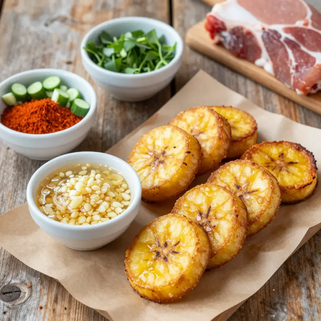 Cook's Notes: Green (not yellow or black) plantains are essential — ripe plantains are sweet and will not crisp. The double-fry is not optional: the first fry cooks the starch through, the second fry builds the crust. Soaking the smashed rounds in salted water seasons the interior and creates steam for a slightly fluffy center.