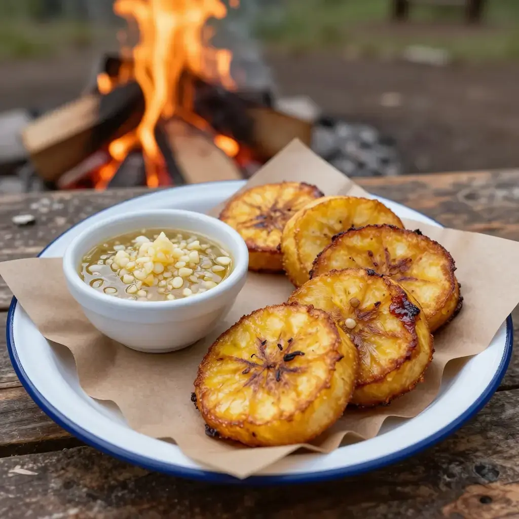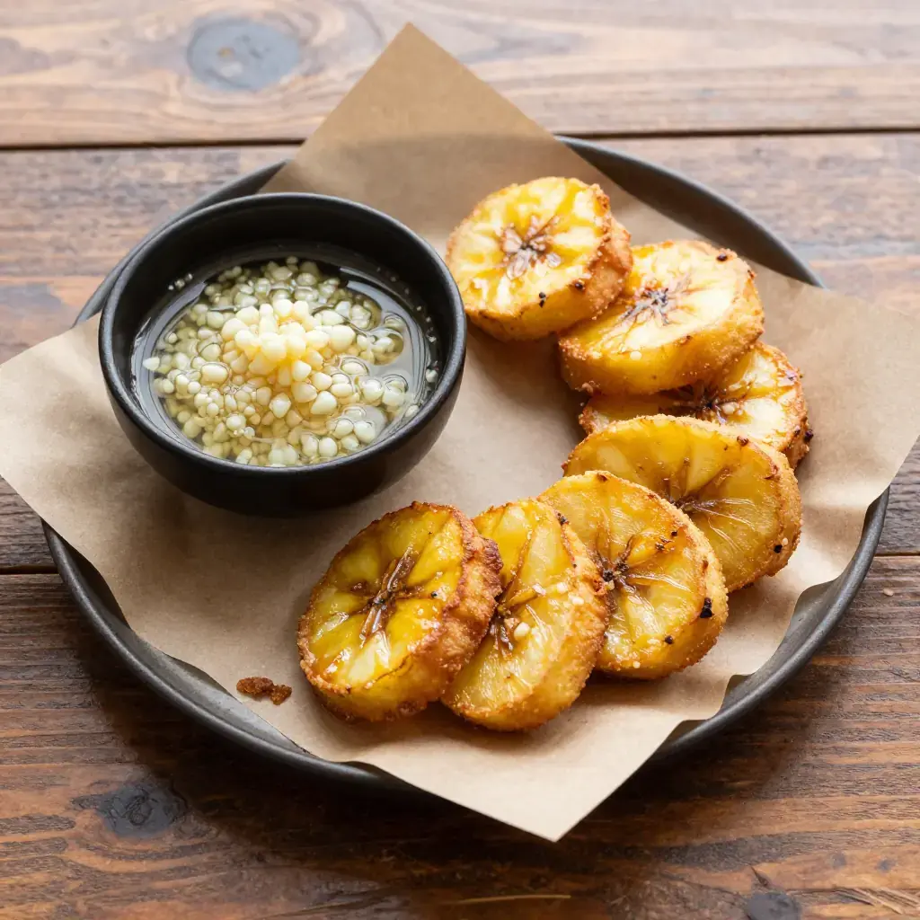 Tostones are the irreplaceable Cuban and Caribbean staple — green plantains fried, smashed flat, and fried again until each round is shatteringly crisp outside and starchy-tender within. They accompany virtually every Cuban main course: alongside ropa vieja, black beans, or simply with garlic mojo sauce. The name derives from the Spanish tostar, to toast or fry, and the double-fry technique is an essential Caribbean kitchen art.