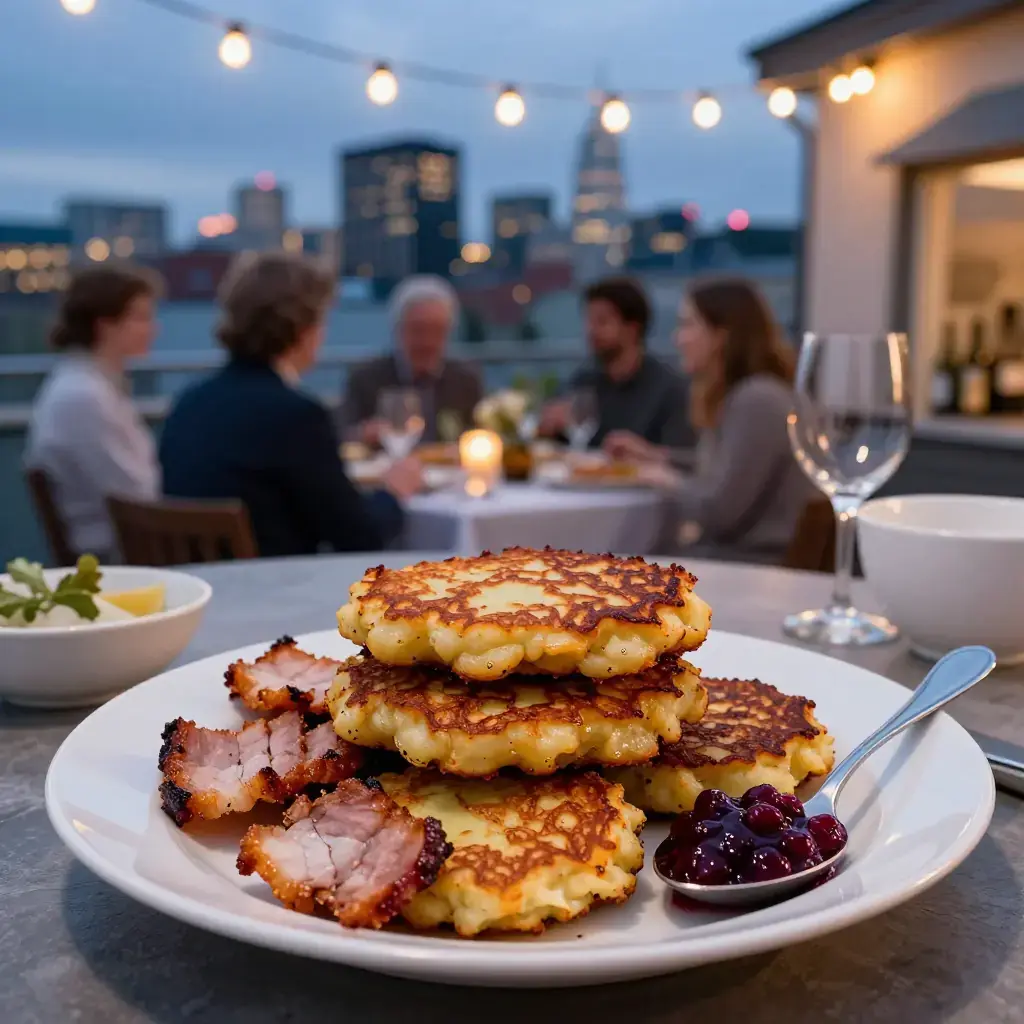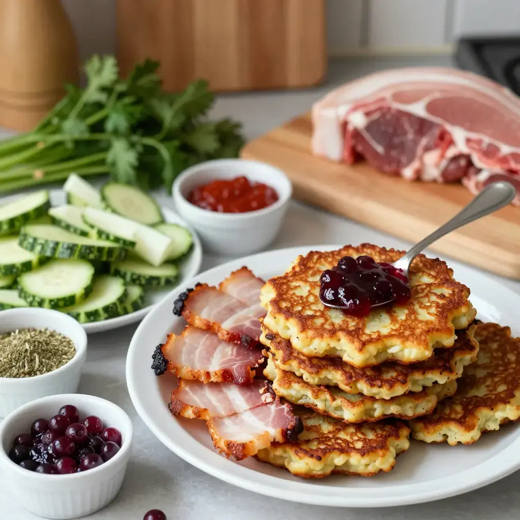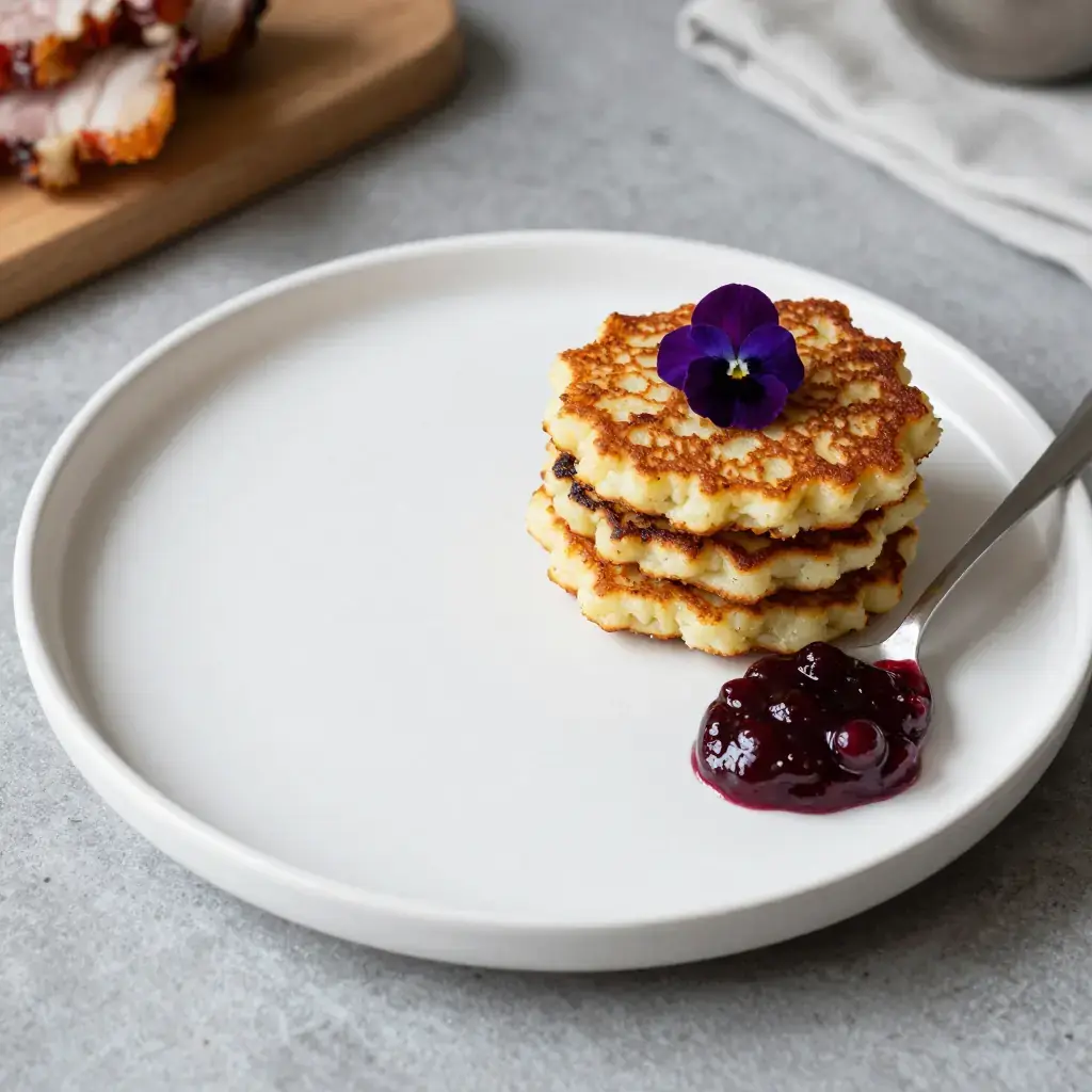 Raggmunk is an old Swedish farmhouse staple — grated potato pancakes fried golden in butter and served with crisp strips of smoked pork belly (rimmat sidfläsk) and lingonberry jam. The name likely derives from 'raggig' (rough) and 'munk' (monk's bread), referencing the rustic, uneven texture.