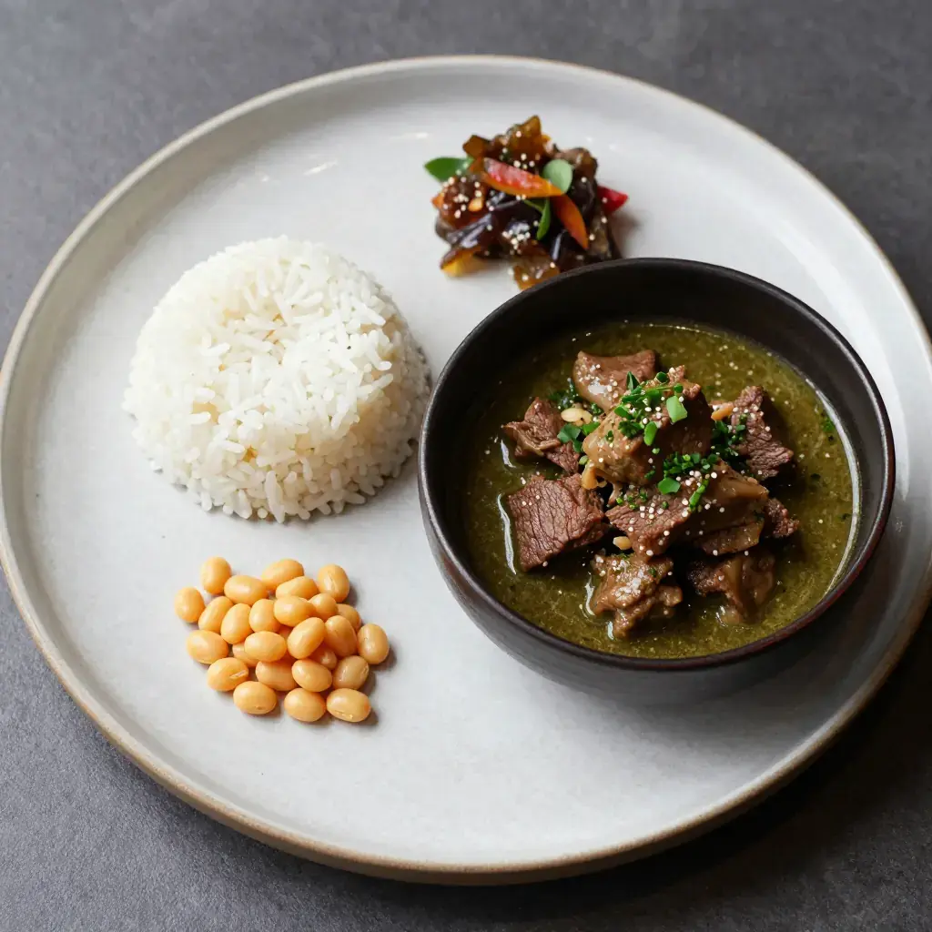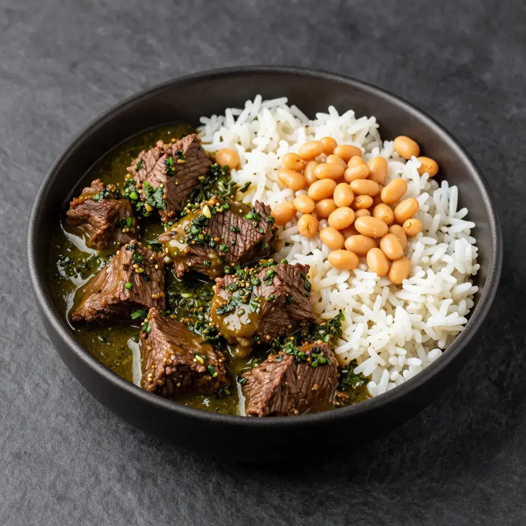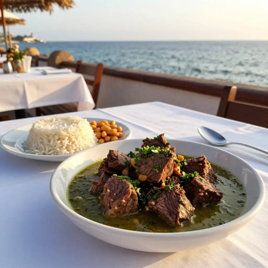 # Seco de Res Seco is a term describing a paradox in Peruvian cooking: the word means 'dry,' yet it refers to a richly sauced braise. Seco de res — beef braised with chicha de jora (fermented corn beer), ají amarillo, and a vivid herb paste of coriander and parsley — is a staple of Lima's picanterías and home kitchens alike, always served alongside canary beans and white rice. Serves: 4 ## Ingredients **Beef** - 800g (1.75 lb) beef chuck or brisket, cut into 5cm (2 in) cubes - Salt and black pepper - 3 tbsp (45ml) vegetable oil **Sauce** - 2 large red onions, finely diced - 4 garlic cloves, minced - 2 ají amarillo (fresh or paste, 3 tbsp if paste) - 200ml (¾ cup) chicha de jora or light beer - 200ml (¾ cup) beef stock - 1 large bunch fresh coriander (cilantro) - ½ bunch flat-leaf parsley - 1 tsp ground cumin - 1 tsp dried oregano **To serve** - 400g (14 oz) cooked canary beans (frijoles canarios) or butter beans - Steamed white rice ## Instructions 1. Season beef with salt and pepper. Heat oil in a heavy casserole over high heat and sear the beef in batches for 3-4 minutes per side until deeply browned. Set aside. 2. Reduce heat to medium. Sauté onion in the same pot for 8 minutes until soft. Add garlic and ají amarillo paste and cook 3 minutes. 3. Blend coriander and parsley with 100ml (⅓ cup) water to a smooth green paste. Add to the pot and cook 5 minutes, stirring, until the herb paste darkens slightly and loses its raw flavour. 4. Return beef to the pot. Pour in chicha or beer and stock. Stir in cumin and oregano. 5. Cover and braise over low heat for 1.5-2 hours until the beef is tender and the sauce has thickened. Check and stir every 30 minutes. 6. Season and serve over white rice with canary beans alongside. **Cook's Notes:** Chicha de jora (fermented corn beer) adds a subtle sourness that brightens the braise; light lager is a workable substitute. Canary beans — frijoles canarios — are mild, creamy, and traditional; substitute butter beans if unavailable. The herb paste should be vibrant green going in; it will turn olive in the pot.Images