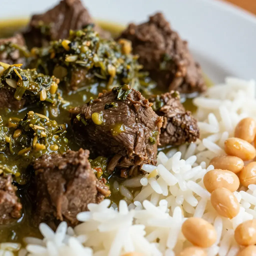 Cook's Notes: Chicha de jora (fermented corn beer) adds a subtle sourness that brightens the braise; light lager is a workable substitute. Canary beans — frijoles canarios — are mild, creamy, and traditional; substitute butter beans if unavailable. The herb paste should be vibrant green going in; it will turn olive in the pot.