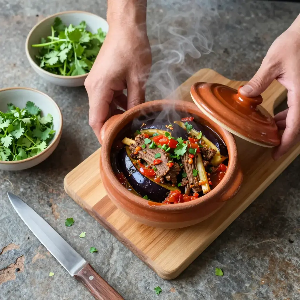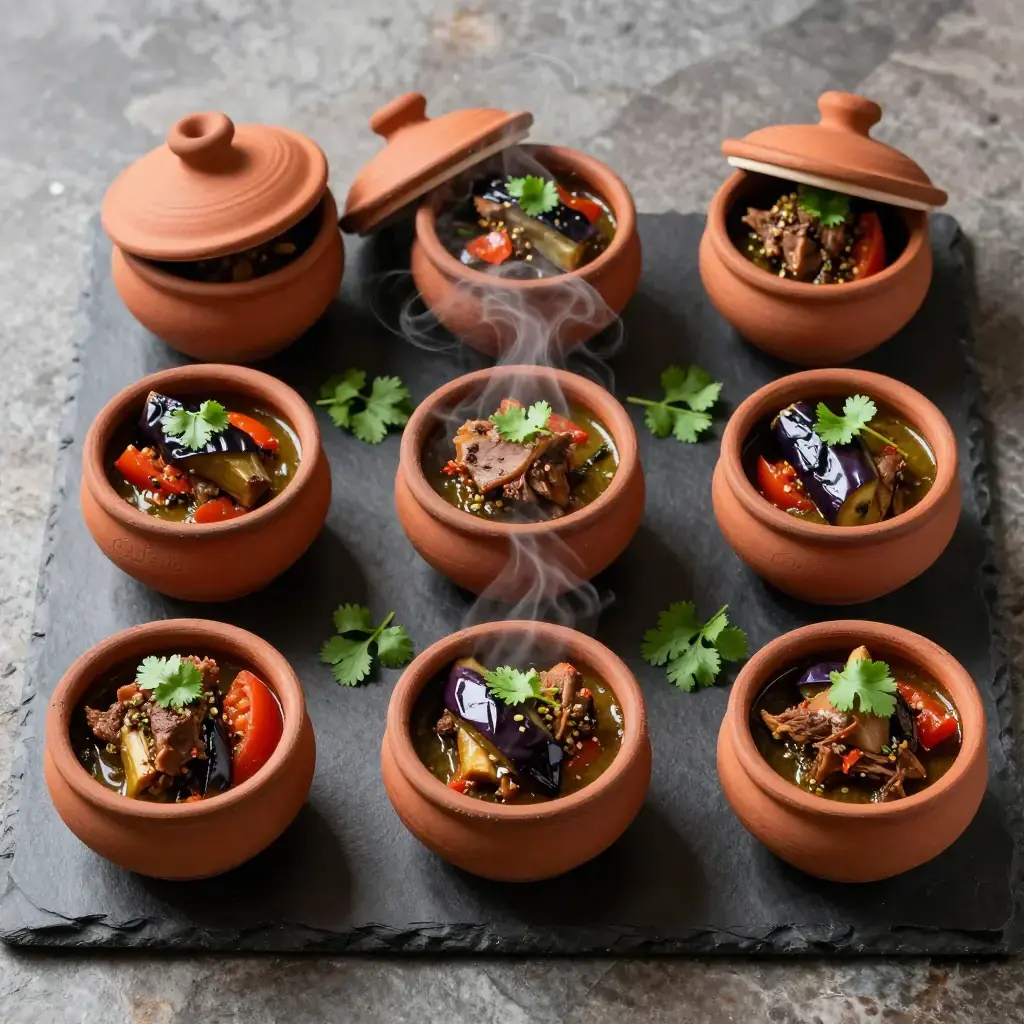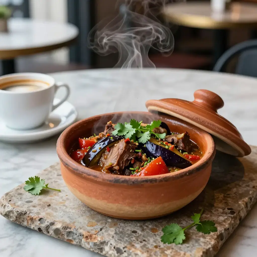 Chanakhi is a slow-baked Georgian clay-pot stew from the eastern region of Kakheti — layers of lamb, aubergine, tomato, potato, and green pepper sealed in individual earthenware pots and baked until everything melts together into an impossibly fragrant, self-saucing dish. Each diner receives their own pot, brought straight from the oven to the table, the lid lifted to release a cloud of steam heavy with coriander and garlic.