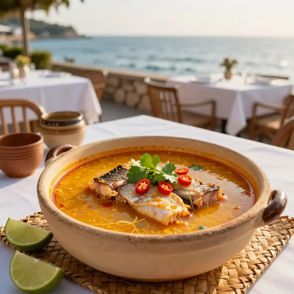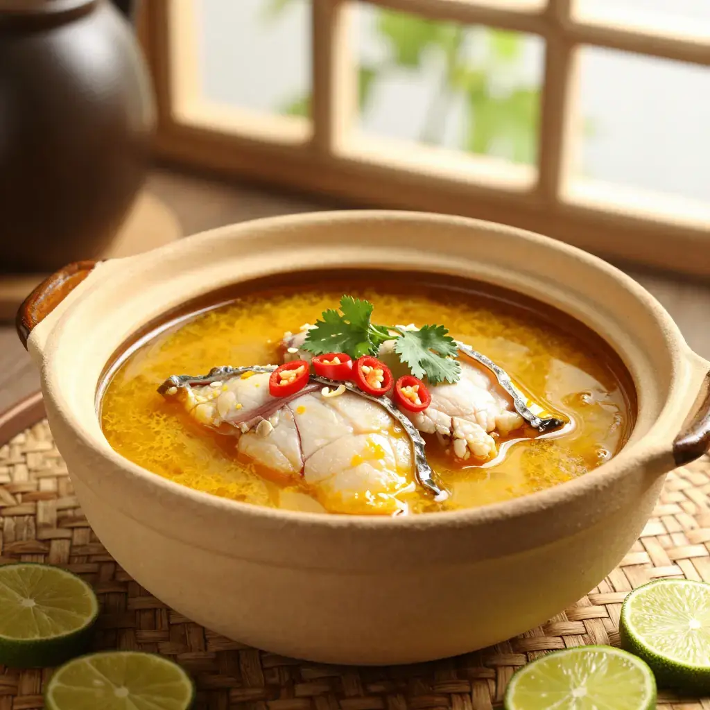 # Yunnan Suan Tang Yu Suan tang yu — sour broth fish — is a dish beloved across Southwest China but finds one of its most aromatic forms in Yunnan, where it is flavoured with fermented tomatoes, wild sour herbs, and the region's distinctive dried chillies. The broth is a bright, golden-red soup with a clean acidity that comes from fermented ingredients rather than vinegar, which makes it refreshing rather than sharp. Whole freshwater fish, typically grass carp or tilapia, are simmered directly in the broth at the table. Serves: 4 ## Ingredients - 1 whole grass carp or tilapia (800 g–1 kg / 1.7–2.2 lb), cleaned and cut into thick steaks - 3 tbsp (45 ml) neutral oil - 200 g (7 oz) fermented tomatoes (or 4 ripe tomatoes, roughly chopped, plus 1 tbsp rice vinegar) - 3 dried red chillies - 4 slices fresh ginger - 4 cloves garlic, smashed - 2 stalks lemongrass, bruised - 1.5 litres (6 cups) water or light fish stock - 1 tsp (5 g) turmeric powder - 2 spring onions, cut into lengths - 1 handful fresh coriander - 1 tbsp (15 ml) fish sauce - Salt to taste - Fresh chilli and lime wedges, for serving ## Instructions 1. Heat oil in a large clay pot or heavy pot over medium heat. Fry the ginger, garlic, dried chillies, and lemongrass for 1 minute until fragrant. 2. Add the fermented tomatoes (or fresh tomatoes) and cook, crushing them with a spoon, for 5 minutes until they break down and release their liquid. 3. Pour in the water or fish stock. Add turmeric and bring to a boil. 4. Simmer uncovered for 15 minutes to develop the broth. Season with fish sauce and salt. 5. Add the fish steaks and cook over medium heat for 8–10 minutes until the fish is just cooked through — the flesh should flake easily from the bone and be opaque throughout. 6. Add the spring onions in the final 2 minutes. 7. Serve directly from the pot, topped with fresh coriander, sliced chilli, and lime wedges on the side. **Cook's Notes:** Fermented tomatoes (sui qie zi) are available in Yunnan ingredient shops and some Asian grocers — they give an irreplaceable depth of sour flavour. If unavailable, the rice vinegar substitute works well. Do not overcook the fish; it will continue cooking in the hot broth at the table.Images