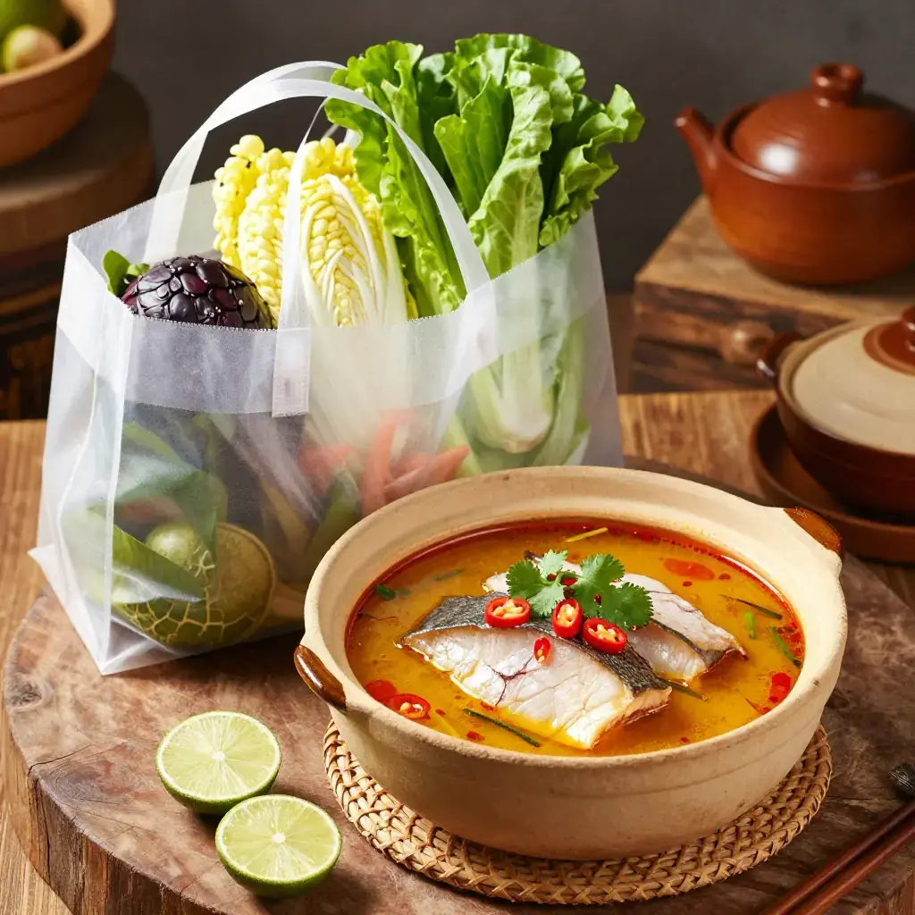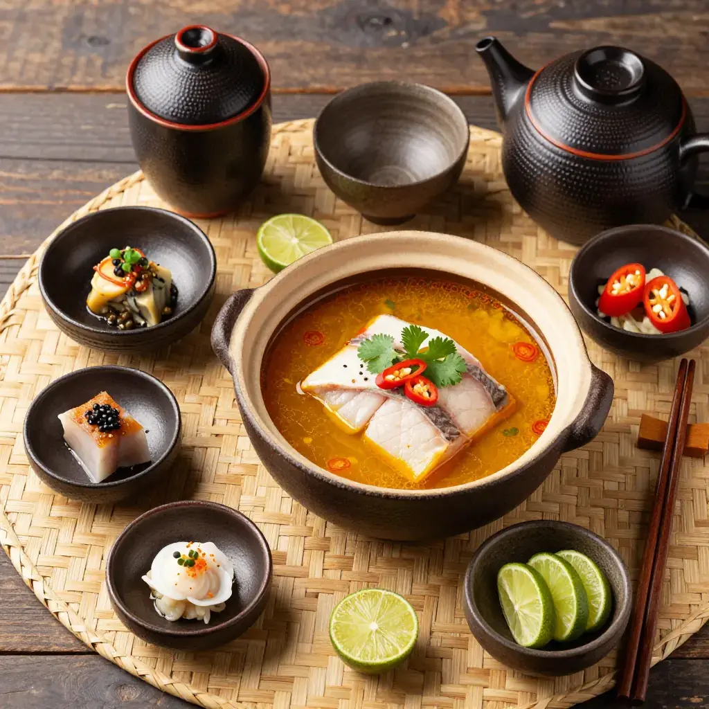 Cook's Notes: Fermented tomatoes (sui qie zi) are available in Yunnan ingredient shops and some Asian grocers — they give an irreplaceable depth of sour flavour. If unavailable, the rice vinegar substitute works well. Do not overcook the fish; it will continue cooking in the hot broth at the table.