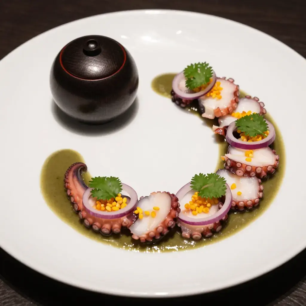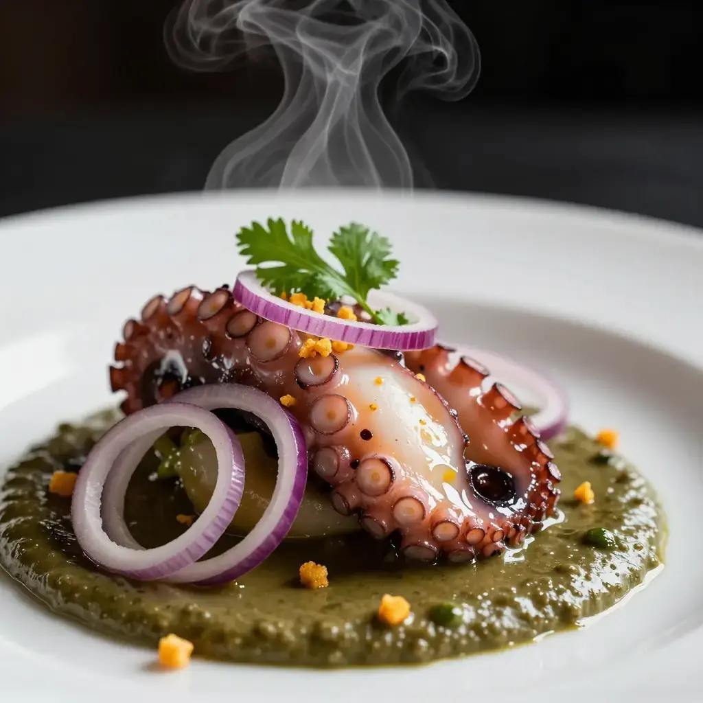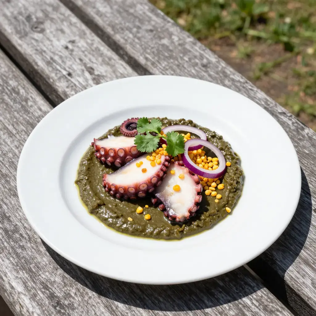 # Pulpo al Olivo Pulpo al Olivo is one of the signature creations of Nikkei cuisine — the thrilling fusion of Japanese and Peruvian traditions that emerged in Lima in the twentieth century. Perfectly tender octopus tentacles are served cold over a velvety black olive mayonnaise (crema de aceitunas), a combination that sounds unexpected and tastes inevitable. It appears on every serious Lima restaurant menu and at dinner parties where the host wants to astonish. Serves: 4 ## Ingredients **Octopus** - 1 whole octopus, about 1.2 kg (2 lb 10 oz), cleaned - 1 onion, halved - 1 bay leaf - 1 tsp (4g) black peppercorns - 1 cork (traditional Peruvian tenderising trick — optional but beloved) **Crema de Aceitunas** - 150g (5 oz) pitted black botija olives (or good Kalamata olives) - 2 egg yolks - 1 tsp (5ml) Dijon mustard - 200ml (¾ cup) neutral vegetable oil - 1 tbsp (15ml) fresh lime juice - Salt to taste **To Serve** - Thinly sliced red onion - Fresh coriander (cilantro) leaves - Lime wedges - Crushed toasted corn (cancha) ## Instructions 1. Bring a large pot of water to a boil with the onion, bay leaf, peppercorns, and cork if using. Lower the octopus in by its head, dip the tentacles three times to curl them, then fully submerge. Cook at a gentle simmer for 40–50 minutes until a skewer passes through the thickest part of a tentacle without resistance. 2. Remove and cool completely. Refrigerate until cold, at least 1 hour. 3. Make the crema: blend the olives to a smooth paste. In a separate bowl, whisk egg yolks with mustard. Drizzle in the oil very slowly, whisking constantly to form a thick mayonnaise. Fold in the olive paste and lime juice. Season with salt. 4. Slice the octopus tentacles on the diagonal into 5mm (¼ in) pieces. 5. Spread crema de aceitunas on a chilled plate. Fan the octopus slices over the sauce. Scatter red onion, coriander, and cancha. Finish with lime. **Cook's Notes:** The octopus must be completely cold before slicing — warm tentacles tear rather than cut cleanly. Botija olives from Peru have a creamier, less acidic character than Kalamata; seek them out in Latin American grocers.Images