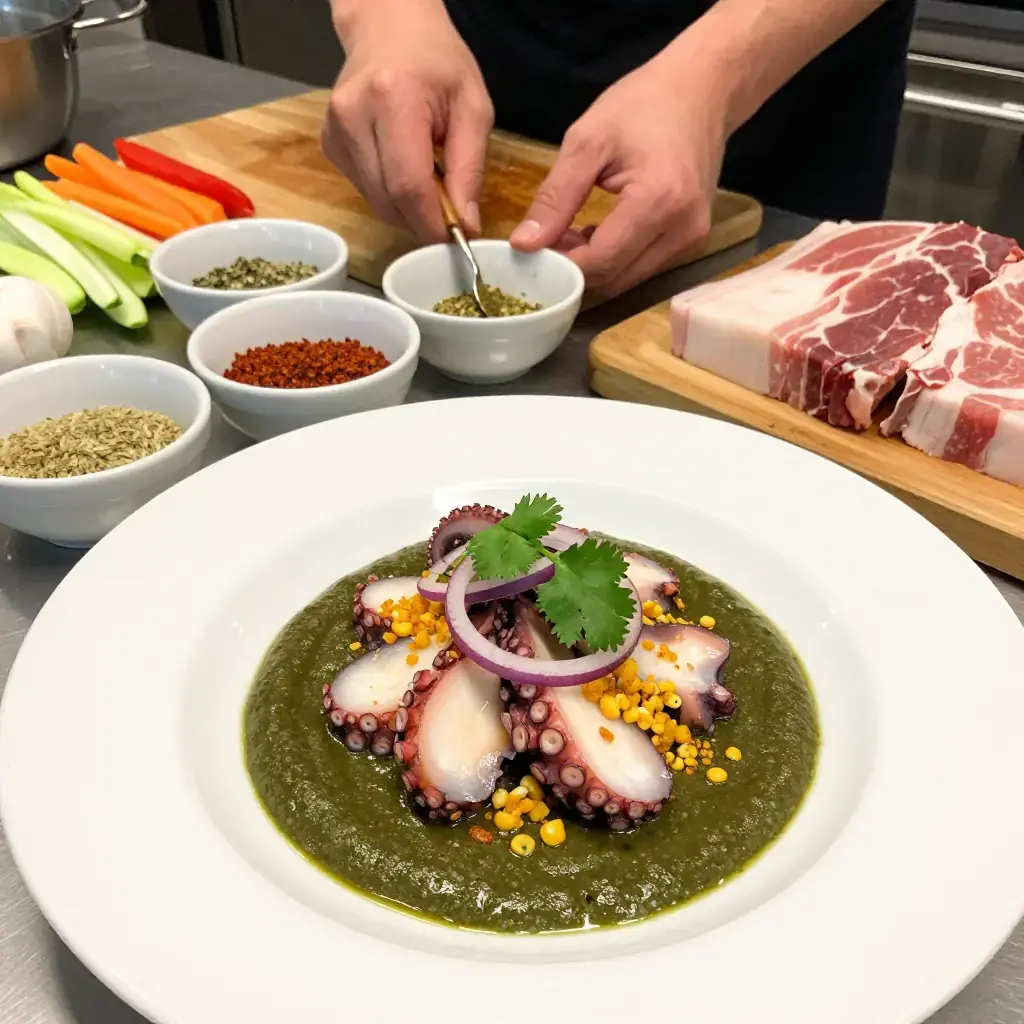 - Spread crema de aceitunas on a chilled plate. Fan the octopus slices over the sauce. Scatter red onion, coriander, and cancha. Finish with lime.