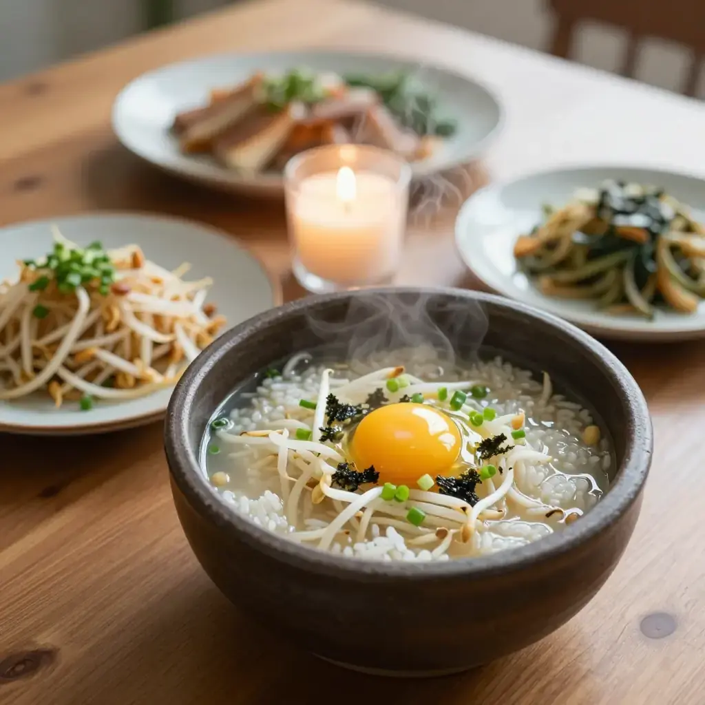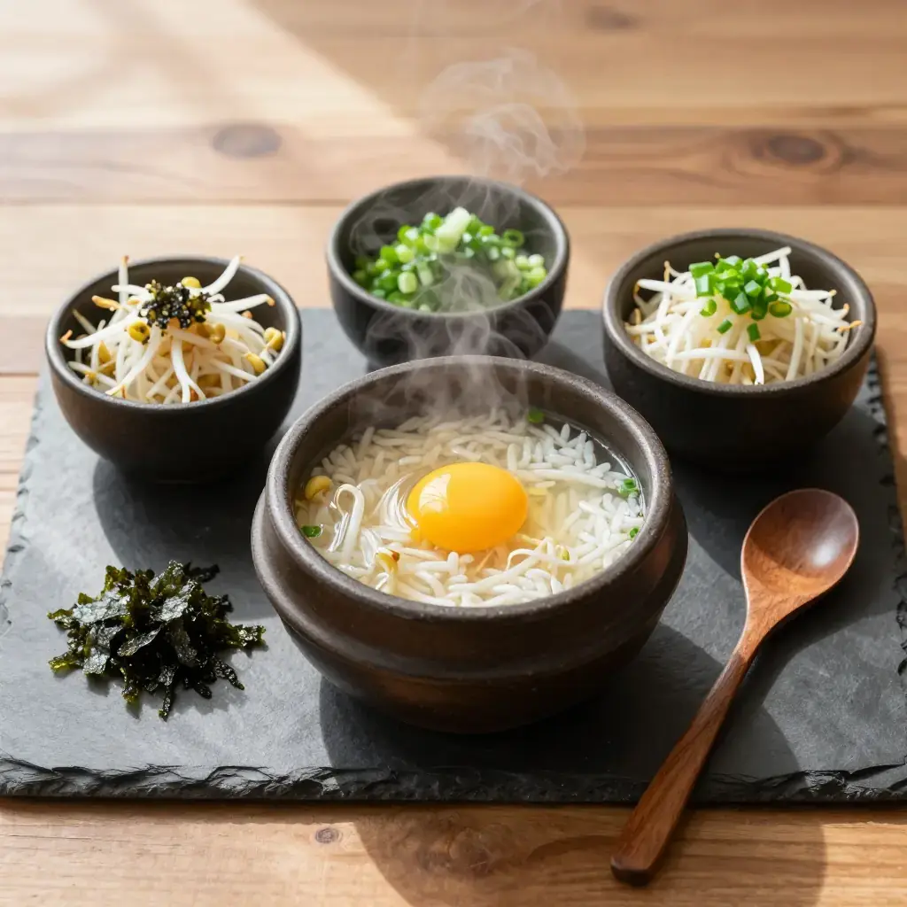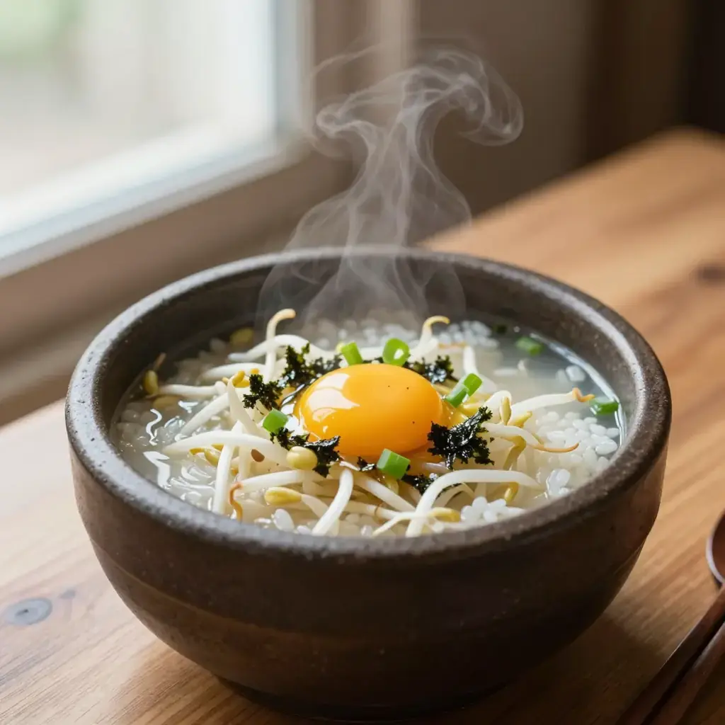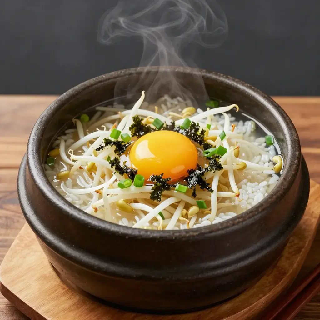Kongnamul gukbap is a beloved Jeonju-style breakfast soup where steamed rice is submerged in a peppery, doenjang-deepened bean sprout broth. Street stalls in Jeonju serve it around the clock, customarily accompanied by raw egg yolk stirred in tableside.
