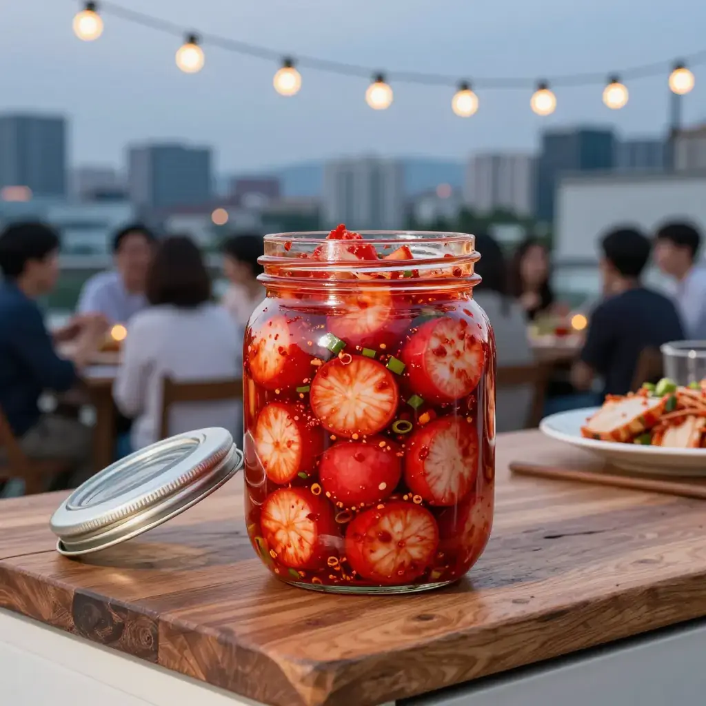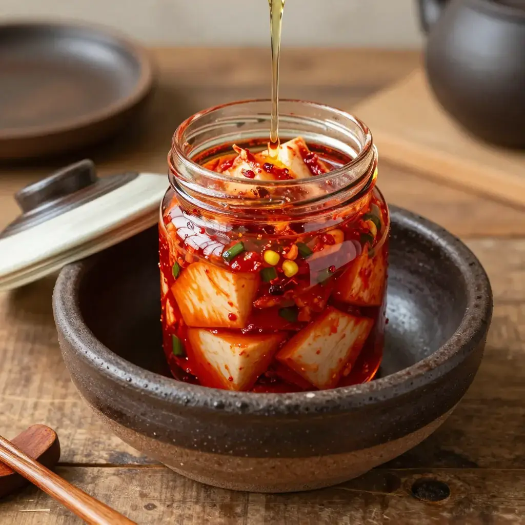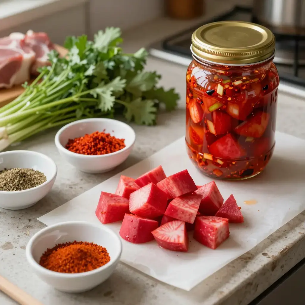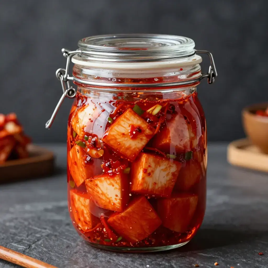 Kkakdugi is a punchy, crunchy kimchi made from Korean radish (mu) cut into bold cubes, fermented with gochugaru, fish sauce, and salted shrimp until tangy and juicy. It is a staple banchan (side dish) that improves dramatically over three to five days of fermentation at room temperature before being moved to the fridge.