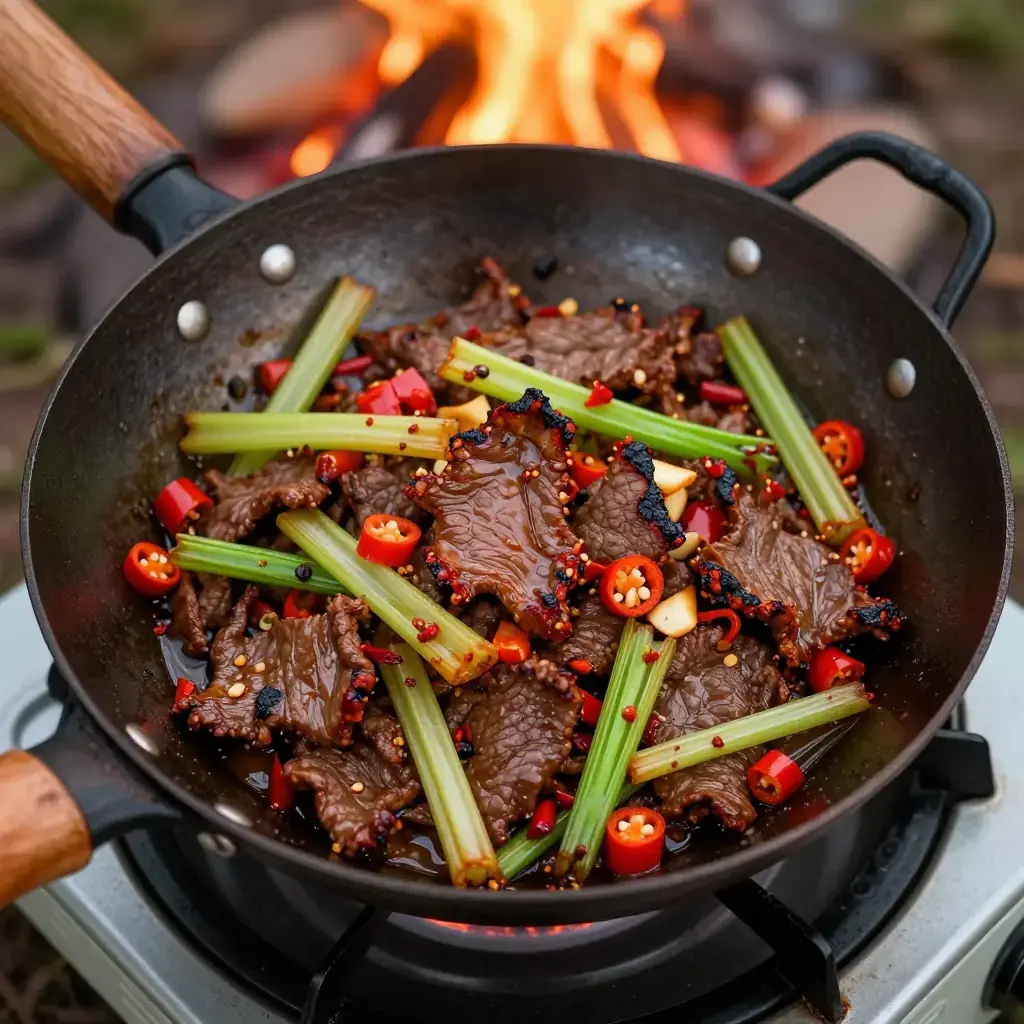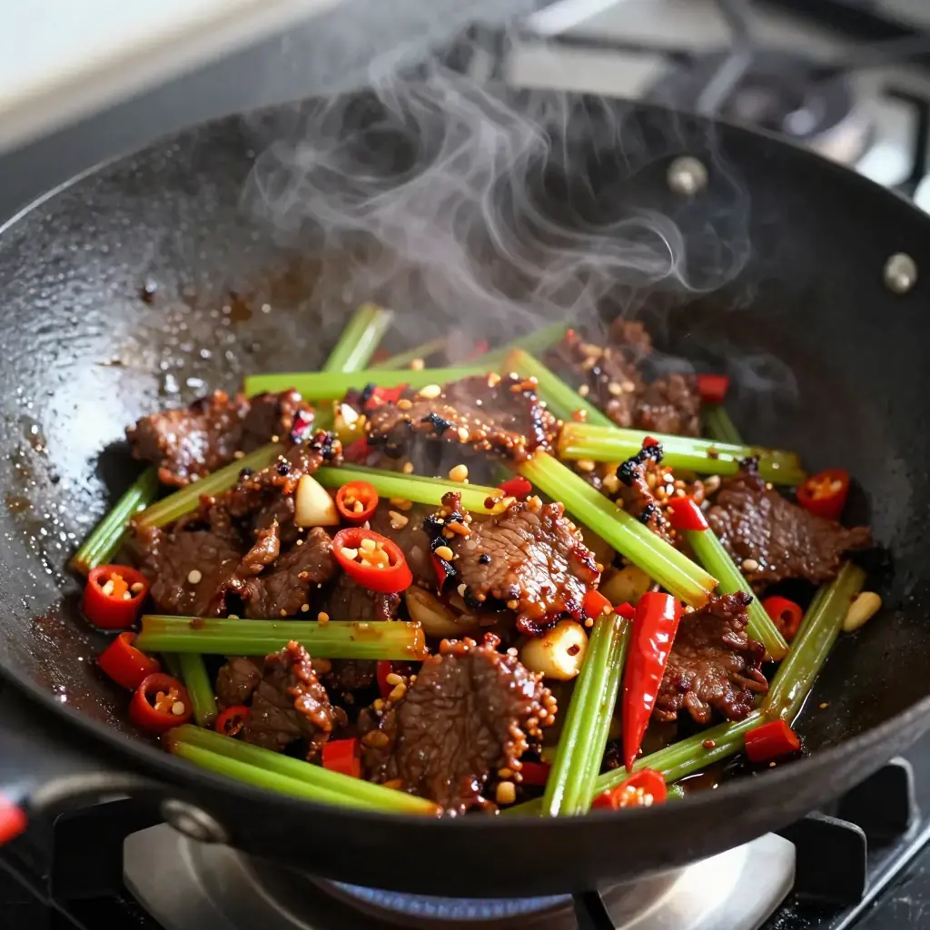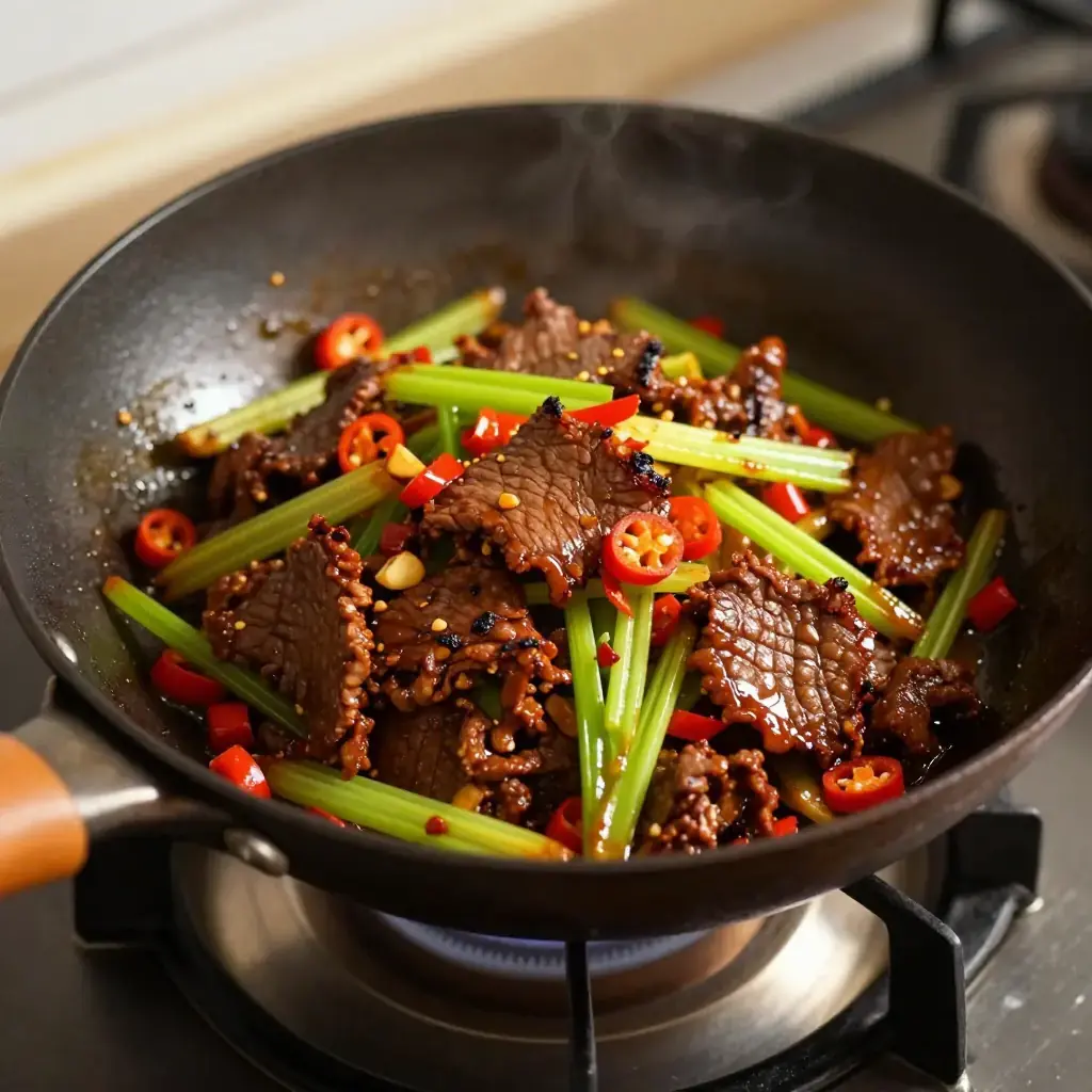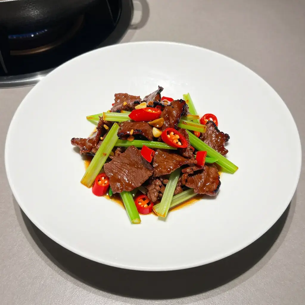 Xiao chao huang niu rou is one of Hunan's most beloved home-cook dishes, found sizzling in woks across Changsha's restaurant strips and household kitchens alike. "Yellow beef" (huang niu rou) refers to beef from yellow cattle, a native Hunan breed prized for its tenderness and flavour; the stir-fry is characterised by its combination of fresh and pickled chillies, the crunch of celery, and a finish of soybean paste that coats every strand of meat.