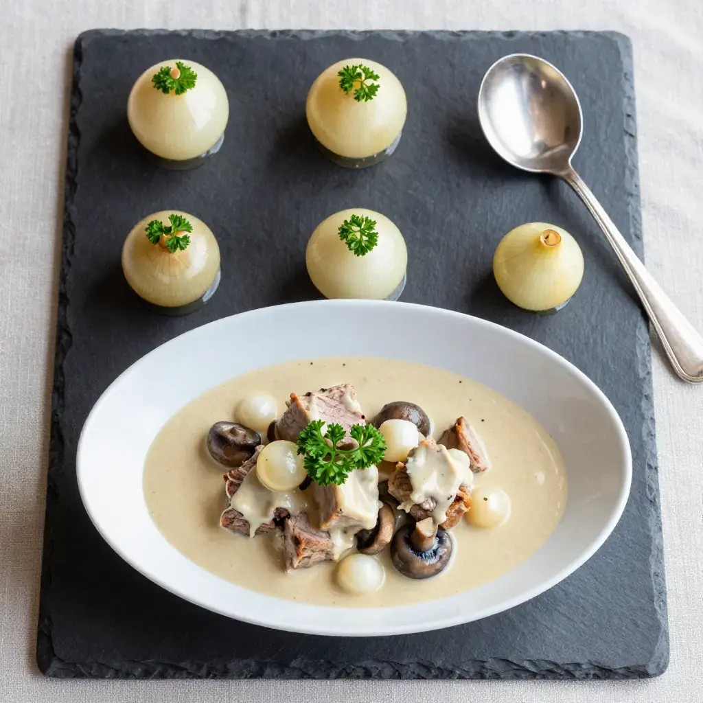 Blanquette de veau is one of the most revered dishes of the French bourgeois kitchen, appearing in Escoffier's guides and on bistro menus across France for over two centuries. Unlike most braises, the veal is never browned — it is gently poached in an aromatic white stock, then sauced with a velouté enriched with cream and egg yolks, yielding a dish of extraordinary delicacy. It is simultaneously one of the most comforting and most technically refined preparations in the classical repertoire.
