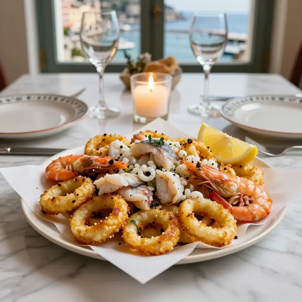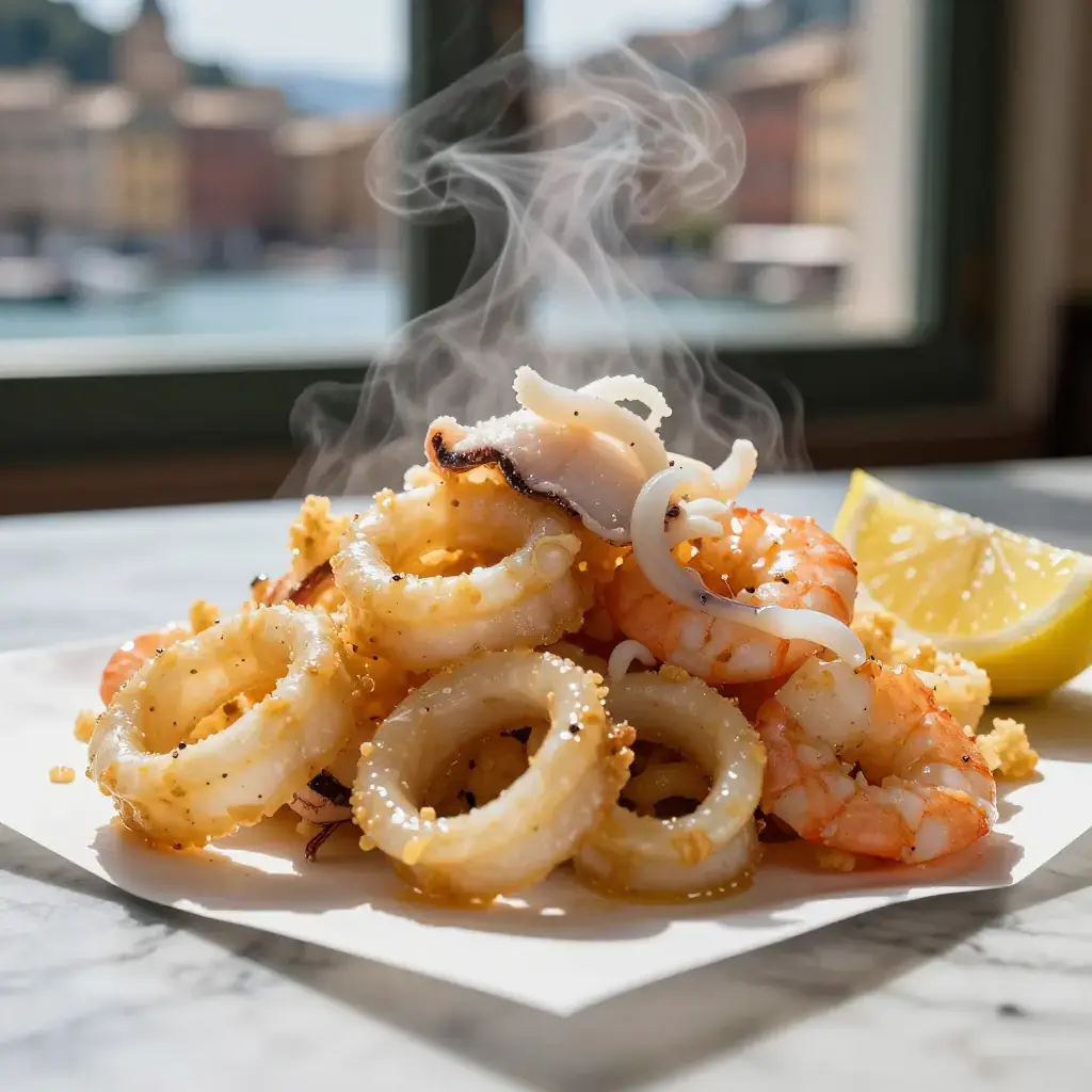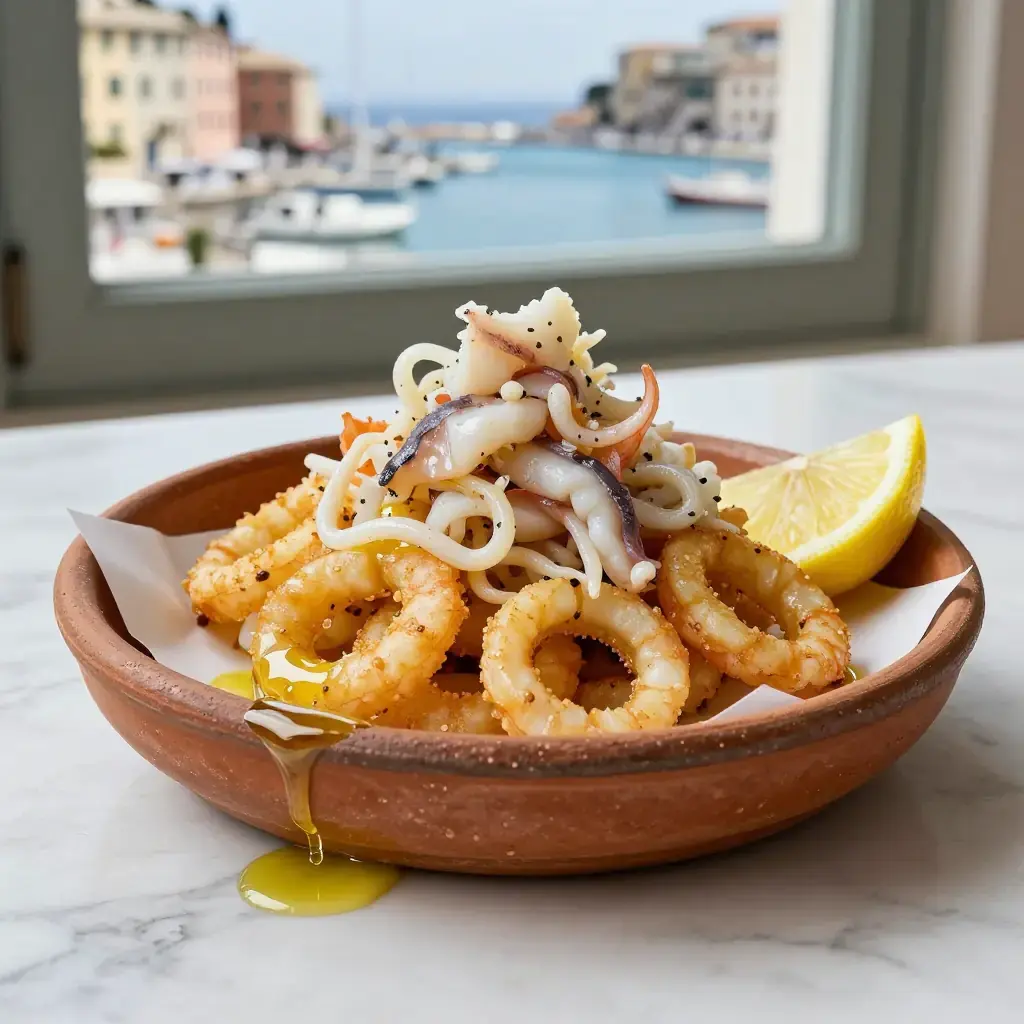 Along the Ligurian coast from Genoa to Cinque Terre, fritto misto di mare is the quintessential summer celebration dish: a heaped platter of just-fried squid, prawns, whitebait, and small fish, eaten immediately with wedges of lemon, standing up at harbour-side stalls or laid out in newspaper cones for the beach. The Ligurian style uses a very light flour-and-sparkling-water batter — sometimes just seasoned flour — so that the seafood is the star, barely enrobed and shatteringly crisp.