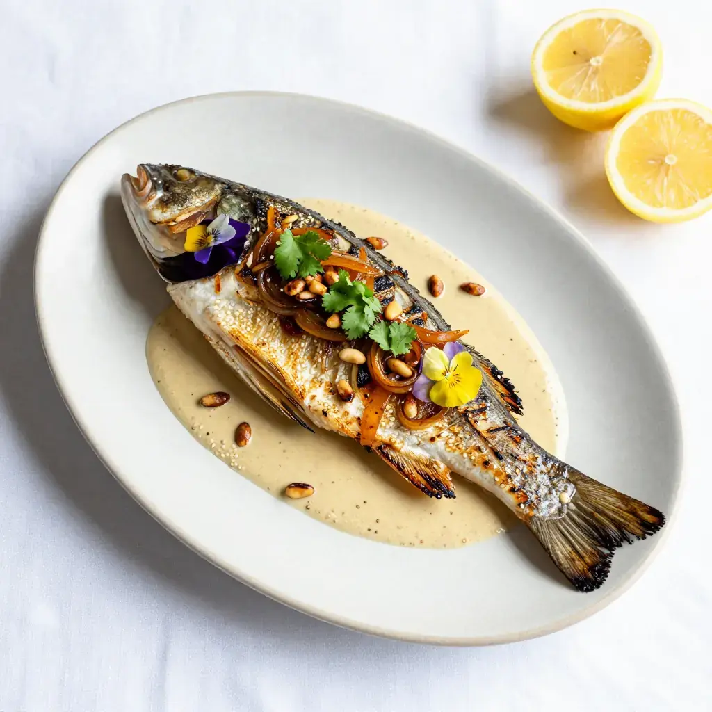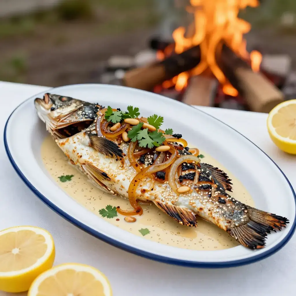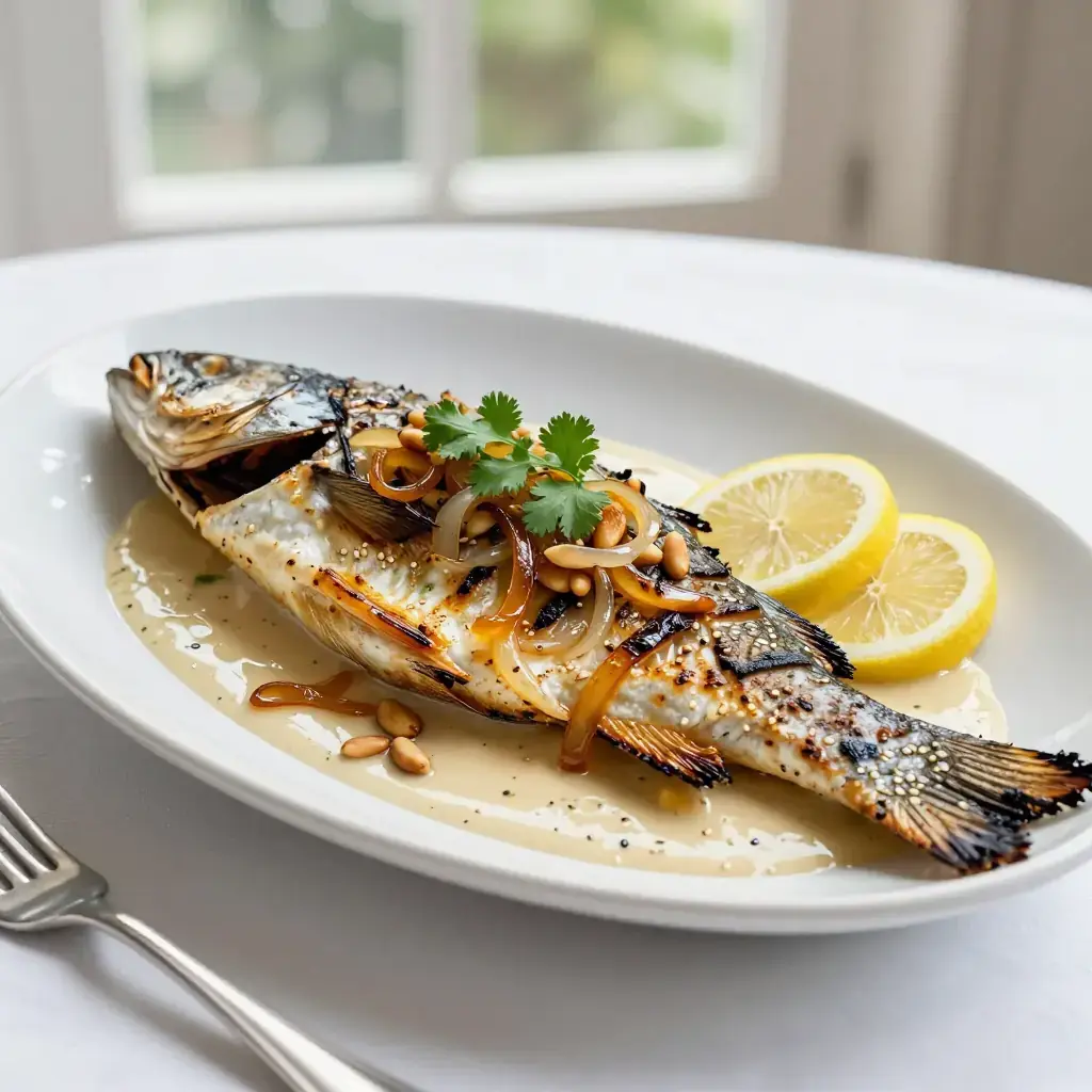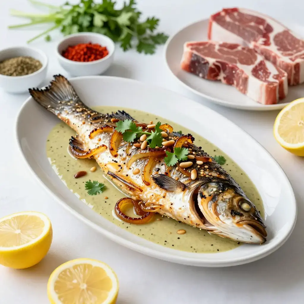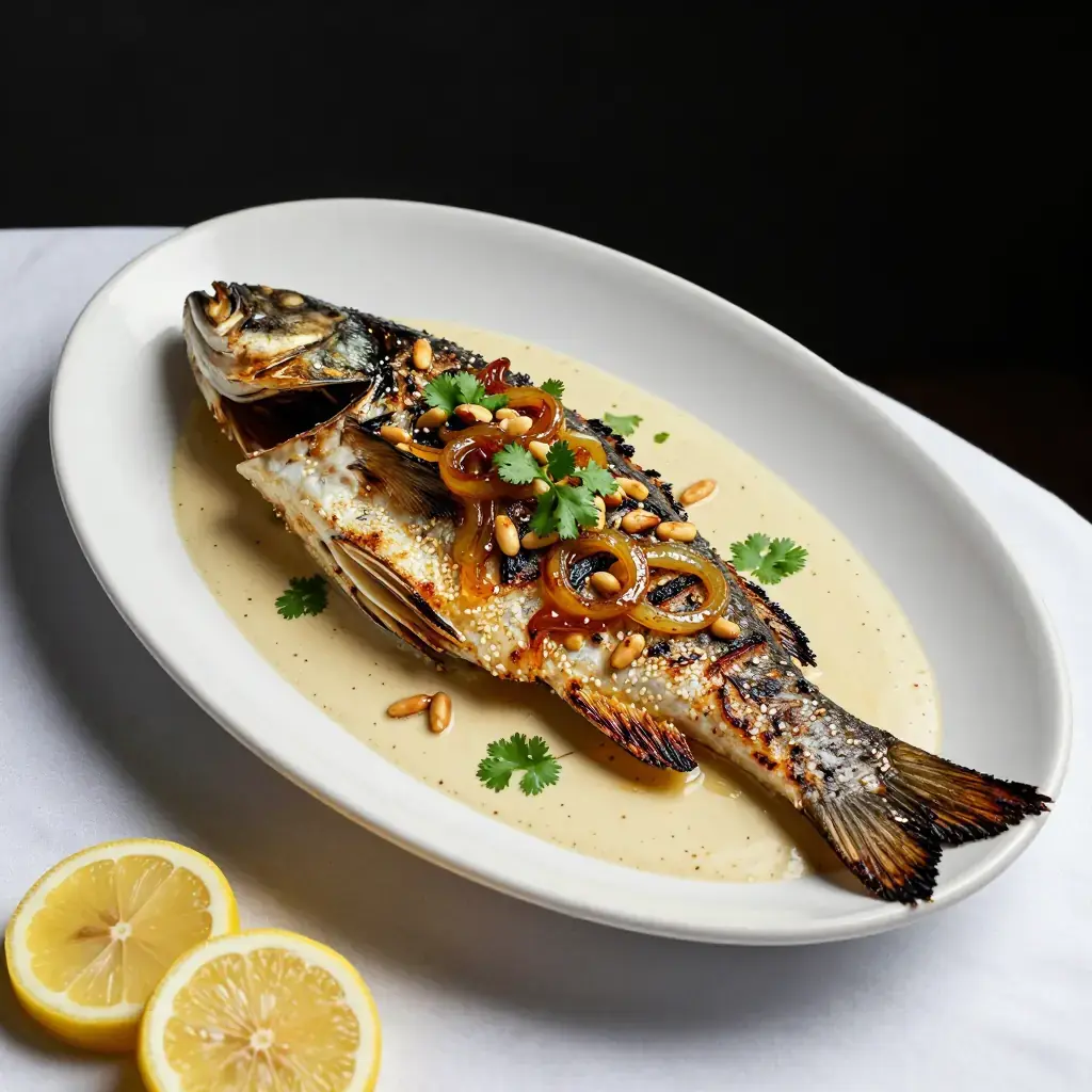 # Samke Harra bil Tahini Samke harra — "spicy fish" — is Beirut's grandest fish dish, traditionally prepared for family feasts on the Lebanese coast. A whole fish is stuffed and baked or grilled, then blanketed in a vivid tahini and caramelised onion sauce fragrant with cumin, chilli, and fresh coriander. Serves: 4 ## Ingredients **Fish** - 1 whole sea bass or sea bream, 1.2-1.5 kg (2.5-3.3 lb), cleaned and scaled - 3 tbsp (45ml) olive oil - 1 tsp cumin - 1/2 tsp coriander - 1/2 tsp chilli flakes - 1/2 tsp turmeric - 4 garlic cloves, sliced - 1 lemon, thinly sliced - Salt and black pepper **Tahini Sauce (Tarator)** - 120g (4 oz / 8 tbsp) tahini - 80ml (1/3 cup) fresh lemon juice - 120ml (1/2 cup) cold water - 2 garlic cloves, grated - Salt to taste **Caramelised Onion Topping** - 3 large onions, thinly sliced - 4 tbsp (60ml) olive oil - 1/2 tsp cumin - 1/4 tsp chilli flakes - Large handful fresh coriander (cilantro), chopped - 50g (2 oz) pine nuts, toasted ## Instructions 1. Score the fish 3-4 times on each side. Mix olive oil with spices and rub all over and into the cavity. Stuff the cavity with garlic slices and lemon slices. Season well. Marinate 30 minutes. 2. Grill over medium-high charcoal or a gas grill, or roast at 220°C (430°F), for 20-25 minutes until the skin is charred and the flesh flakes easily at the thickest point. 3. Meanwhile, cook onions in olive oil over medium-low heat, stirring frequently, for 25-30 minutes until deeply golden and jammy. Stir in cumin and chilli flakes, cook 2 more minutes. 4. Whisk tahini with lemon juice, garlic, and cold water until smooth and pourable (it will seize then loosen — keep whisking). Season with salt. 5. Transfer fish to a serving platter. Pour the tahini sauce over and around it, then spoon the caramelised onions on top. Scatter coriander and pine nuts. 6. Serve with flatbread for scooping sauce. **Cook's Notes:** The tarator sauce is also excellent on grilled vegetables or drizzled over roasted cauliflower. Use any firm white fish; snapper, tilapia, or cod fillets work well if whole fish are unavailable.Images